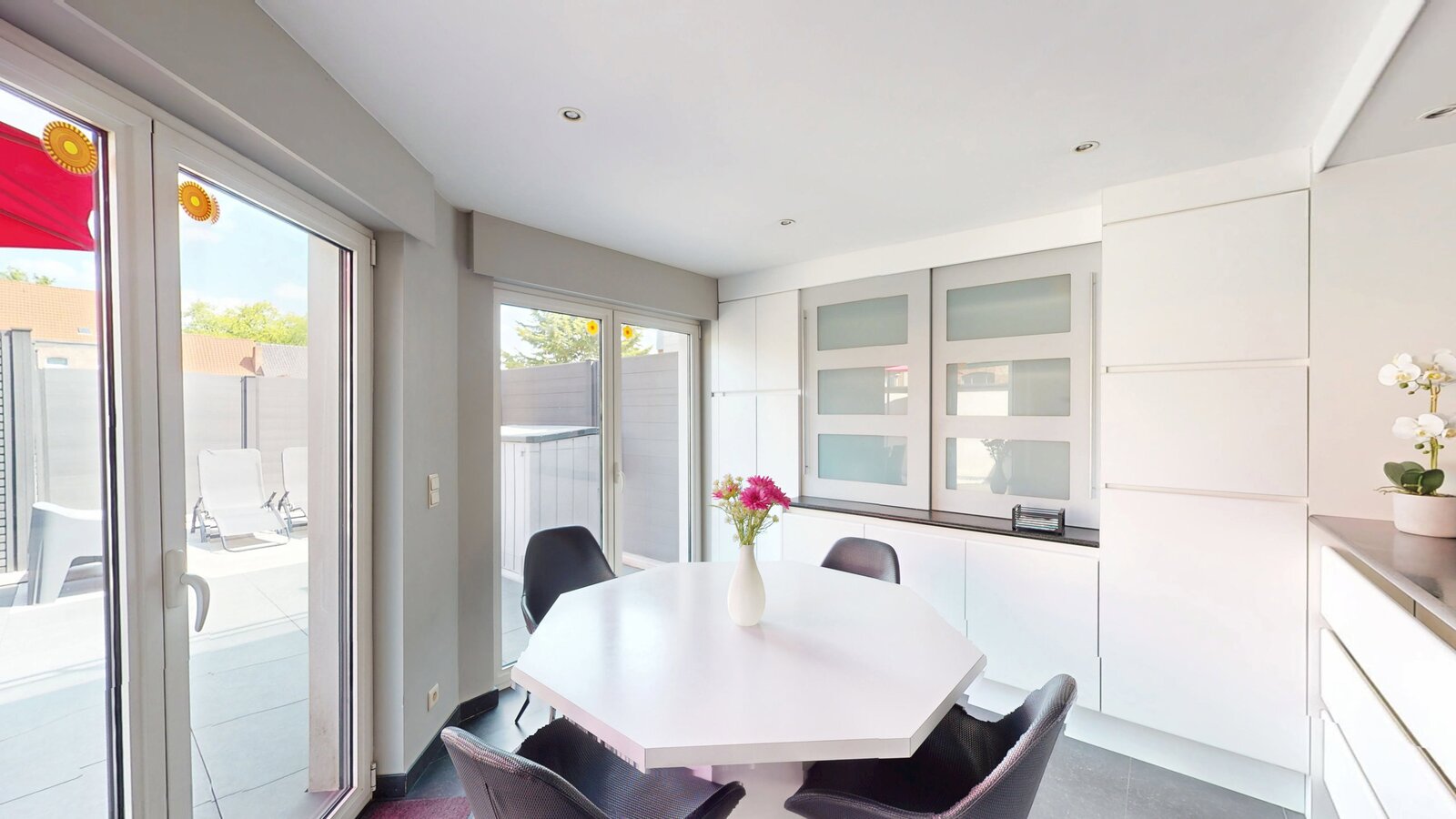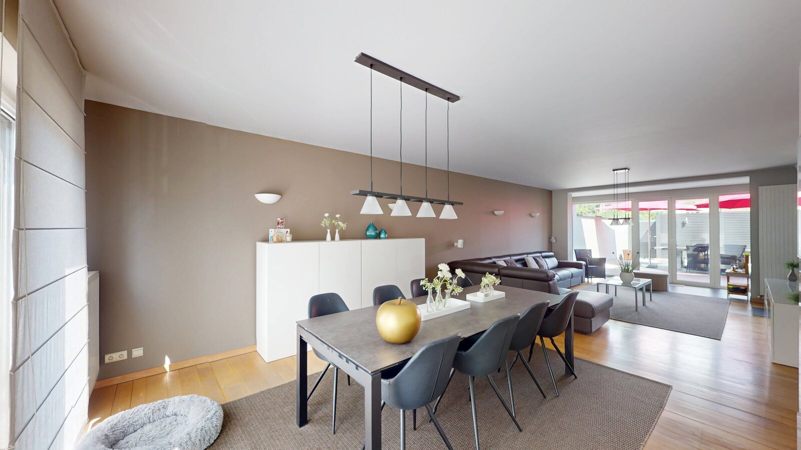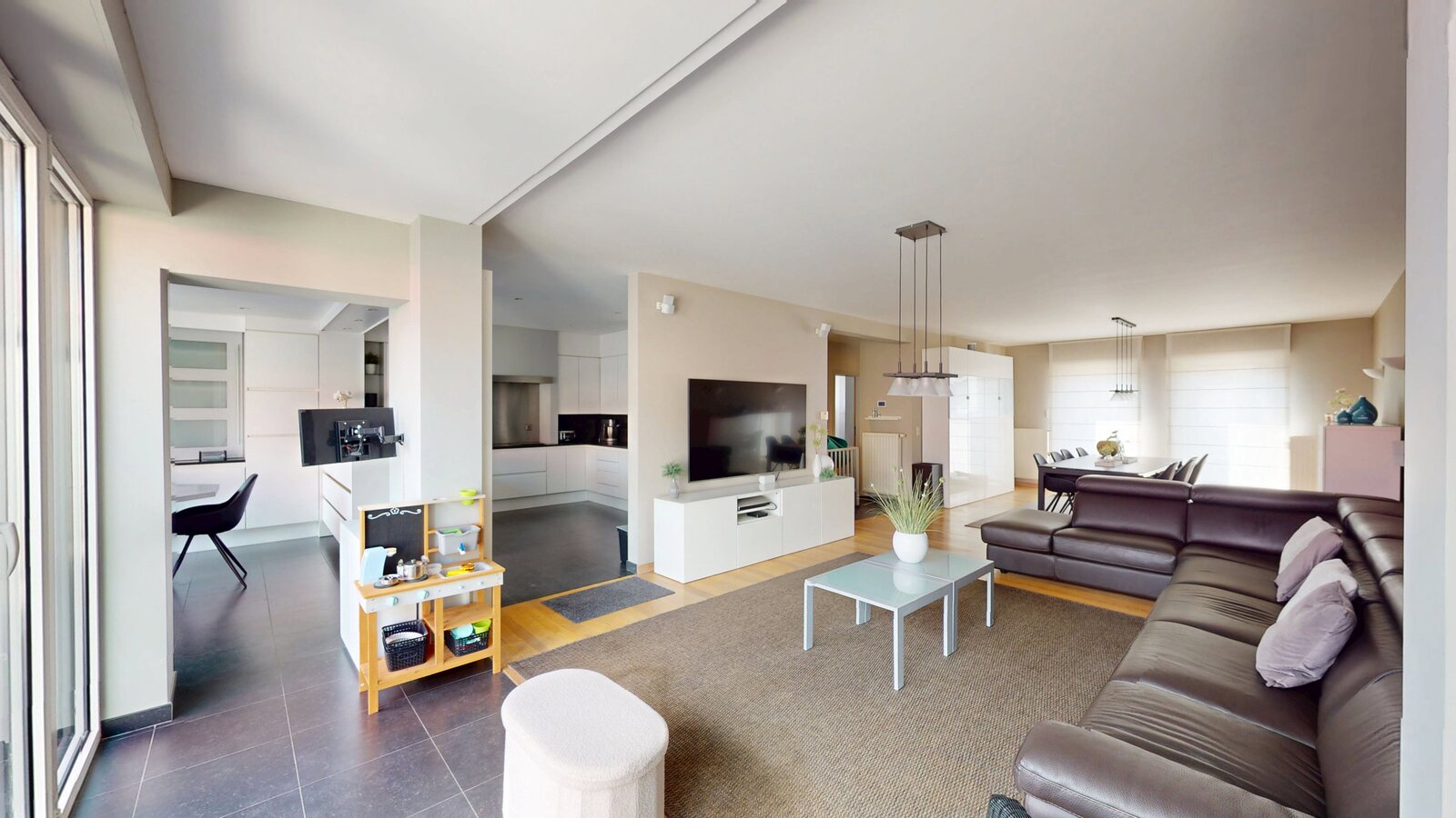 Salon-séjour lumineux avec vue sur terrasse exposée sud, menuiseries haut rendement.