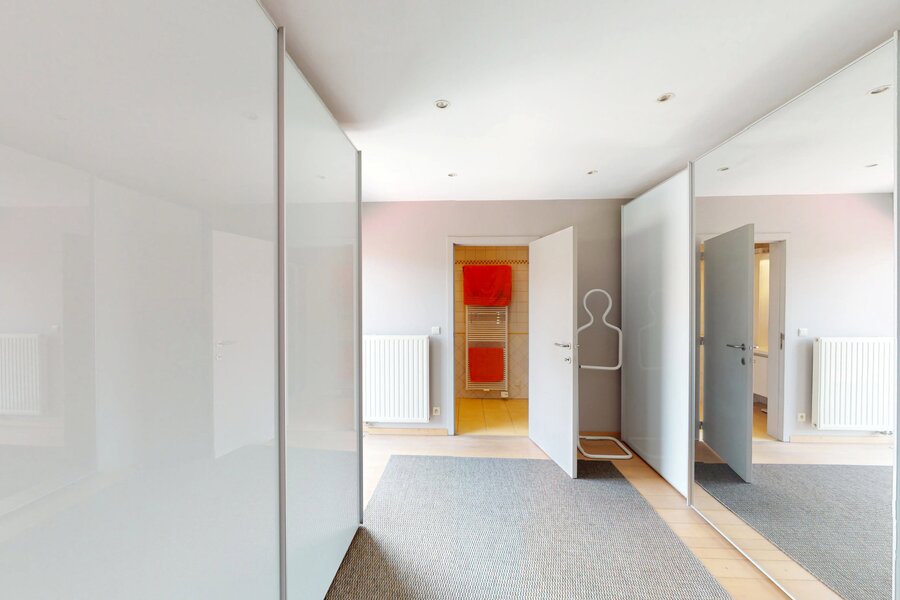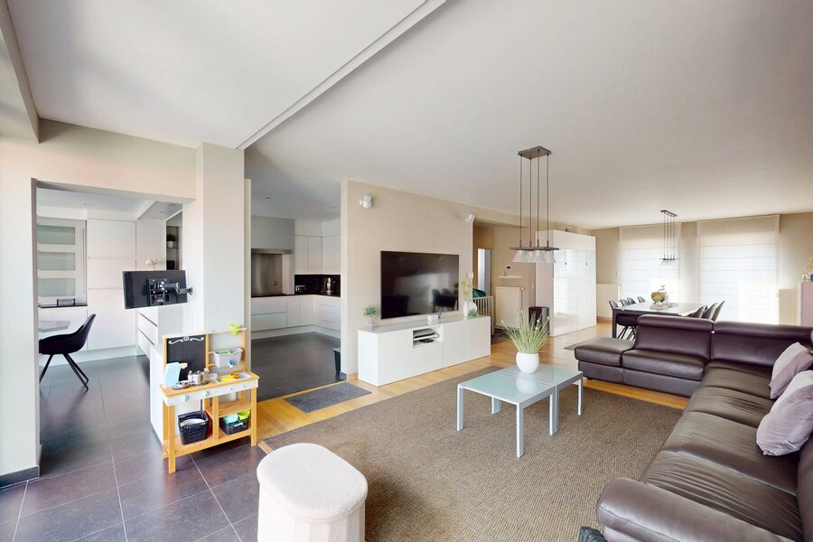 L'étage, dont l'accès pourrait être privatisé, révèle un appartement moderne de ±250 m² (PEB B), aux finitions haut de gamme :