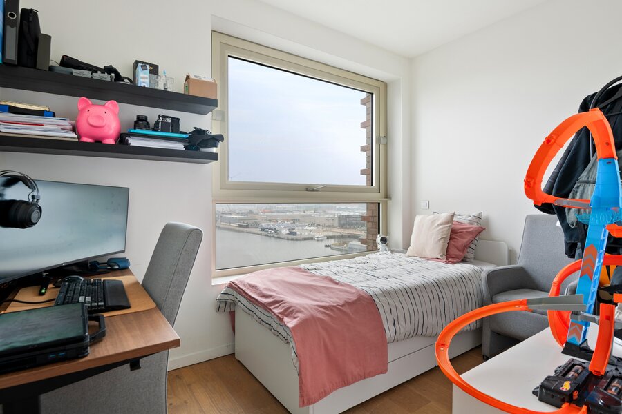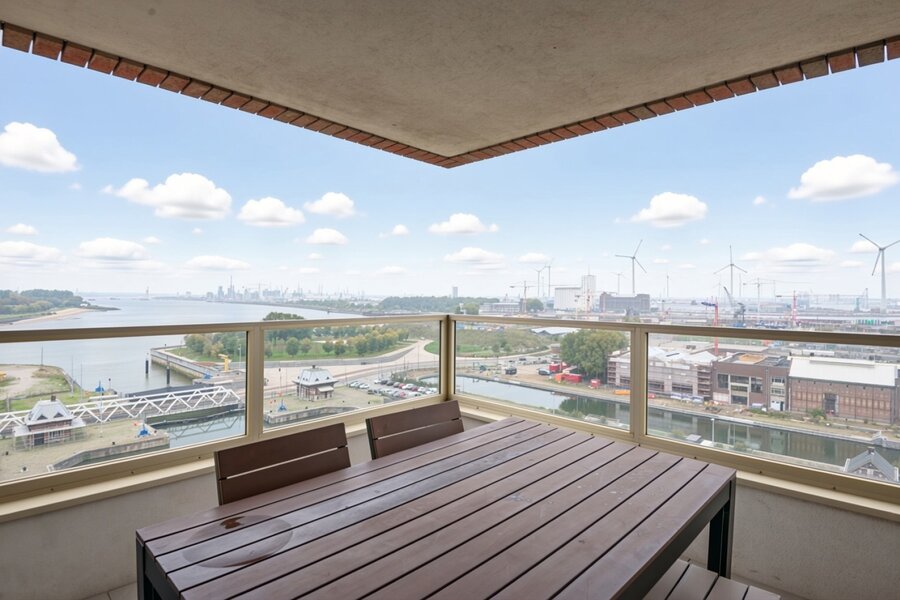 Situé au 10ème étage de la Tour 6, cet appartement spacieux de 97 m² avec une terrasse orientée sud de 11 m² offre un confort de vie exceptionnel et une vue dégagée. Depuis le séjour, vous profitez d'une vue panoramique sur l'Escaut, la rive gauche, la rive droite, le port et le nord d'Anvers.