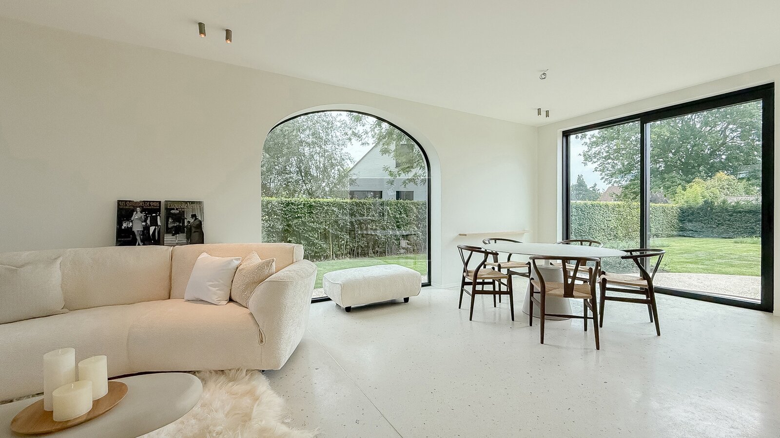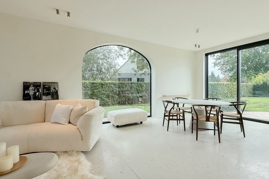 De larges baies vitrées assurent une connexion fluide avec l’extérieur et laissent pénétrer une abondante lumière naturelle. La salle à manger se prolonge harmonieusement vers la terrasse ensoleillée et le jardin joliment aménagé.