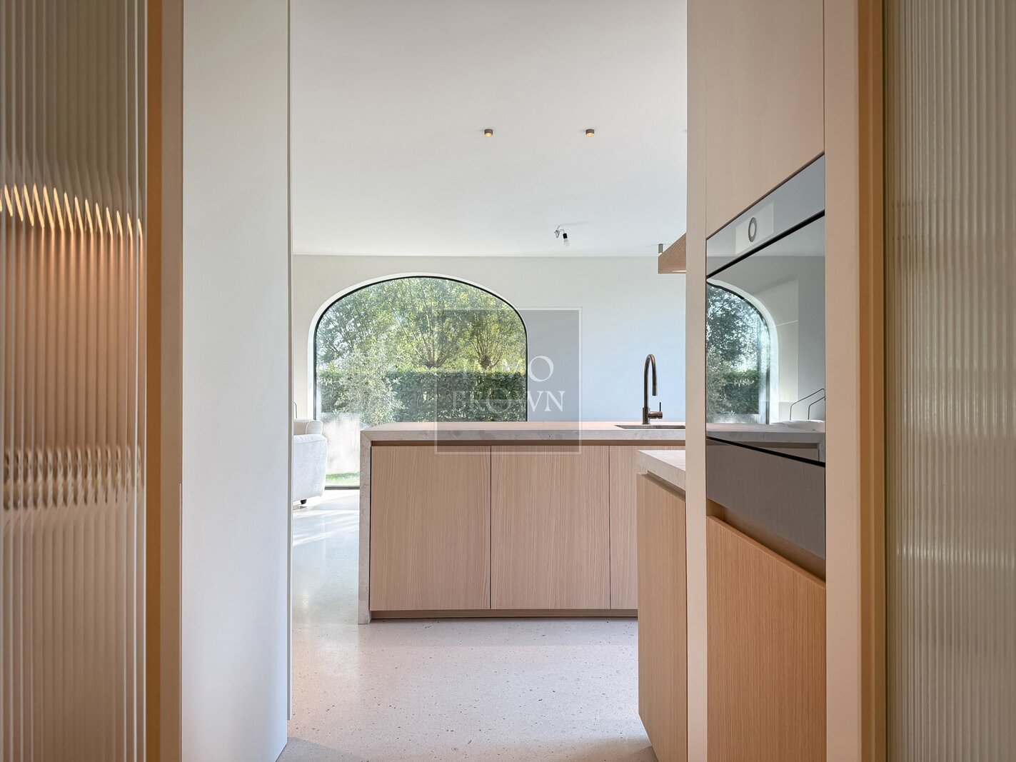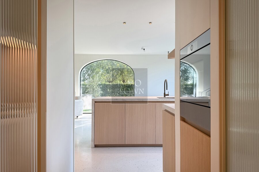 La cuisine ouverte constitue le cœur de la maison et est équipée d’un généreux îlot central, réalisé en pierre naturelle raffinée et en terrazzo.