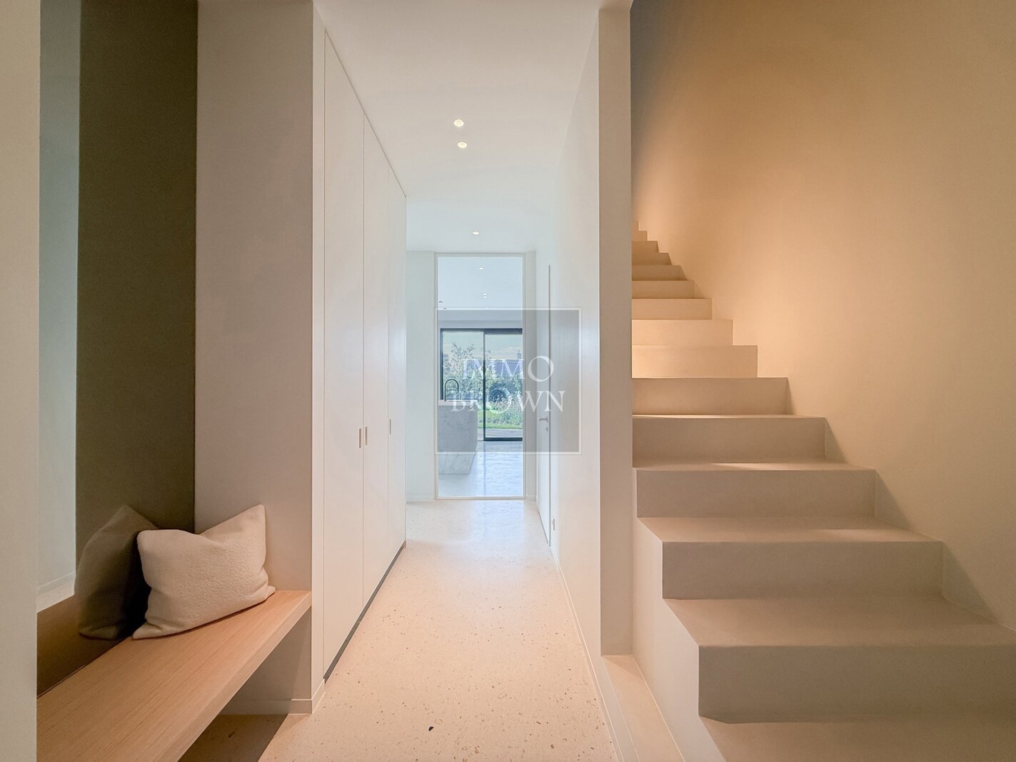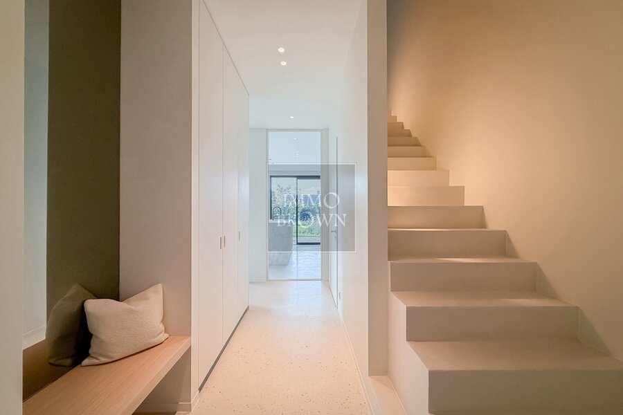 La maison s’ouvre sur un hall d’entrée élégant avec vestiaire et toilettes invités séparées. Celui-ci mène à un vaste espace de vie ouvert où la lumière et la sensation d’espace sont omniprésentes.