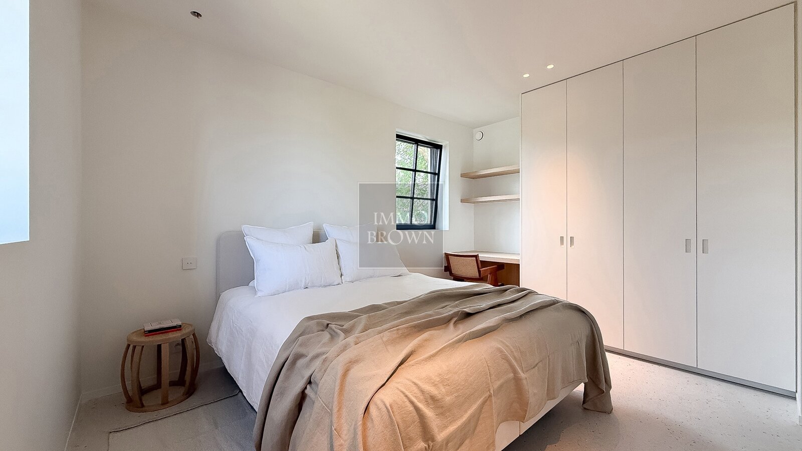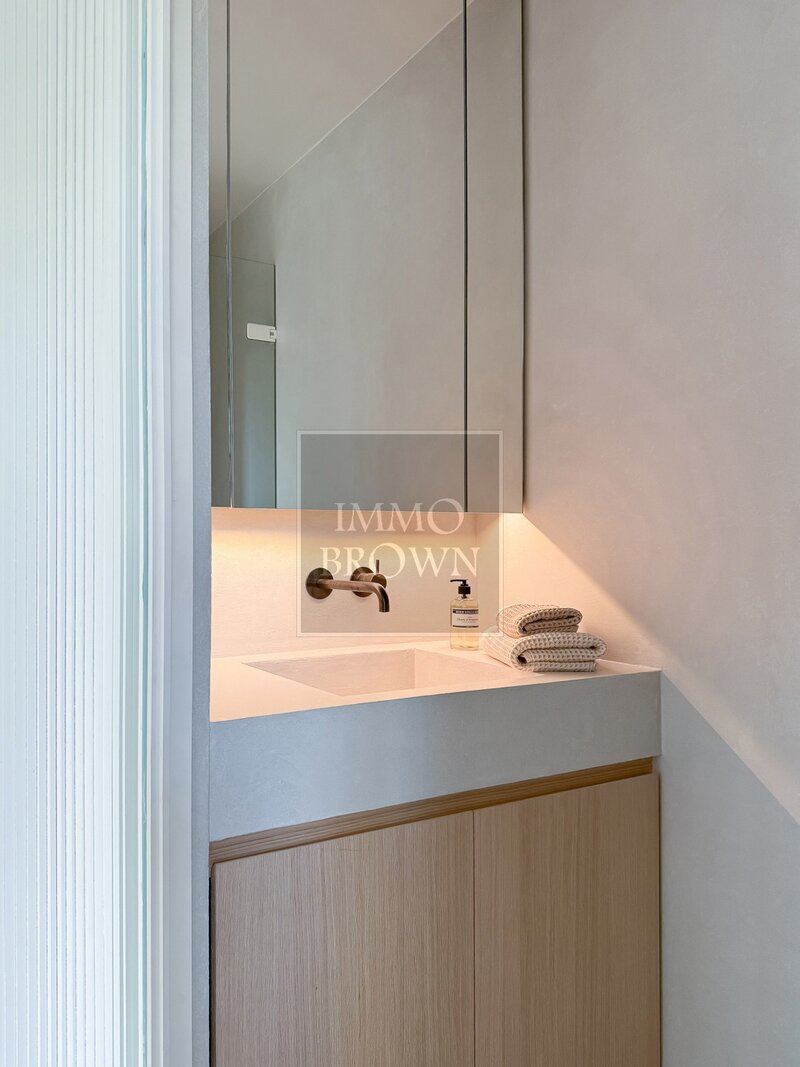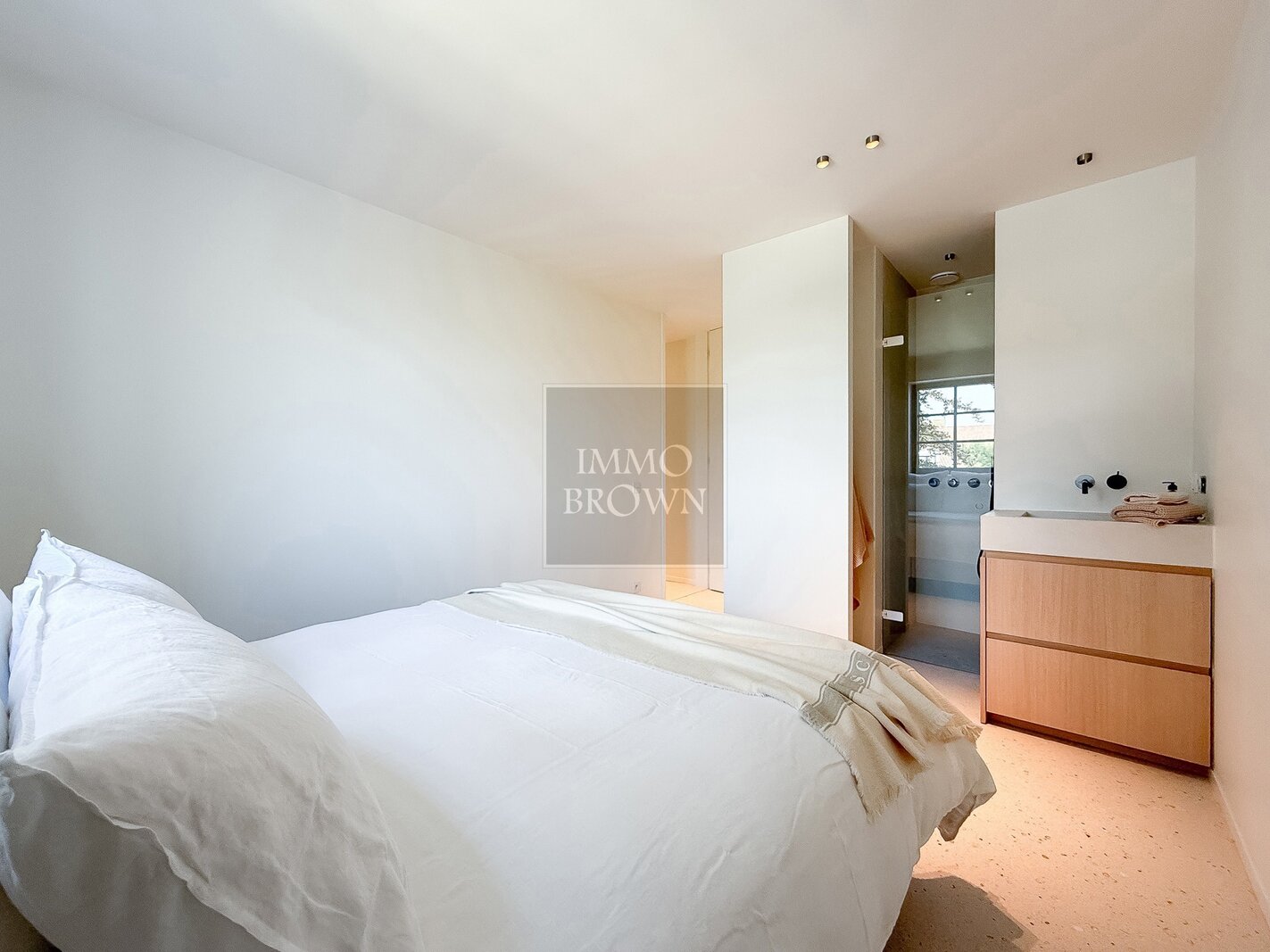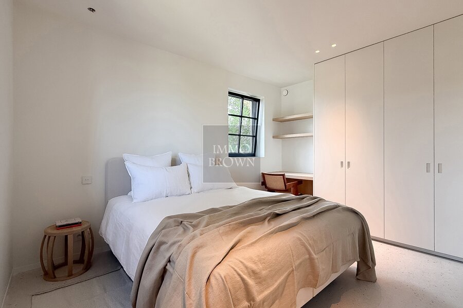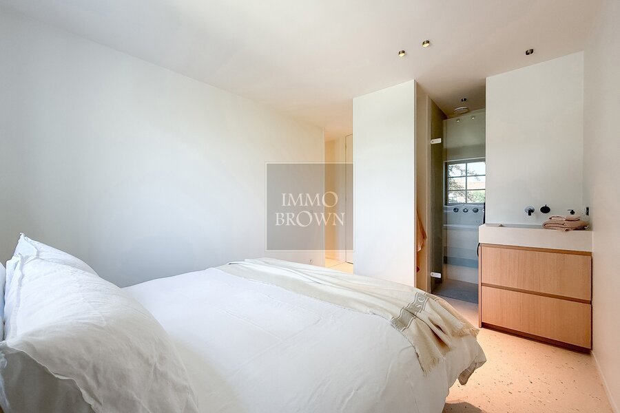 La chambre principale bénéficie d’un confort supplémentaire grâce à un spacieux dressing et à une salle de bains attenante aux finitions haut de gamme en forcrete et terrazzo.