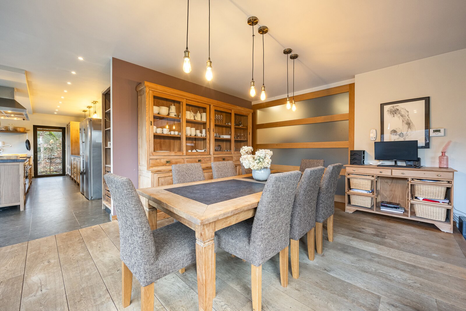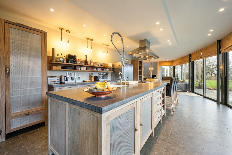 Zowel vanuit de zithoek als de keuken is er via grote raampartijen zicht en toegang tot het terras en de tuin.