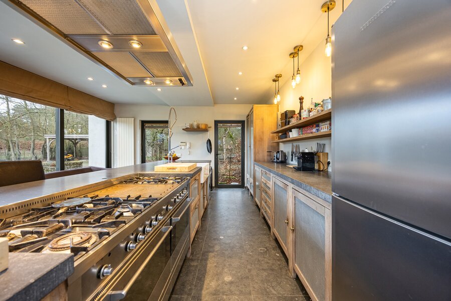 Inkomhal met gastentoilet en vestiaireruimte - grote leefruimte met veel natuurlijke lichtinval ingedeeld in een zithoek open tot in de nok van het dak en voorzien van een O.H., een tv salon, eetkamer en een zeer ruime open en volledig geïnstalleerde keuken. De keuken is maatwerk en voorzien van Amerikaanse koelkast, een aanrecht en een groot kookeiland met zitruimte voorzien van een werkblad in Belgische blauwe natuursteen, ruime spoelbak - extra groot gasfornuis met 6 pitten, dubbele oven en dubbele dampkap. Aansluitend is er een berging en toegang tot de kelder.