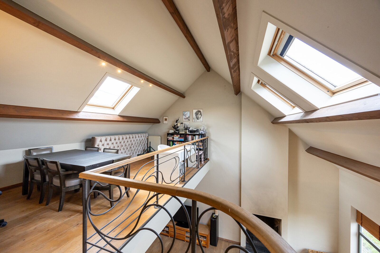 De mezzanine staat in verbinding met de woonkamer. Een home office met zicht op de tuin is hier perfect mogelijk.