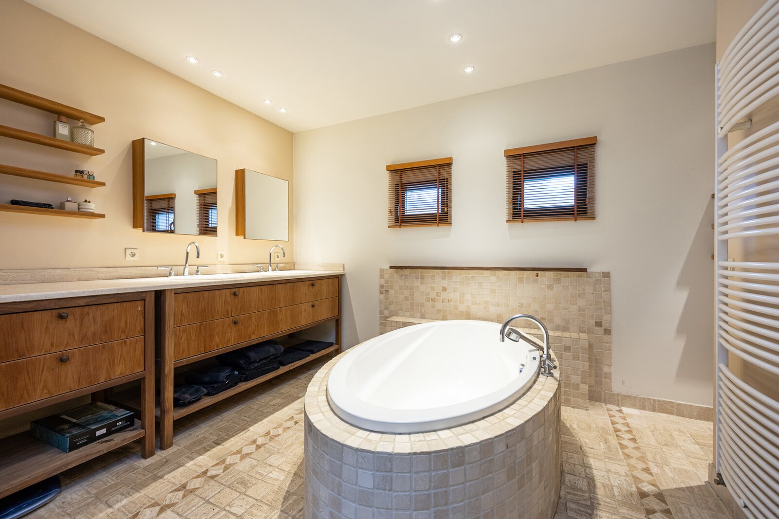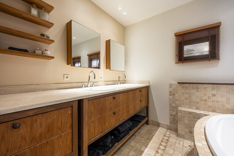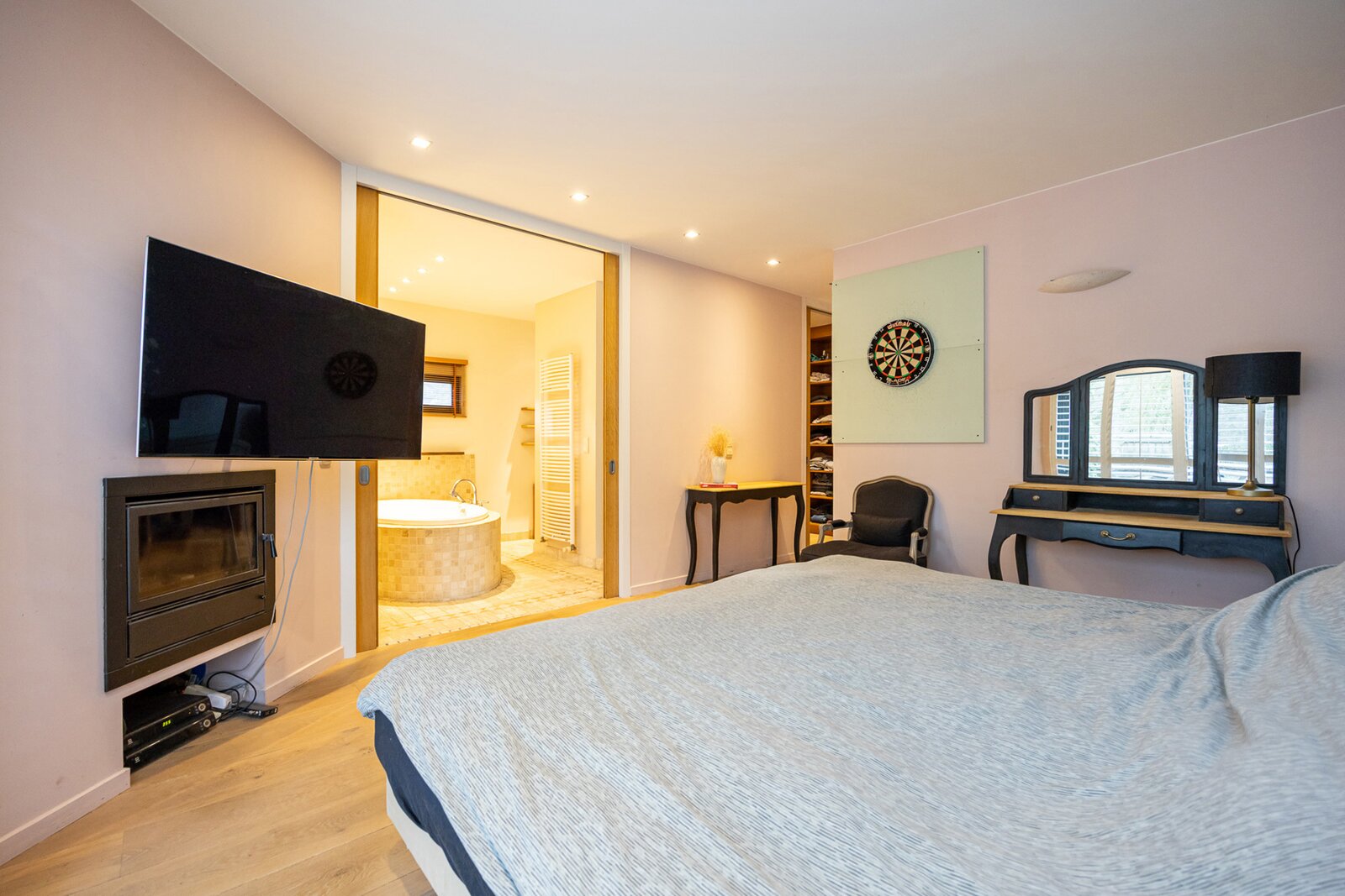 Op het gelijkvloers bevindt zich de hoofdslaapkamer met houtkachel. De ensuite badkamer is uitgerust met een ligbad, dubbele lavabo, inloopdouche en toilet. Daarnaast is er een aparte dressing. Via het schuifraam is er toegang tot het terras in bankirai.