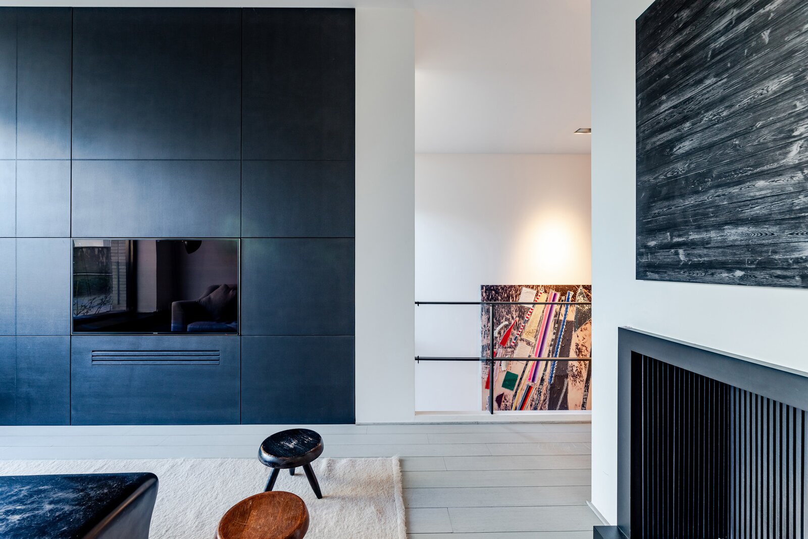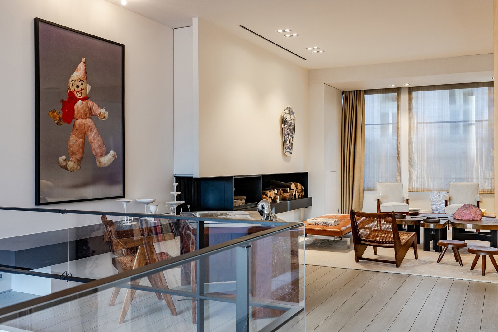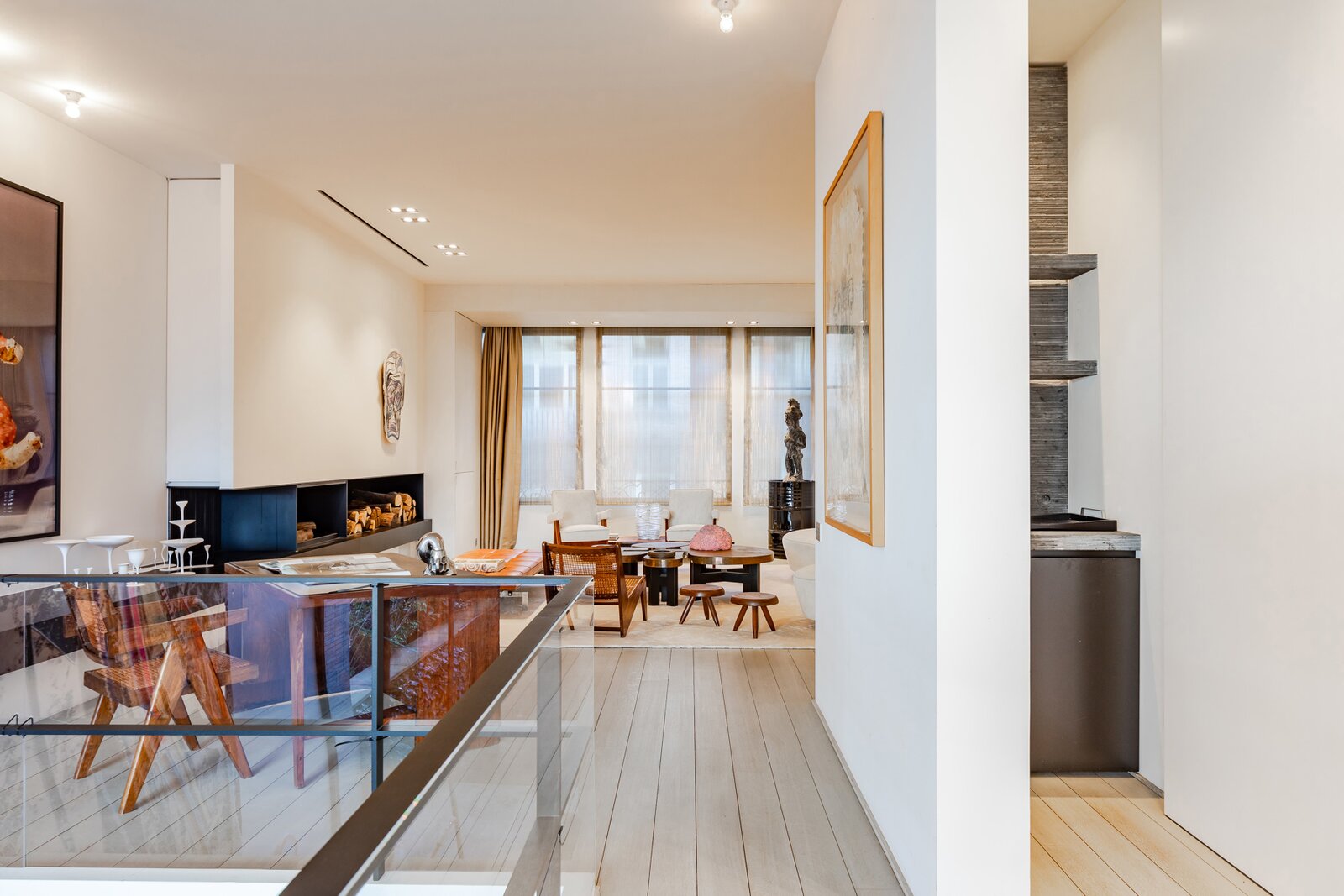 Le premier étage, accessible par escalier ou ascenseur, comprend un salon de réception, une bibliothèque et un bar intégré dans les menuiseries. On y retrouve un cheminée au bois et une autre au gaz dans la partie bibliothèque-salon TV.