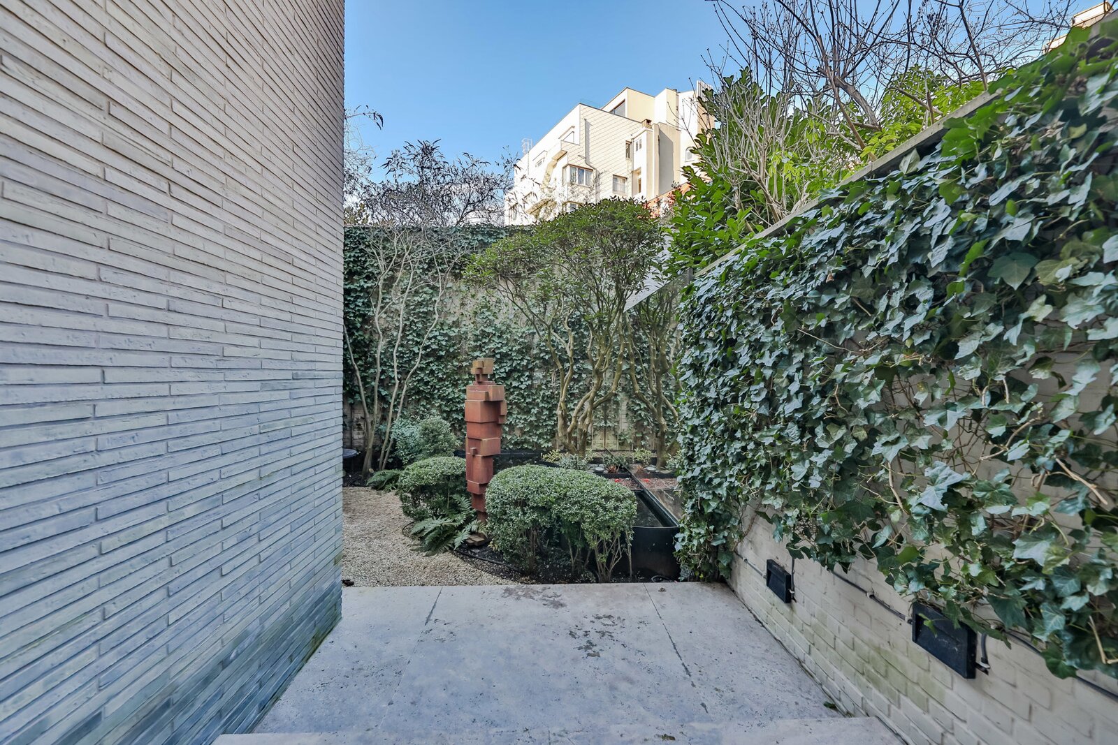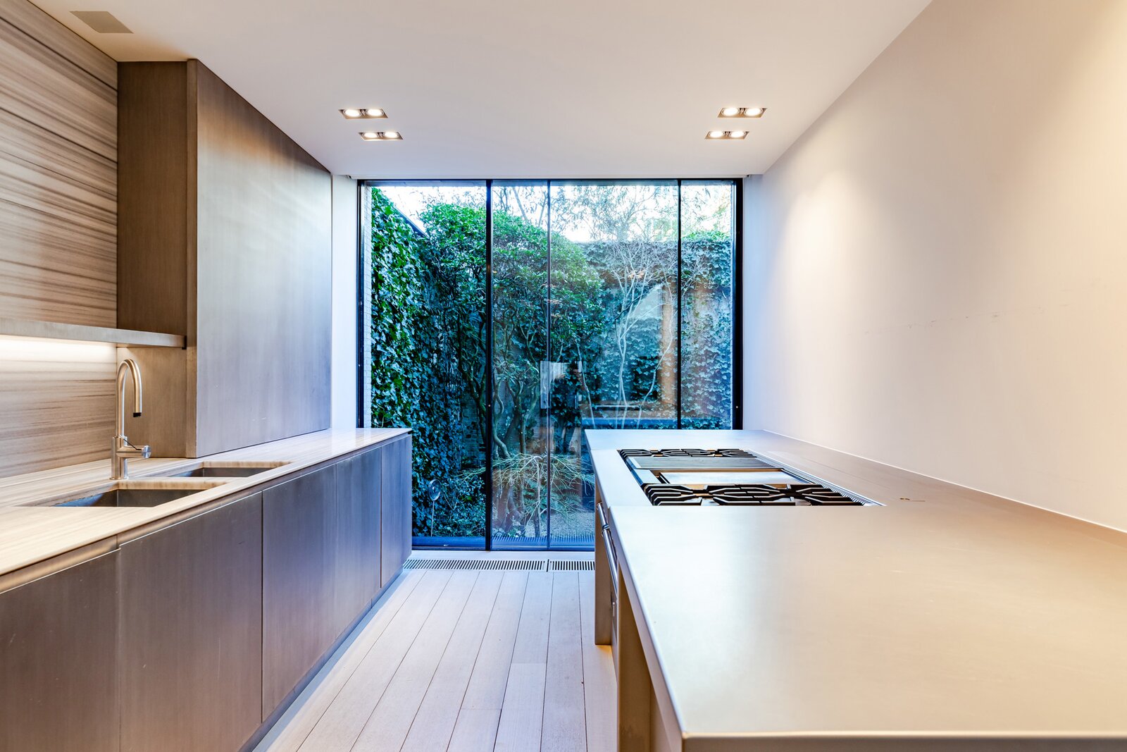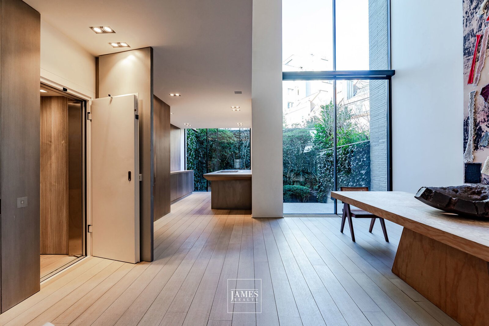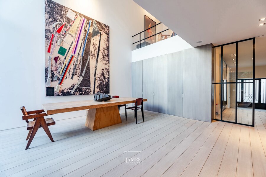 Le rez-de-chaussée offre une pièce à vivre-salle à manger avec une hauteur sous plafond impressionnante, une cuisine ouverte ultra-équipée avec des placards en acier patiné, un garage pour deux voitures avec système d'ascenseur et un jardin de ville dessiné avec soin.