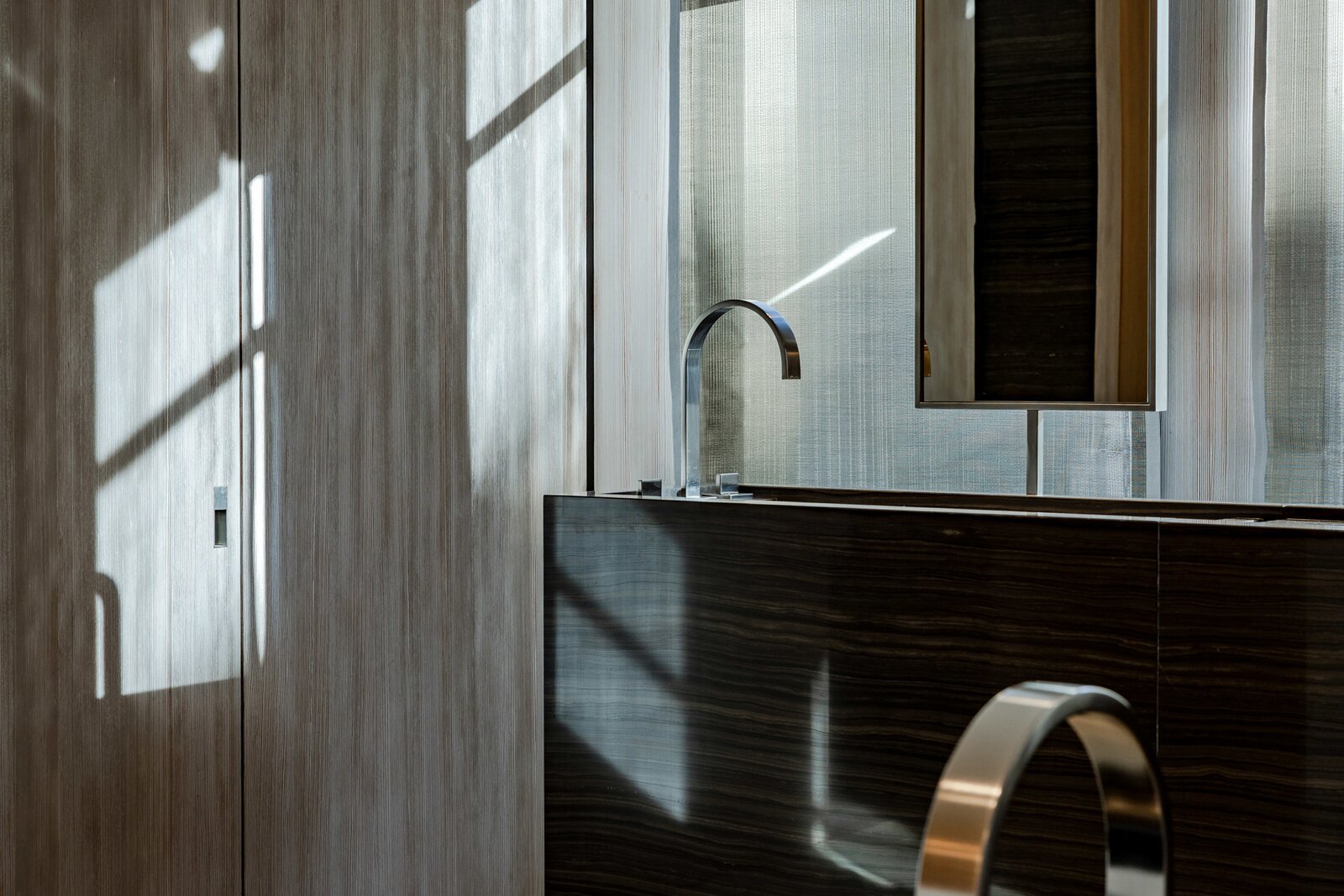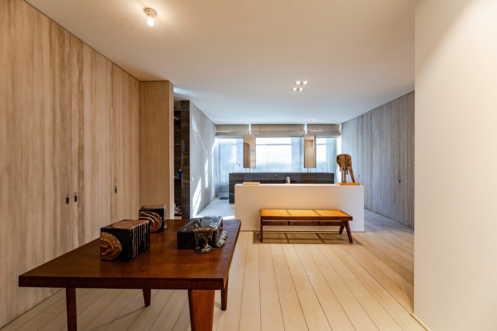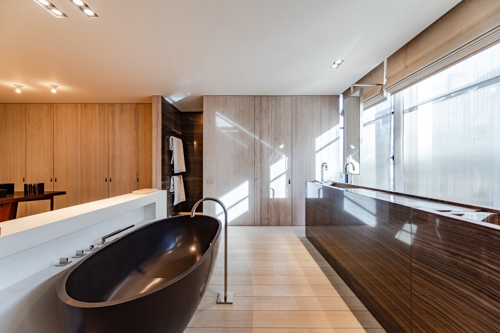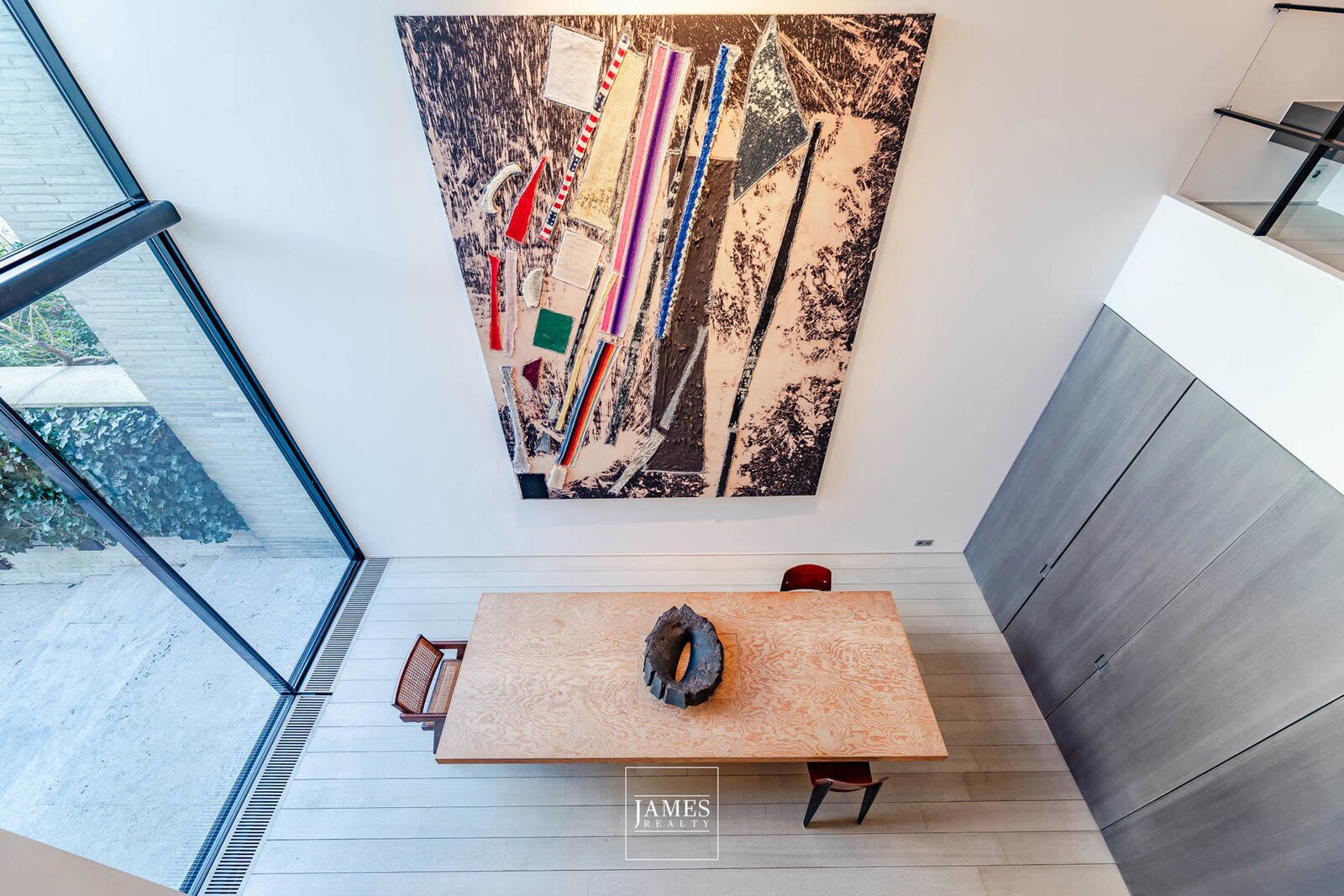 Le rez-de-chaussée offre une pièce à vivre-salle à manger avec une hauteur sous plafond impressionnante, une cuisine ouverte ultra-équipée avec des placards en acier patiné, un garage pour deux voitures avec système d'ascenseur et un jardin de ville dessiné avec soin.