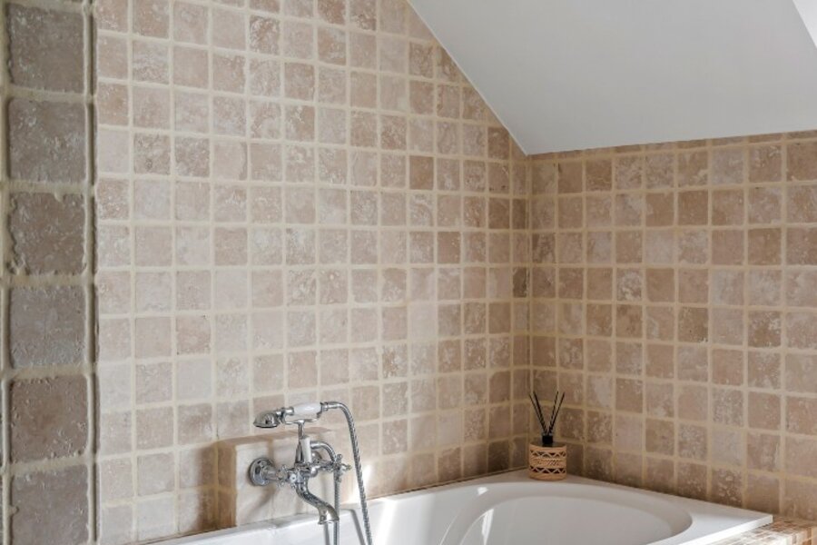 De eigentijdse badkamer beschikt over een dubbel lavabomeubel, een douche, een ligbad en een toilet.