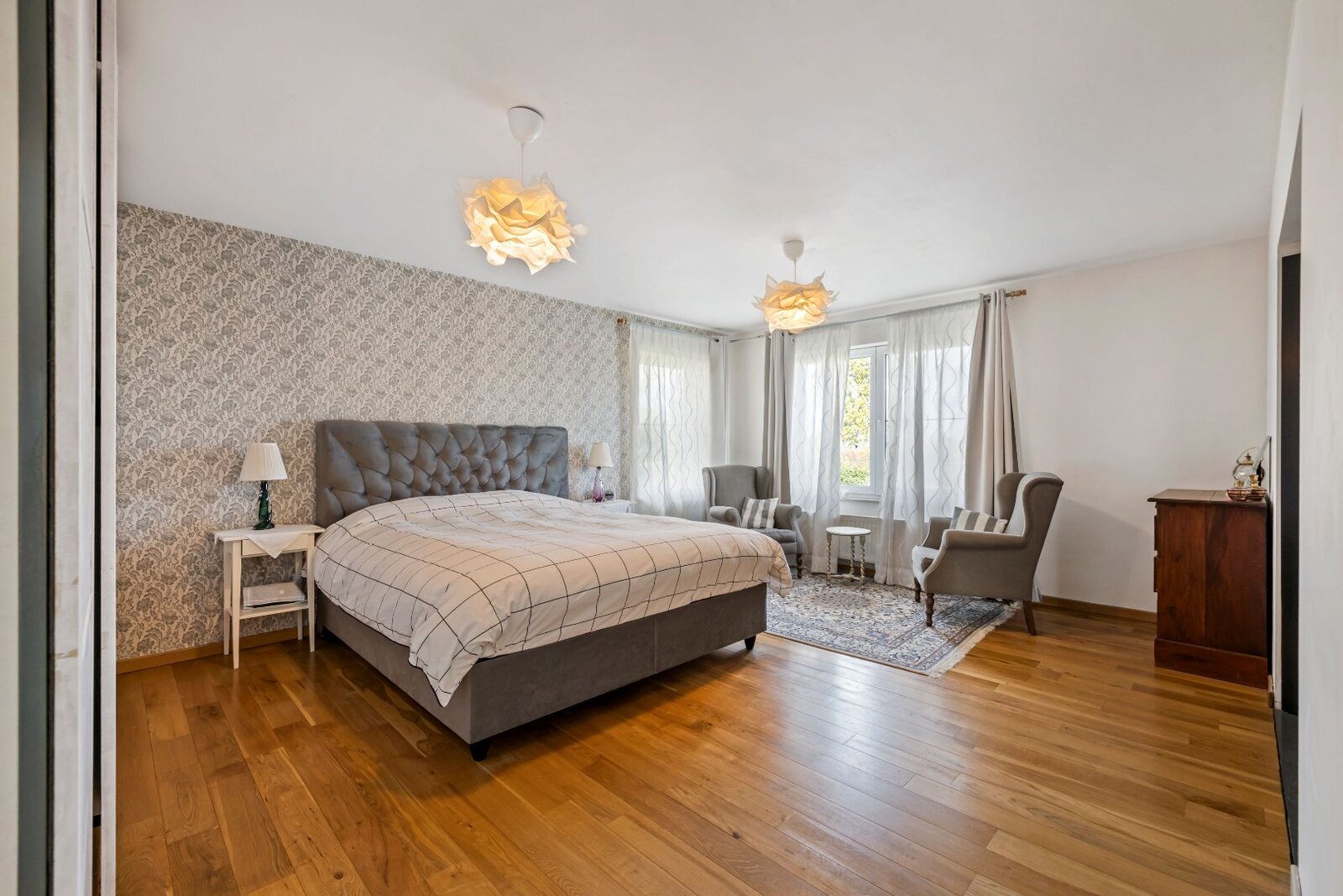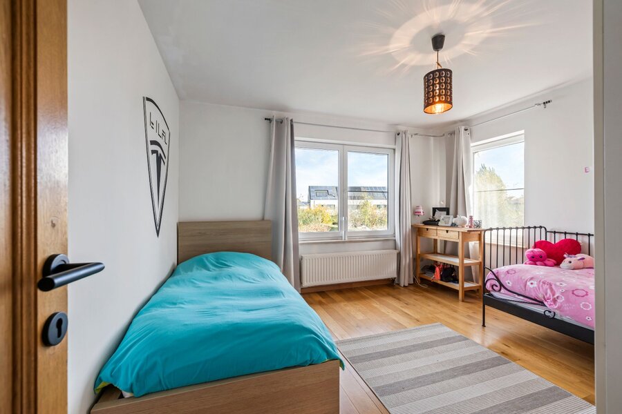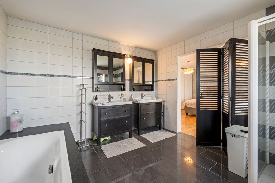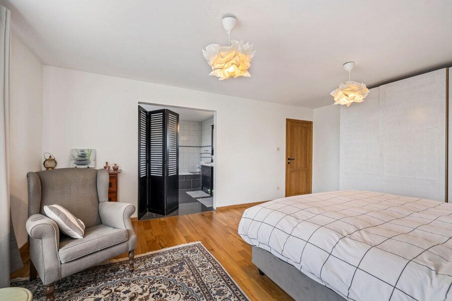 De woning beschikt over vijf ruime slaapkamers en twee volledig uitgeruste badkamers, elk met een eigentijdse afwerking en hoogwaardige materialen. De hoofdbadkamer is voorzien van een inloopdouche, ligbad en dubbele wastafel, terwijl de tweede badkamer extra comfort biedt voor gezin of gasten. Dankzij de vloerverwarming geniet u in de hele woning van een aangename en constante warmte, ongeacht het seizoen.