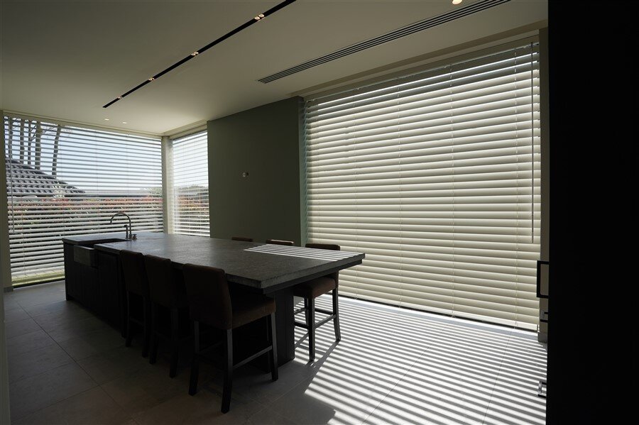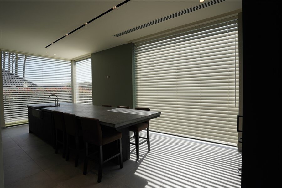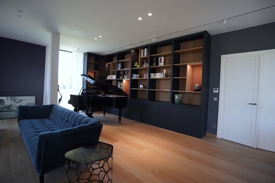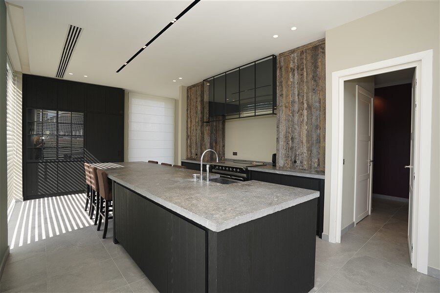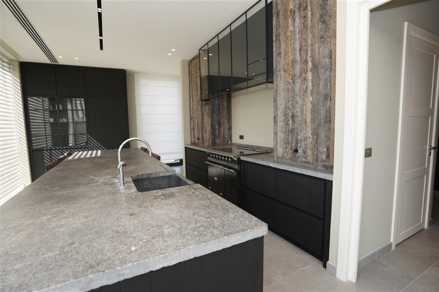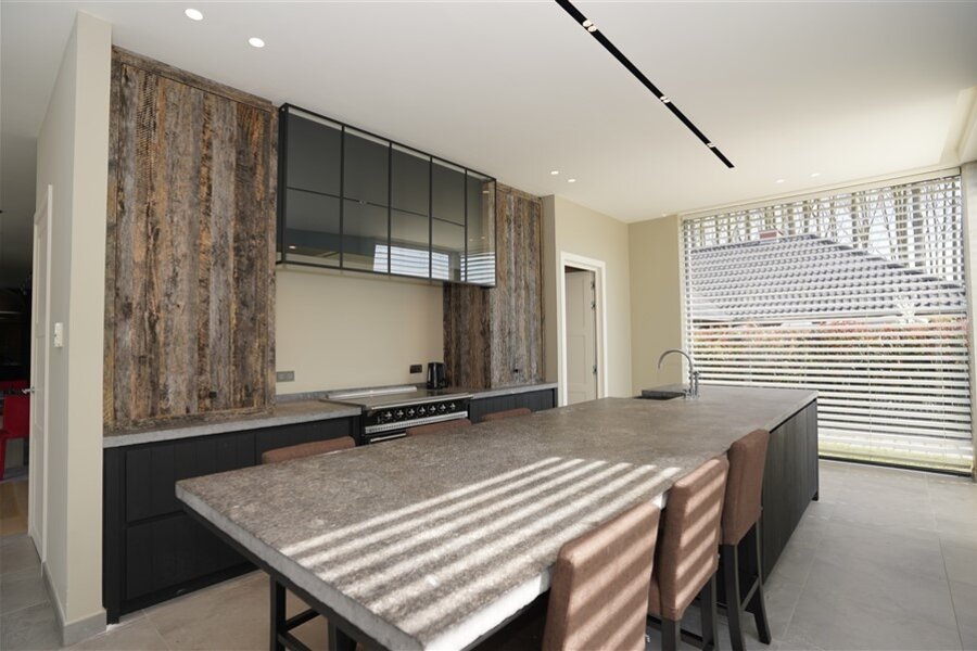 Rez-de-chaussée : Hall d'entrée avec WC invités - beau salon exclusif avec des armoires murales élégantes - cuisine de luxe de haute qualité finie en pierre naturelle et Barnwood - salle de stockage - bureau fonctionnel et une chambre à coucher spacieuse avec une salle de douche de luxe.