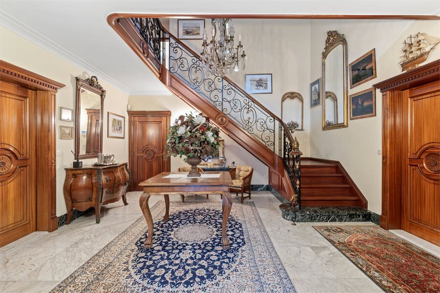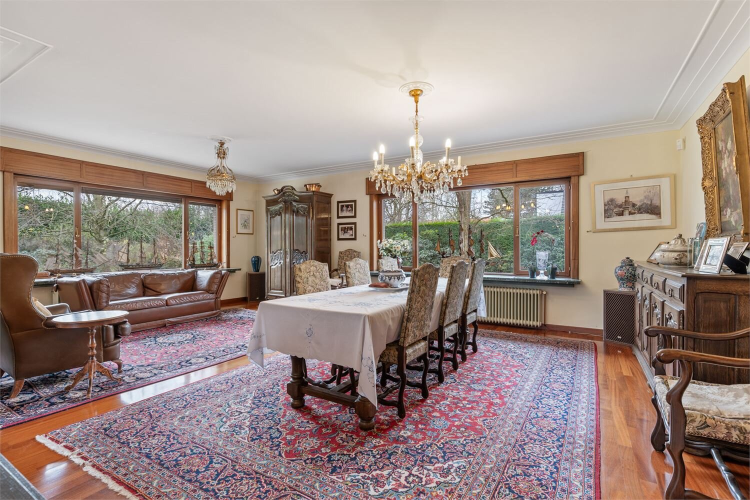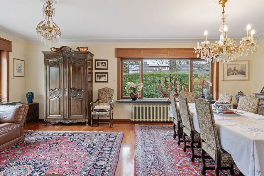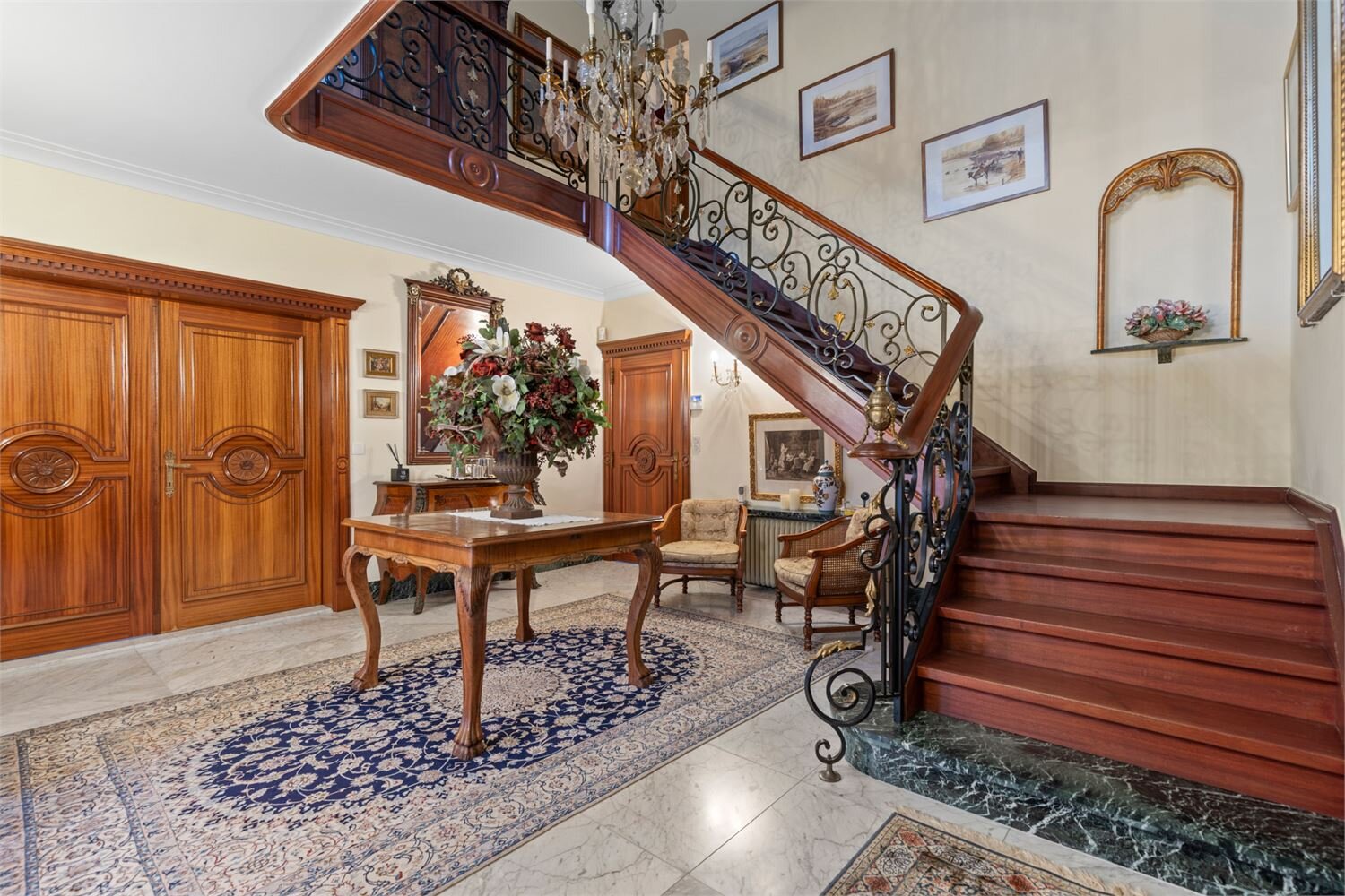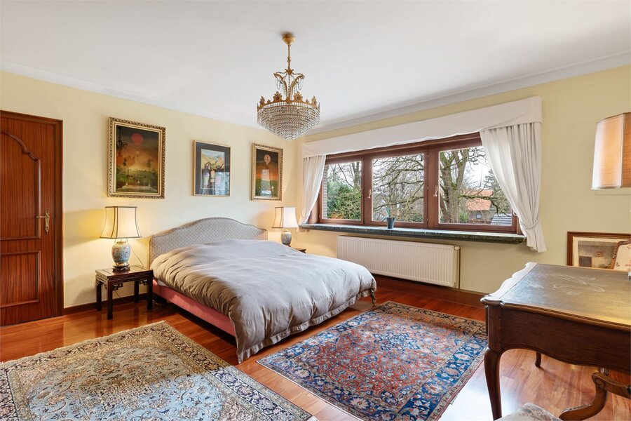 De imposante villa heeft een bewoonbare oppervlakte van 453 m² en karakteriseert zich met een unieke bouwstijl, klassieke gevels en elegante details. Op de gelijkvloerse verdieping bevinden zich een royale inkomhal, ruime woonkamer, eetkamer, keuken, bureau en dubbele garage. De eerste verdieping telt vijf slaapkamers, drie badkamers en een indrukwekkende trappenhal.