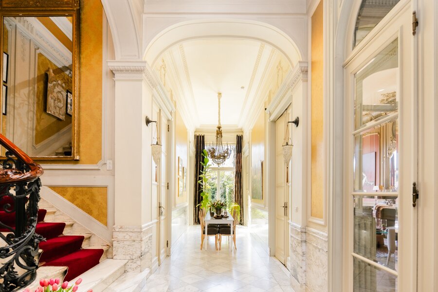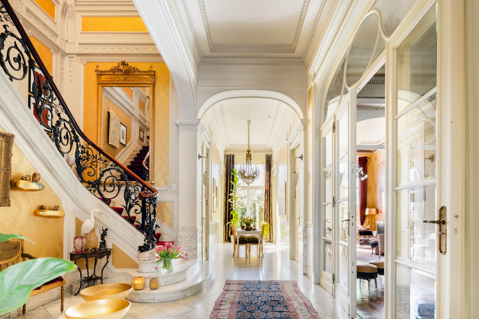 Derrière la façade imposante se déploie une oasis de calme dans l’un des plus anciens monuments de Malines, mentionné pour la première fois en 1303. Le bâtiment a pris sa forme actuelle en 1912 sous l’impulsion de l’architecte Hemelsoet, qui le transforma en un palais urbain éclectique. La finition est majestueuse : feuilles d’or, style Empire, marbres exquis, stucs dorés, panneaux décoratifs. Grille et escalier en fer forgé signés du maître ferronnier L. Van Boeckel. Plusieurs restaurations ont été réalisées en concertation avec le service des Monuments et Sites.