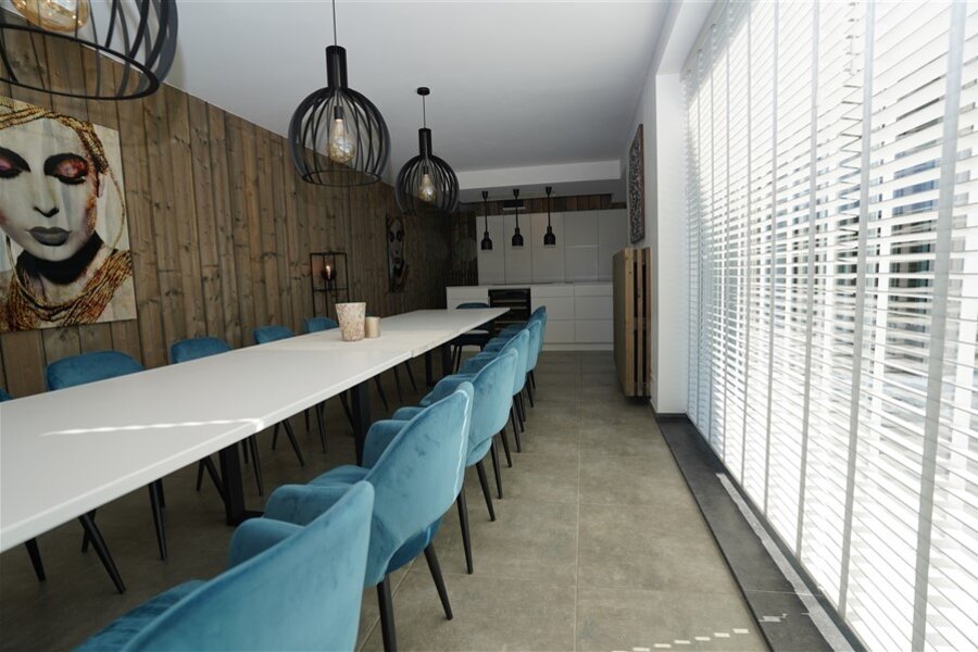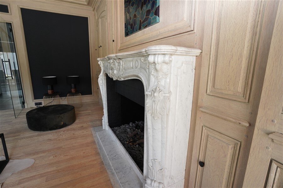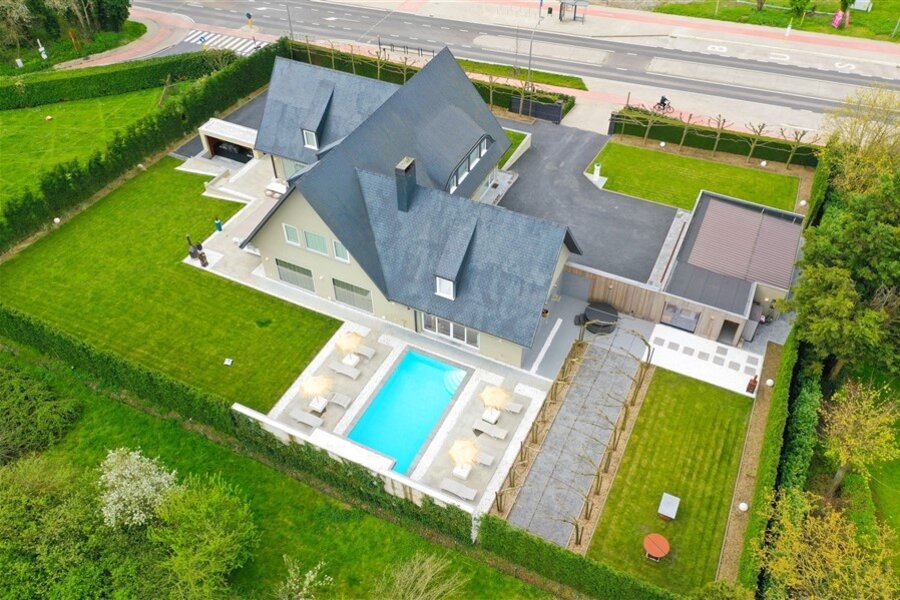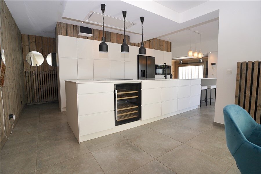 Rez-de-chaussée : Entrée (toilettes et vestiaire) - grand espace de vie de 65 m2 orienté vers le jardin avec cheminée - cuisine équipée blanche lumineuse avec grand îlot de travail - salle à manger avec table XL de qualité - bar de piscine aménagé