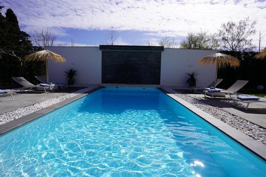 Vie extérieure : une piscine ensoleillée, une cuisine extérieure luxueuse, un sauna relaxant avec jacuzzi et un terrain de pétanque.