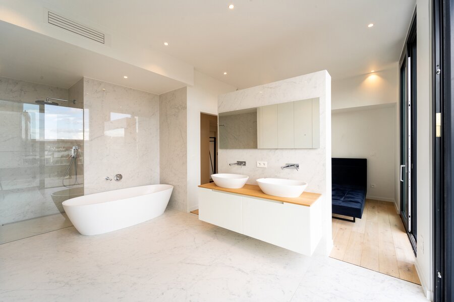 De master bedroom beschikt over een ensuite badkamer met zowel een ligbad als een ruime inloopdouche.