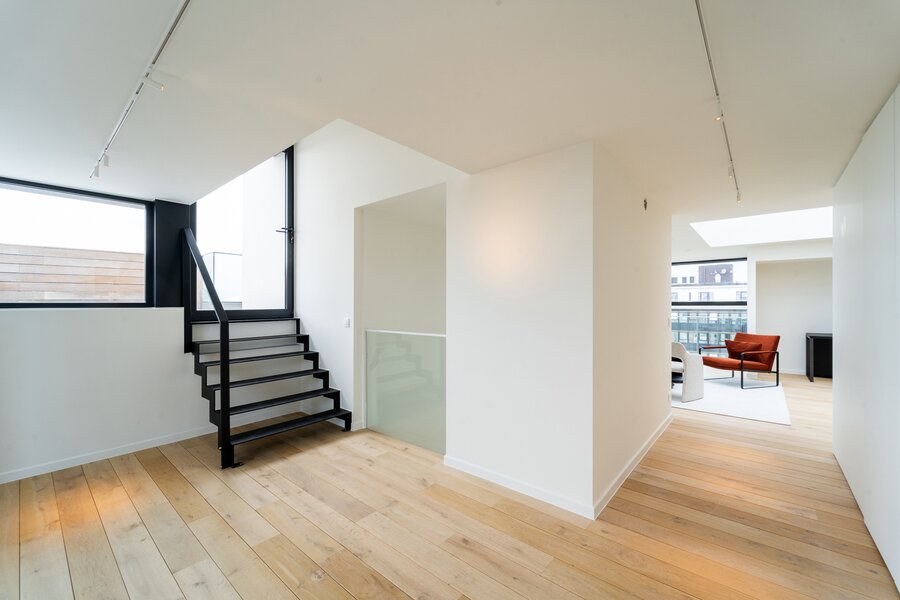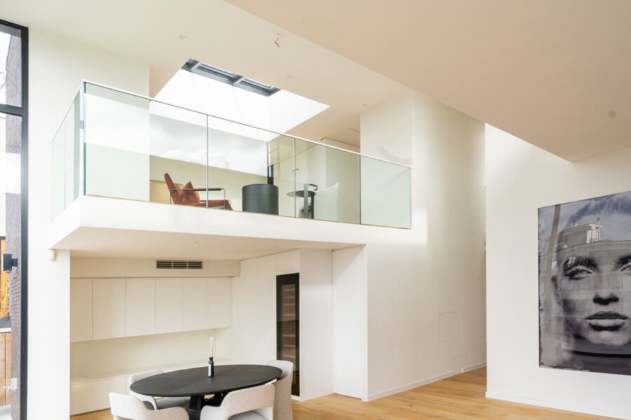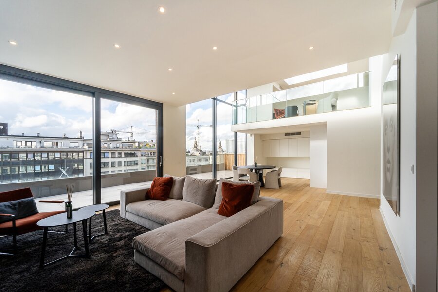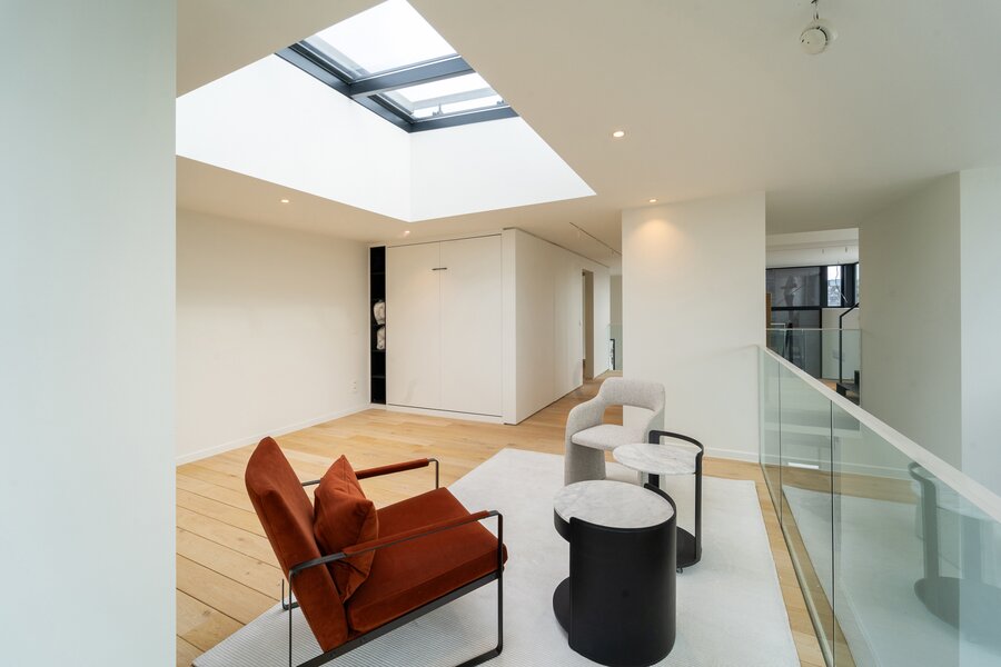 De hoge muren met ramen van vloer tot plafond zorgen ervoor dat het gehele appartement baadt in natuurlijk licht, wat bijdraagt aan een ruimtelijk en luchtig gevoel.
