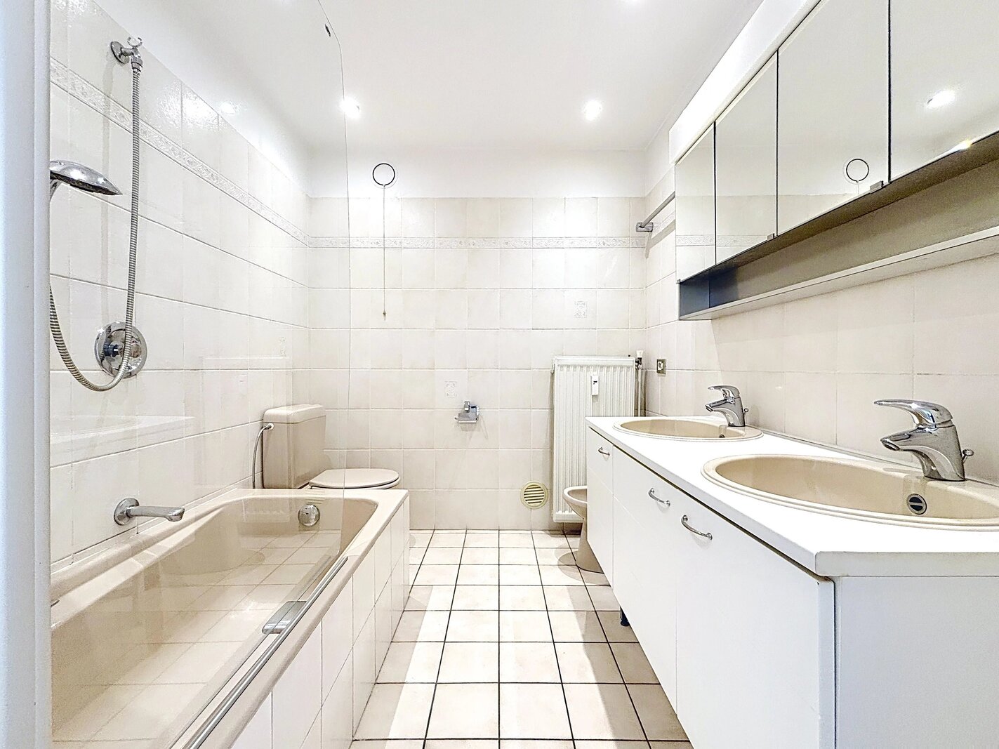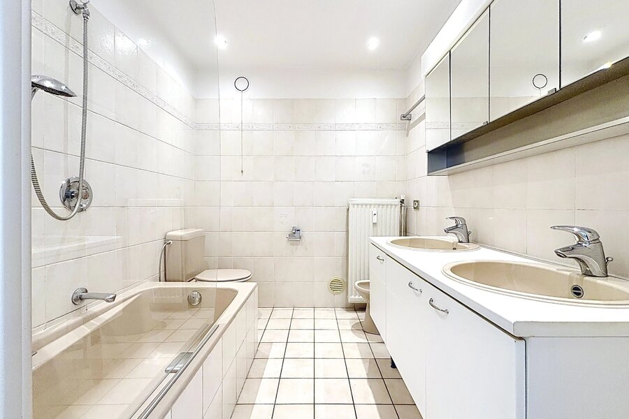 Il se compose comme suit : hall d’entrée avec vestiaire et toilette invités, réceptions +/- 53m2, cuisine équipée séparée. La partie nuit dessert 3 chambres (+/- 27, 17 et 10m2), 1 salle de bains/toilette et une salle de douche (possibilité de créer une 3ème salle de bains).
