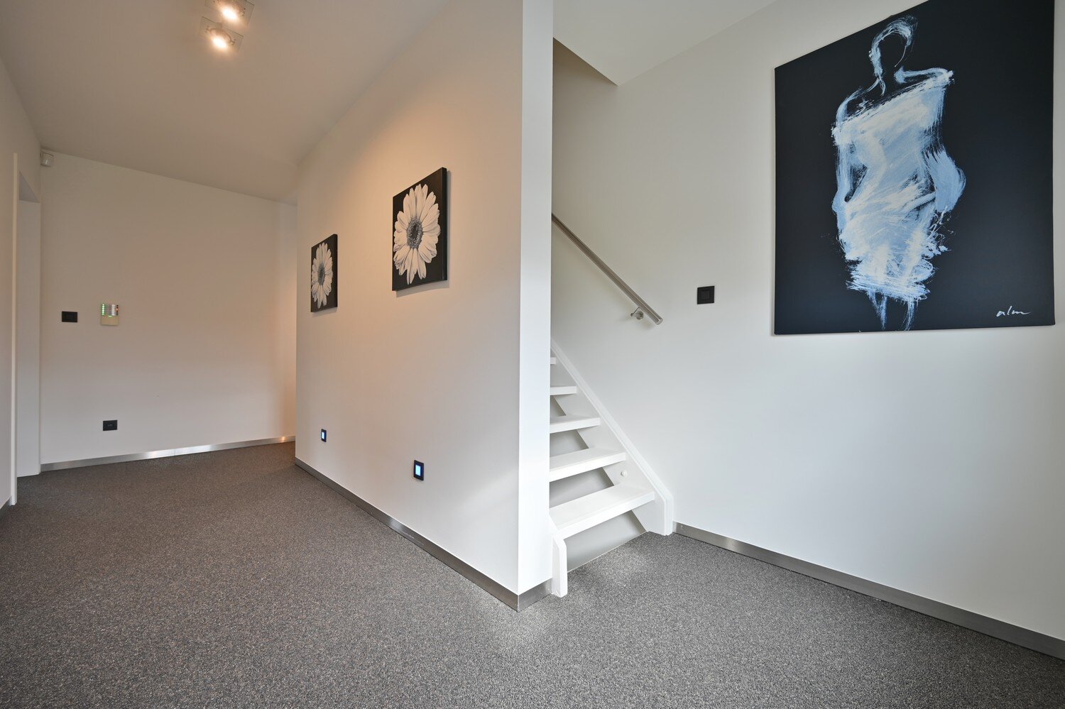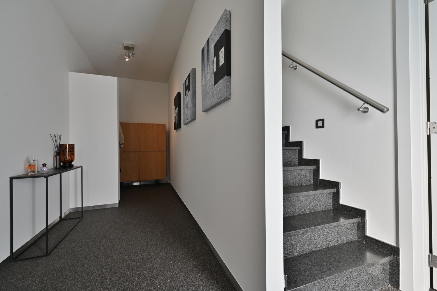- Via de granieten trap met inbouwspots bereik je de eerste etage.