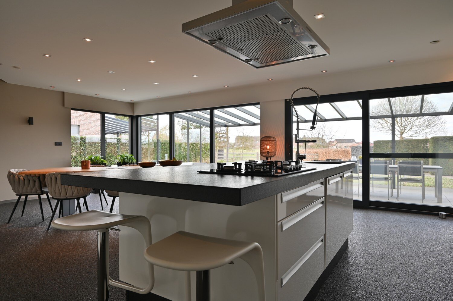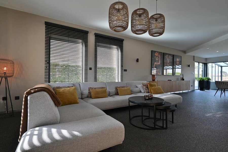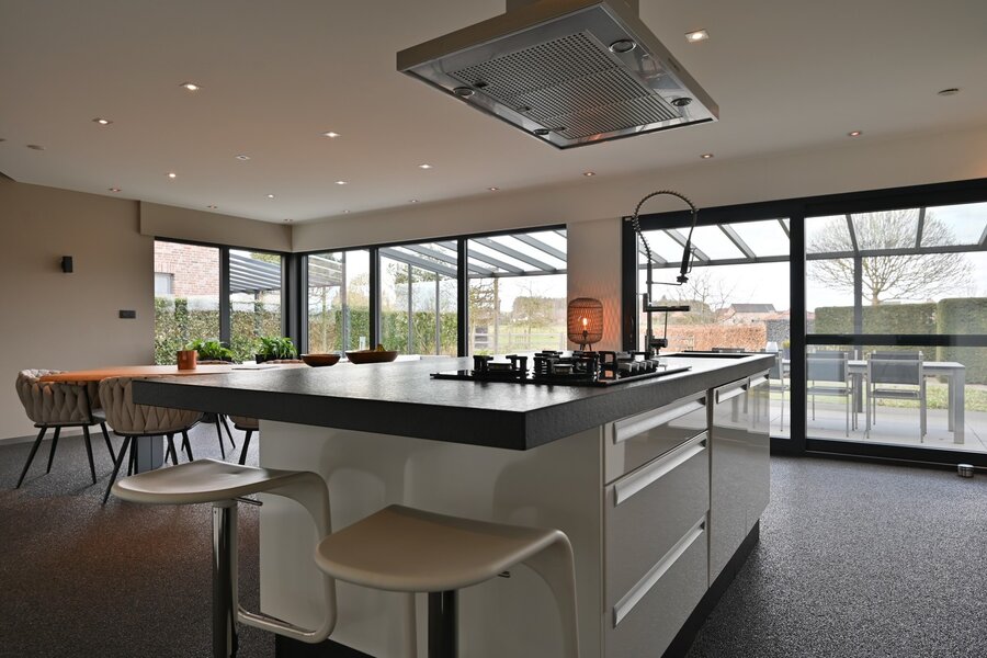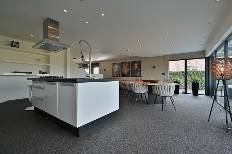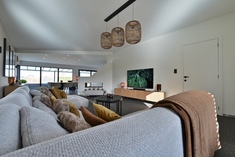 - Grote open leefruimte (ca. 54,45 m²) met open keuken (20 m²) en zicht op de tuin.