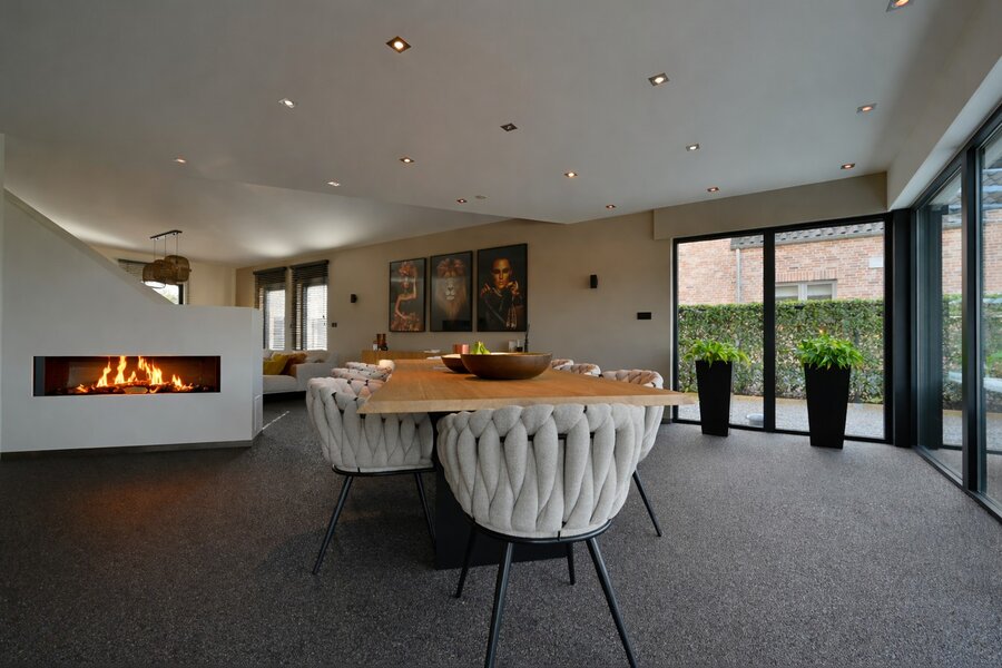 De ruime leefruimte geniet van veel natuurlijke lichtinval en sluit naadloos aan op een open keuken met zicht op de mooi aangelegde tuin. De keuken is volledig uitgerust en vormt het hart van de woning. Aan het kookeiland met werkblad uit Italiaans gekapte graniet kan je gezellig samenkomen. De gashaard in de leefruimte zorgt voor extra sfeer en gezelligheid. Verder beschikt de woning over een inpandige garage, een praktische wasruimte en een extra bergruimte met kwalitatieve inbouwkasten. De volledige woning is afgewerkt met een onderhoudsvriendelijke steentapijt.