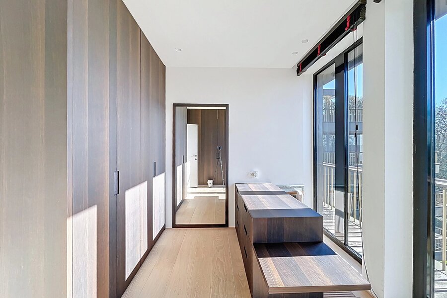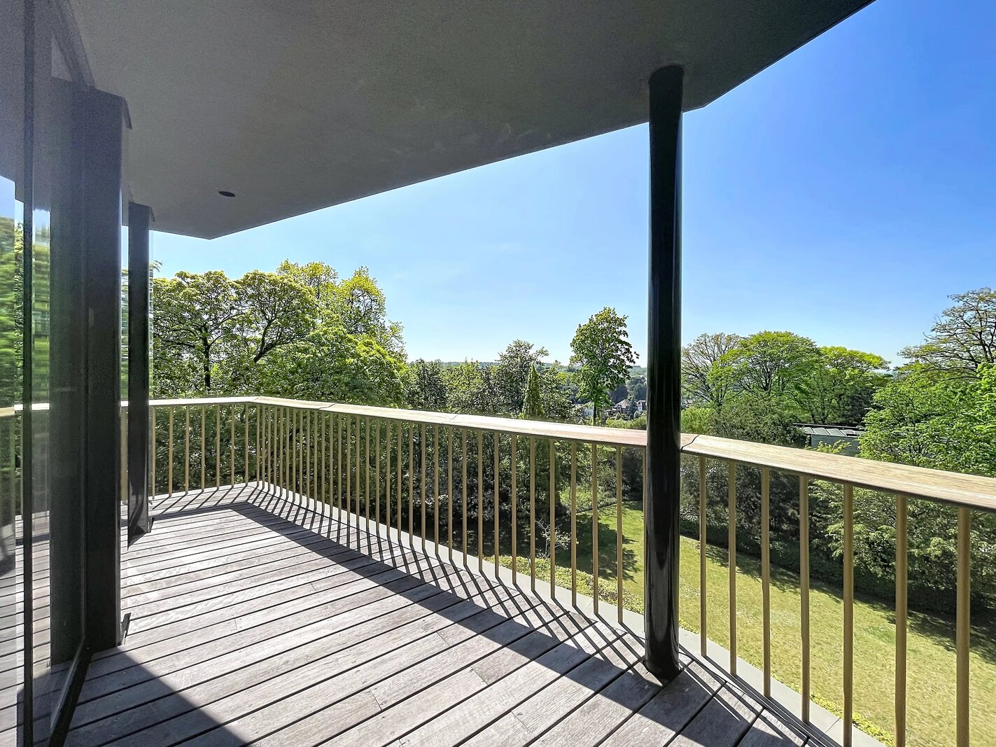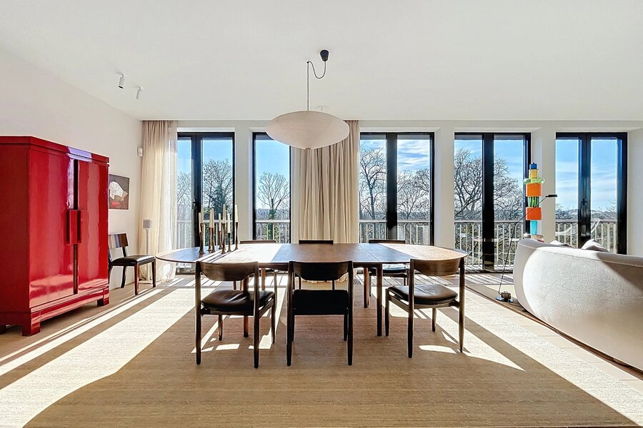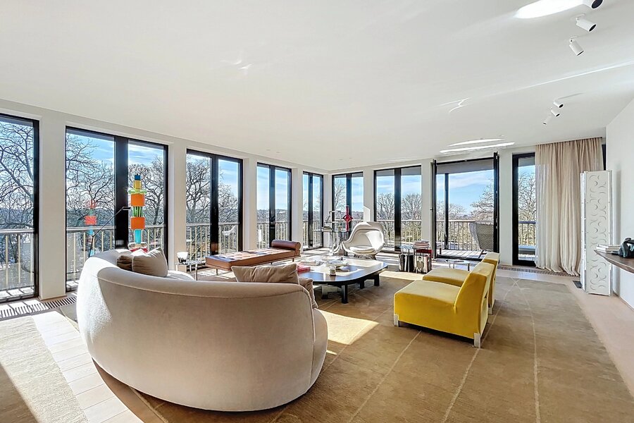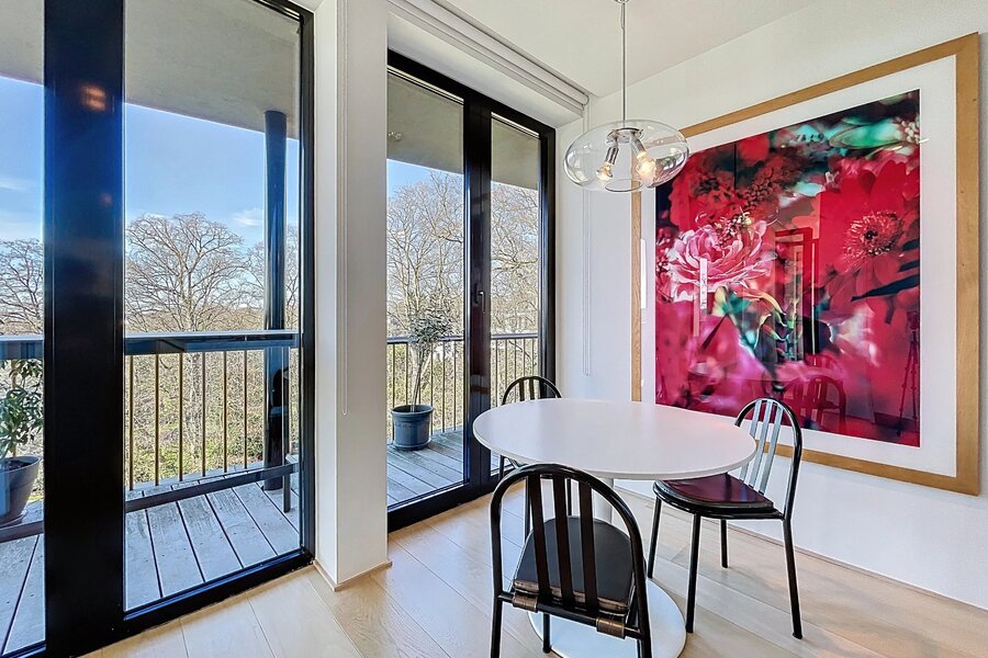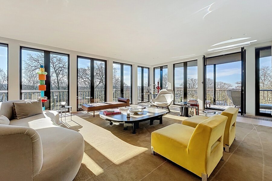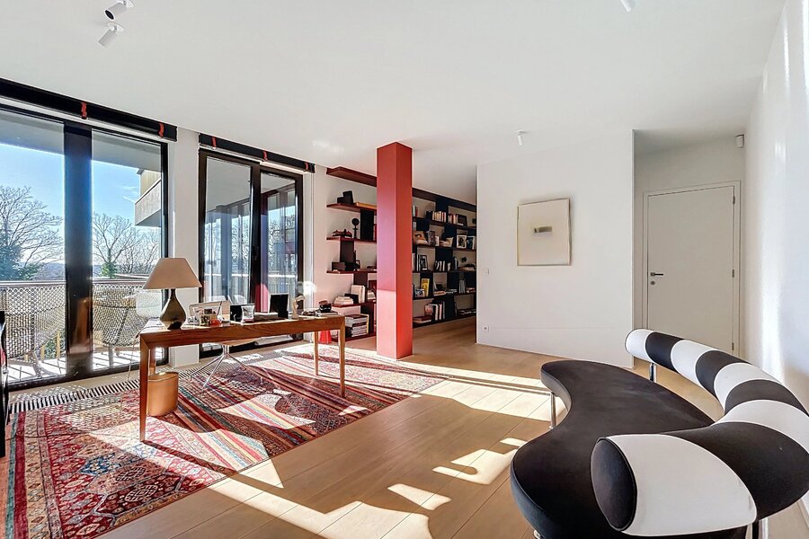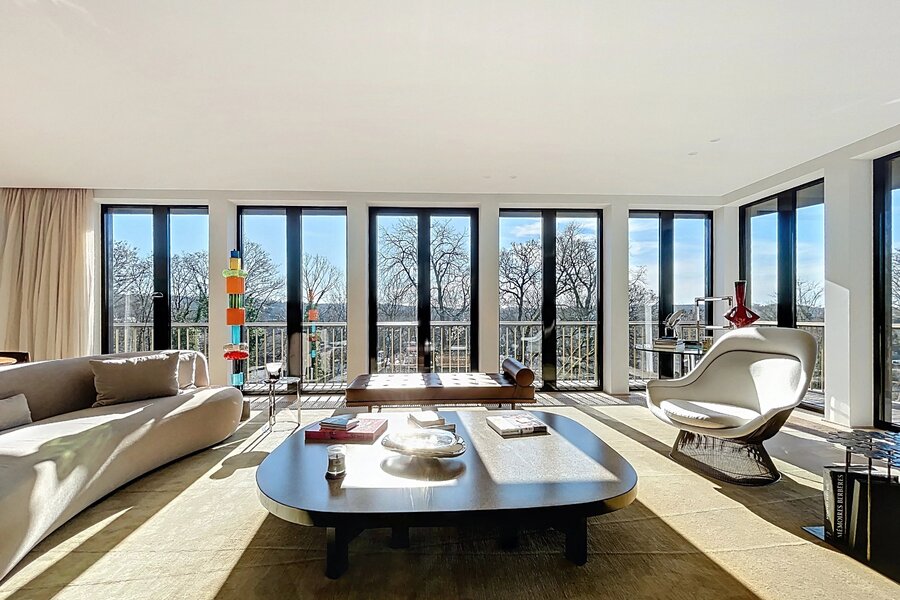 Depuis chacune des pièces, la nature s'invite à travers de larges baies vitrées offrant une vue panoramique et apaisante sur le parc. La terrasse enveloppante, qui ceint l'intégralité de l'appartement, devient au fil des heures un balcon privilégié sur des couchers de soleil spectaculaires.