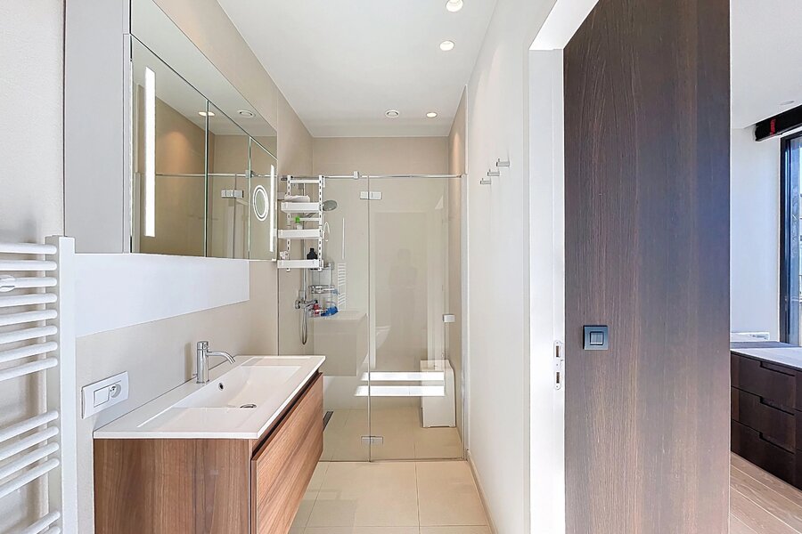Techniques irréprochables : chaudière individuelle à condensation neuve (2023), air conditionné (2021), stores type screen, stores vénitiens, spots directionnels. Panneaux solaires installés en 2026 pour l'ensemble de la résidence et pour l'usage de tous les communs (électricité, ascenseur, éclairage du parc, …). PEB C-, électricité conforme. Aucun travaux à prévoir — emménagez et profitez. Concierge à plein temps.