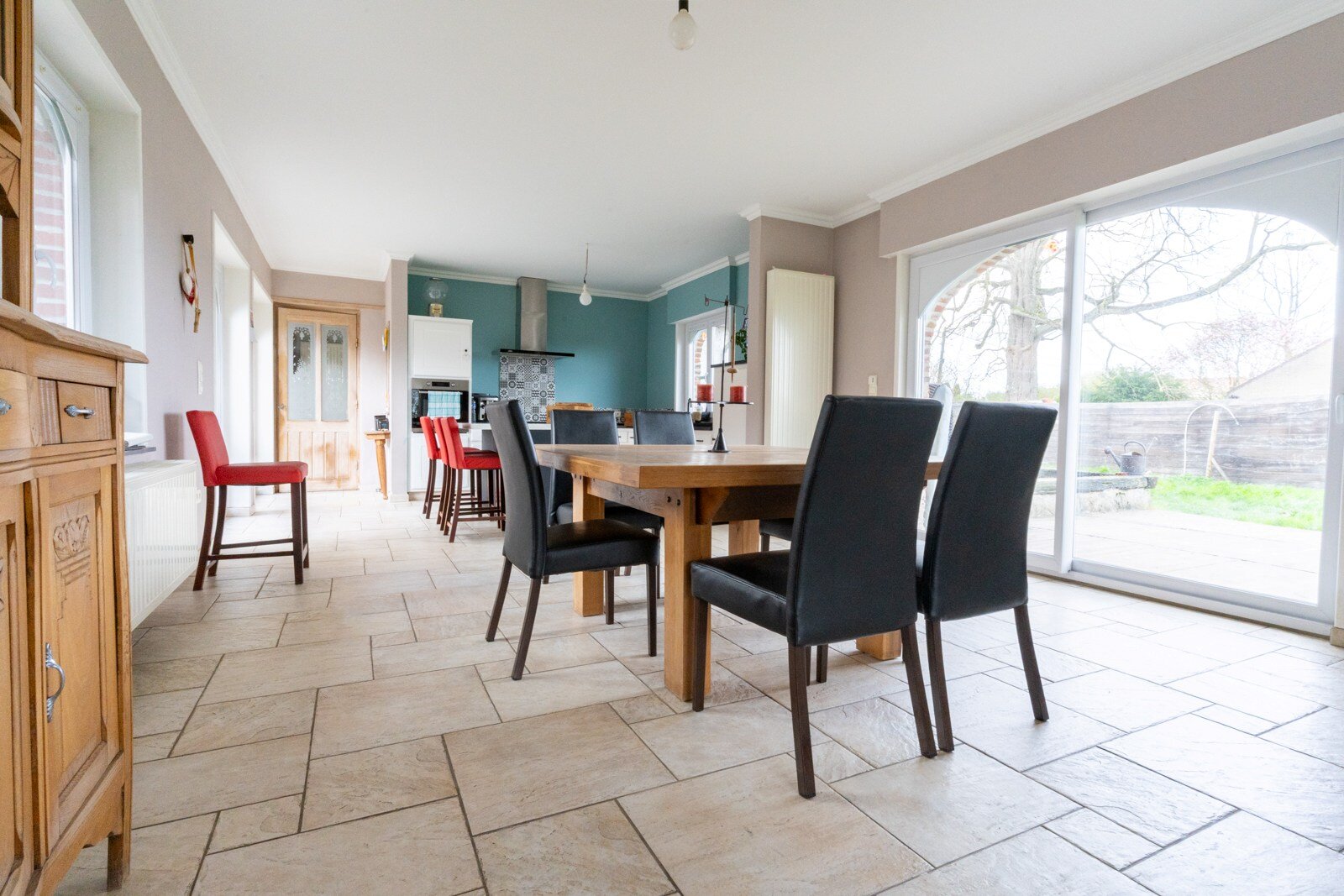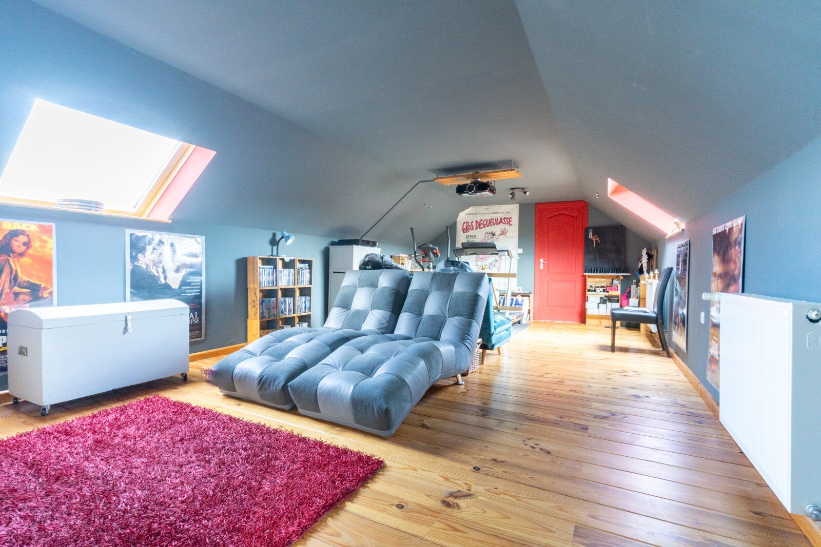 - Première annexe du corps de ferme : Grande habitation familiale desservant un hall d'entrée avec escalier apparent, un WC, un vaste et lumineux séjour de +/- 60m² (salon avec feu à bois, salle à manger), une cuisine équipée ouverte, un second coin repas séparé, une buanderie. A l'étage, un grand hall de nuit, trois à quatre chambres, une grande pièce actuellement aménagée en salle de cinéma, aménageable en fonction des besoins futurs.