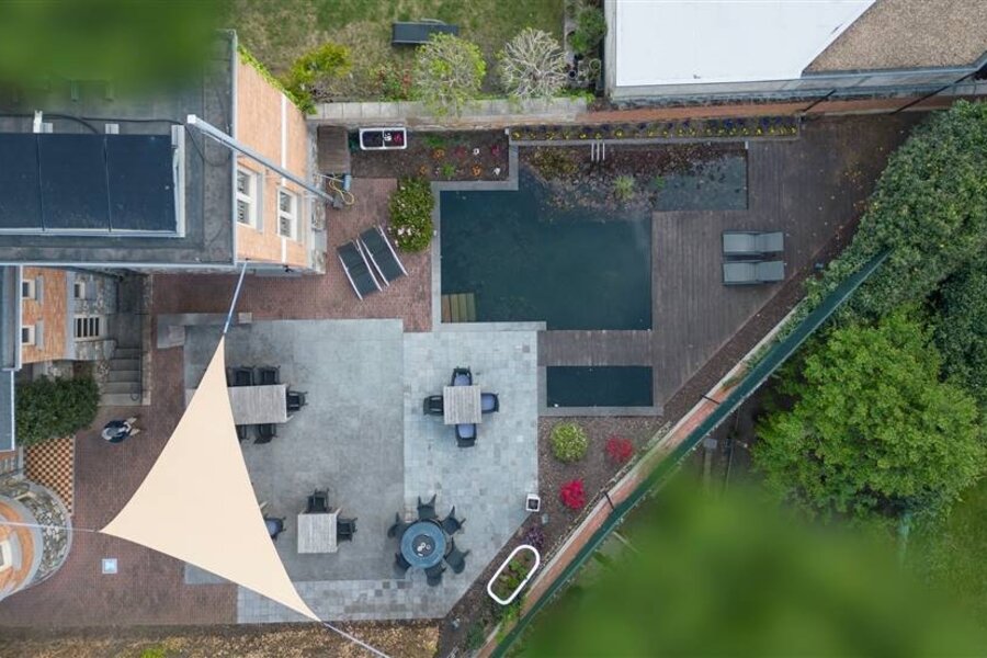Une oasis privée attend les visiteurs autour de la villa. Un jardin attrayant et une terrasse ensoleillée avec un étang de baignade forment un espace extérieur accueillant, tandis que 10 places de parking sur place garantissent commodité et exclusivité.