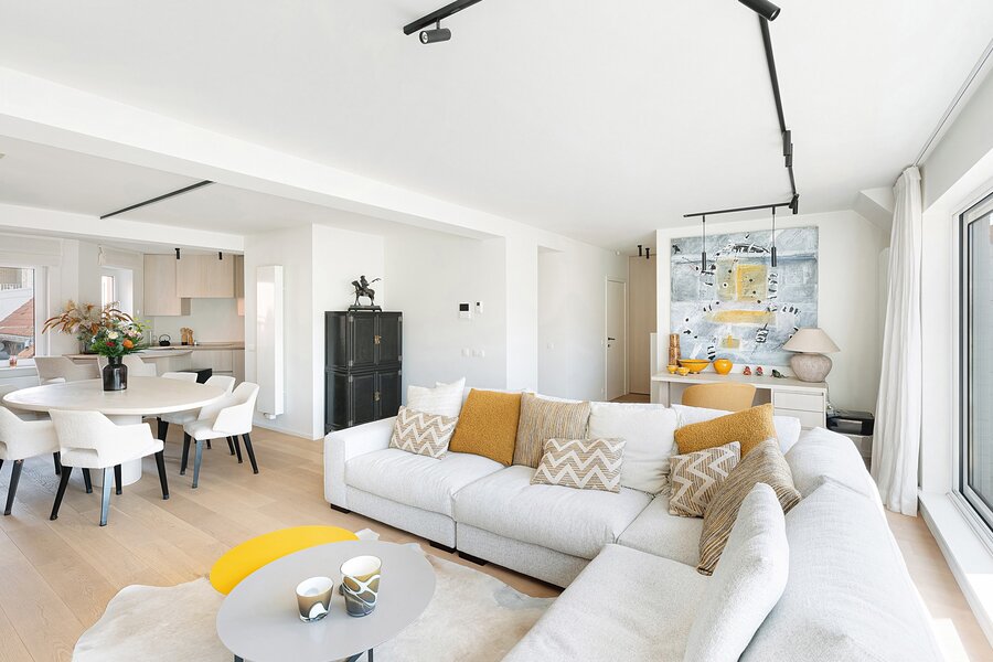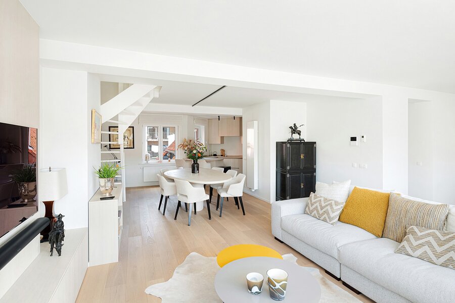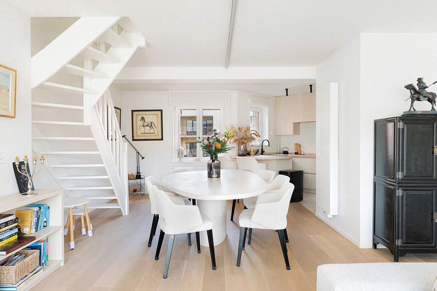 L’appartement dispose d’un spacieux et lumineux séjour au rez-de-chaussée, en parfaite continuité avec une cuisine conviviale et bien équipée. Celui-ci s’ouvre sur une grande terrasse bien orientée, idéale pour profiter du soleil en toute tranquillité.