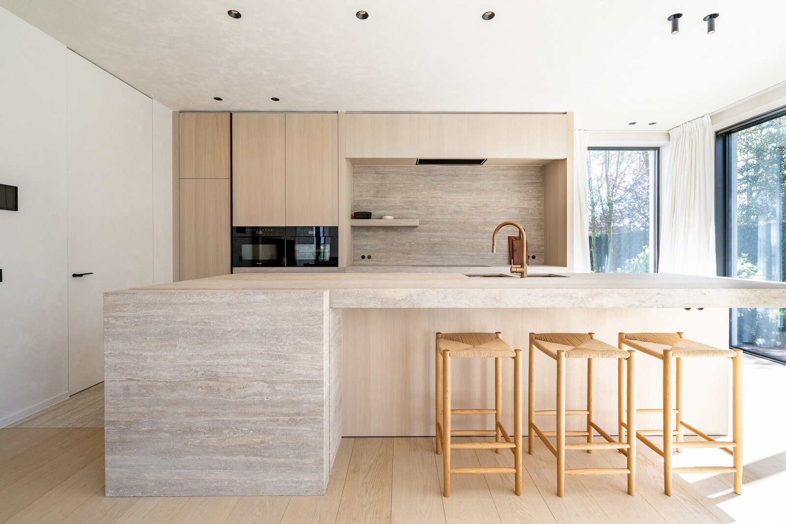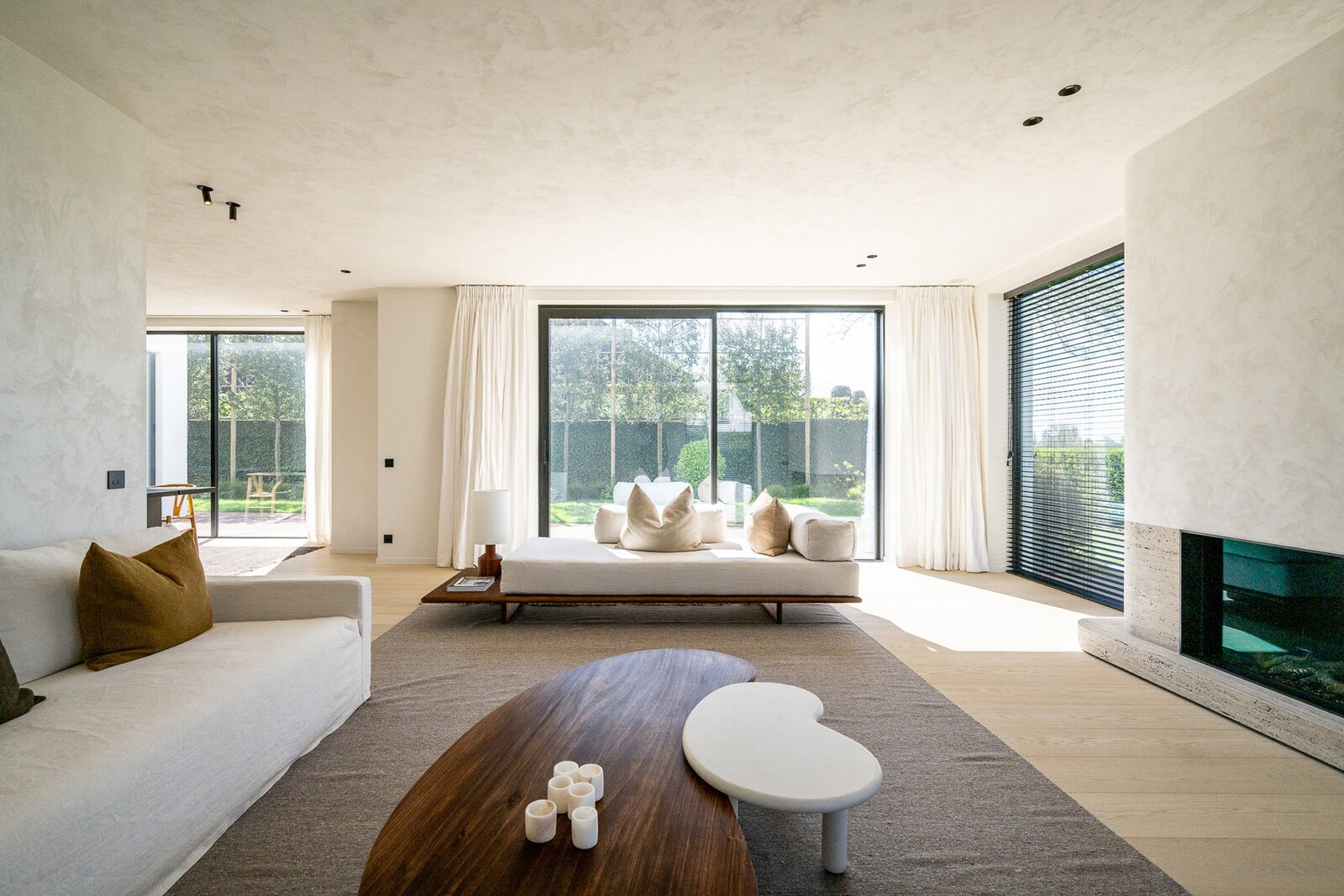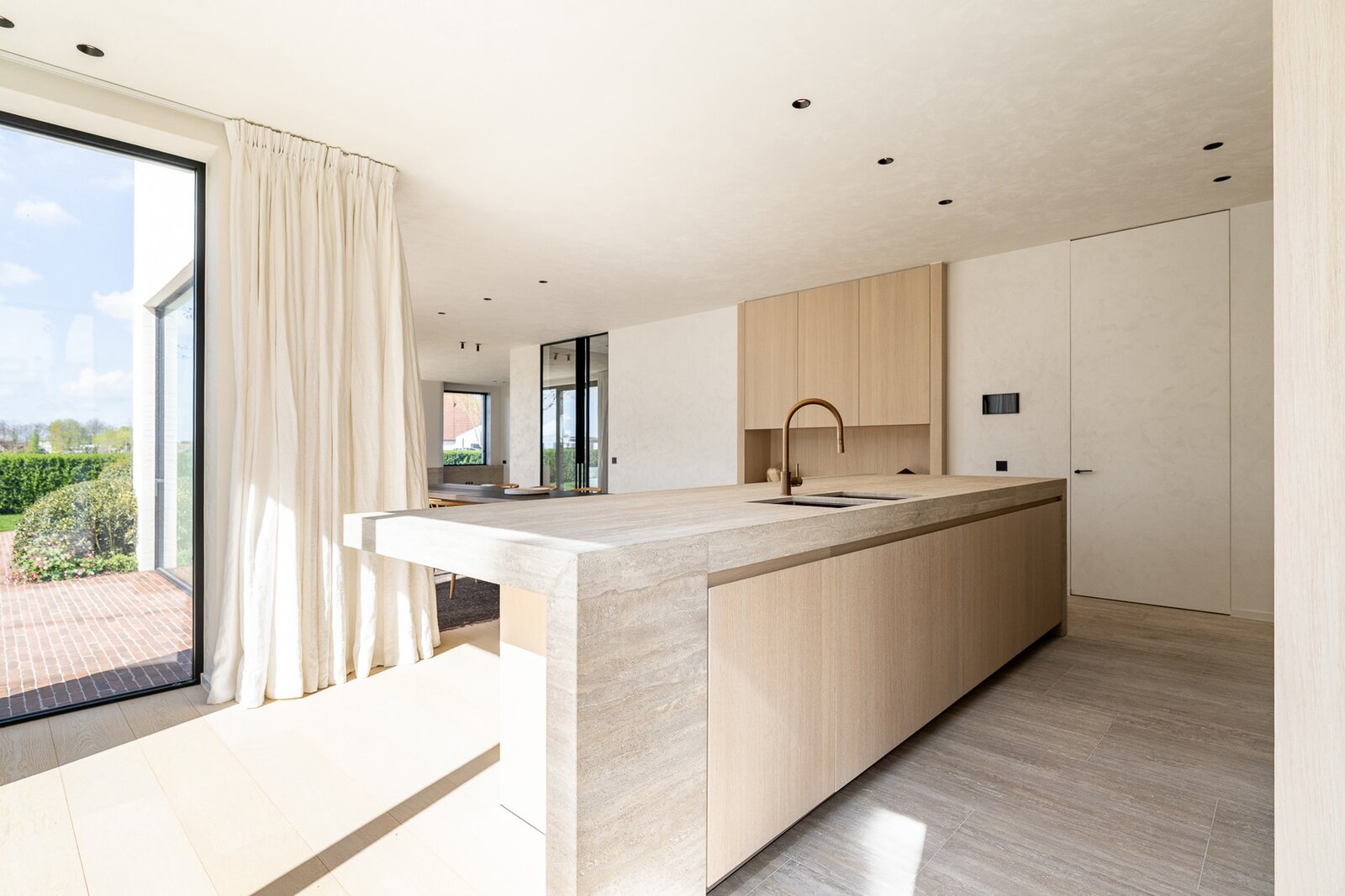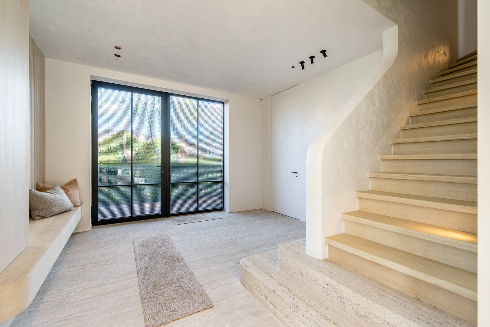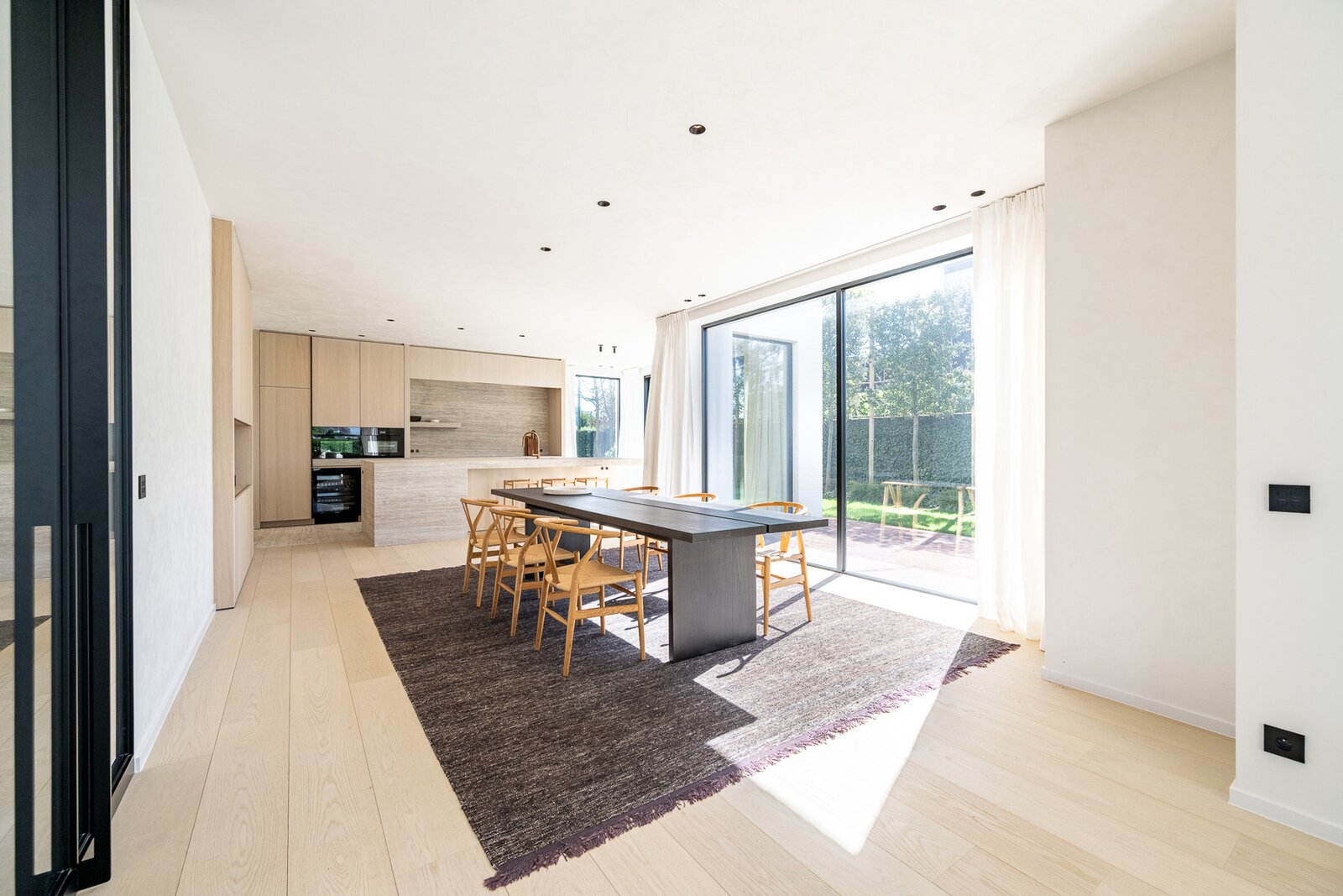 Hall d'entrée avec vestiaire et toilettes invités. Espace de vie spacieux et particulièrement lumineux comprenant un salon et une salle à manger, équipé d'une cheminée à gaz et de grandes baies vitrées donnant sur la terrasse et le jardin avec vue dégagée. Cuisine ouverte moderne et entièrement équipée avec îlot central. À côté se trouve une arrière-cuisine/buanderie pratique. Il y a également un débarras et un local technique. Garage pour une voiture et plusieurs places de stationnement à l'extérieur.