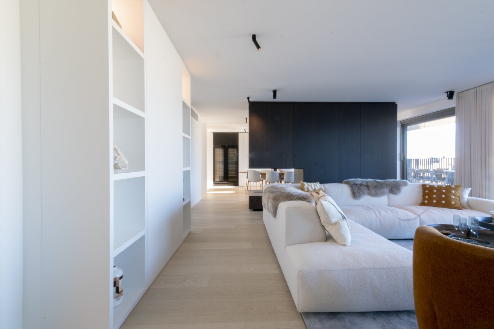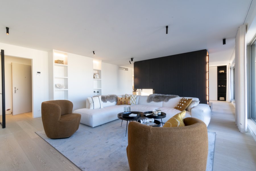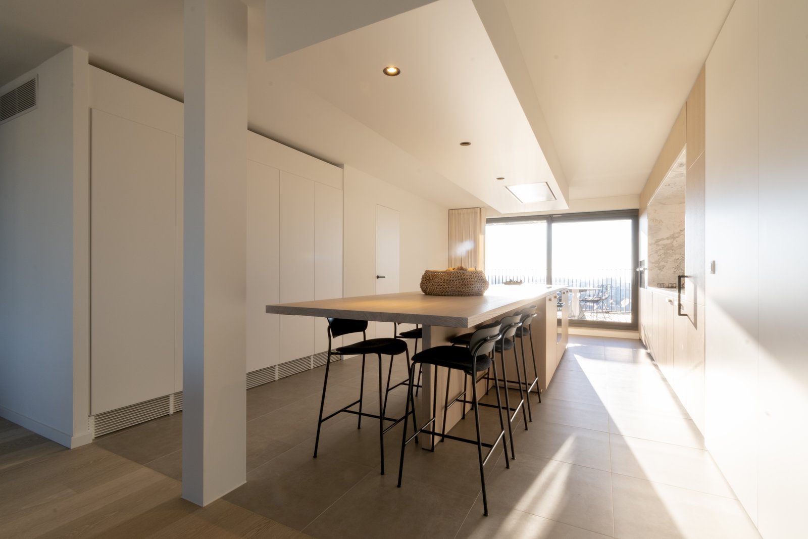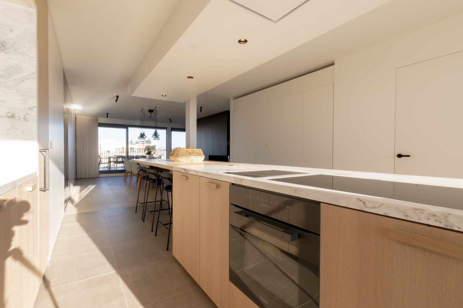 De hoogwaardige afwerking van deze penthouse is tot in de kleinste details verfijnd. De stijlvolle keuken combineert fineer en een gelakte afwerking tot een perfect geheel en is uitgerust met hoogwaardige Miele-toestellen, een werkblad in natuursteen en een ingebouwde wijnkoeler. Aansluitend bevindt zich de royale leefruimte van 71 m², waar de ingebouwde gashaard met natuurstenen sokkel een warme en elegante sfeer creëert. Kortom, een exclusieve penthouse waar luxe, comfort en een high-end design samenkomen.