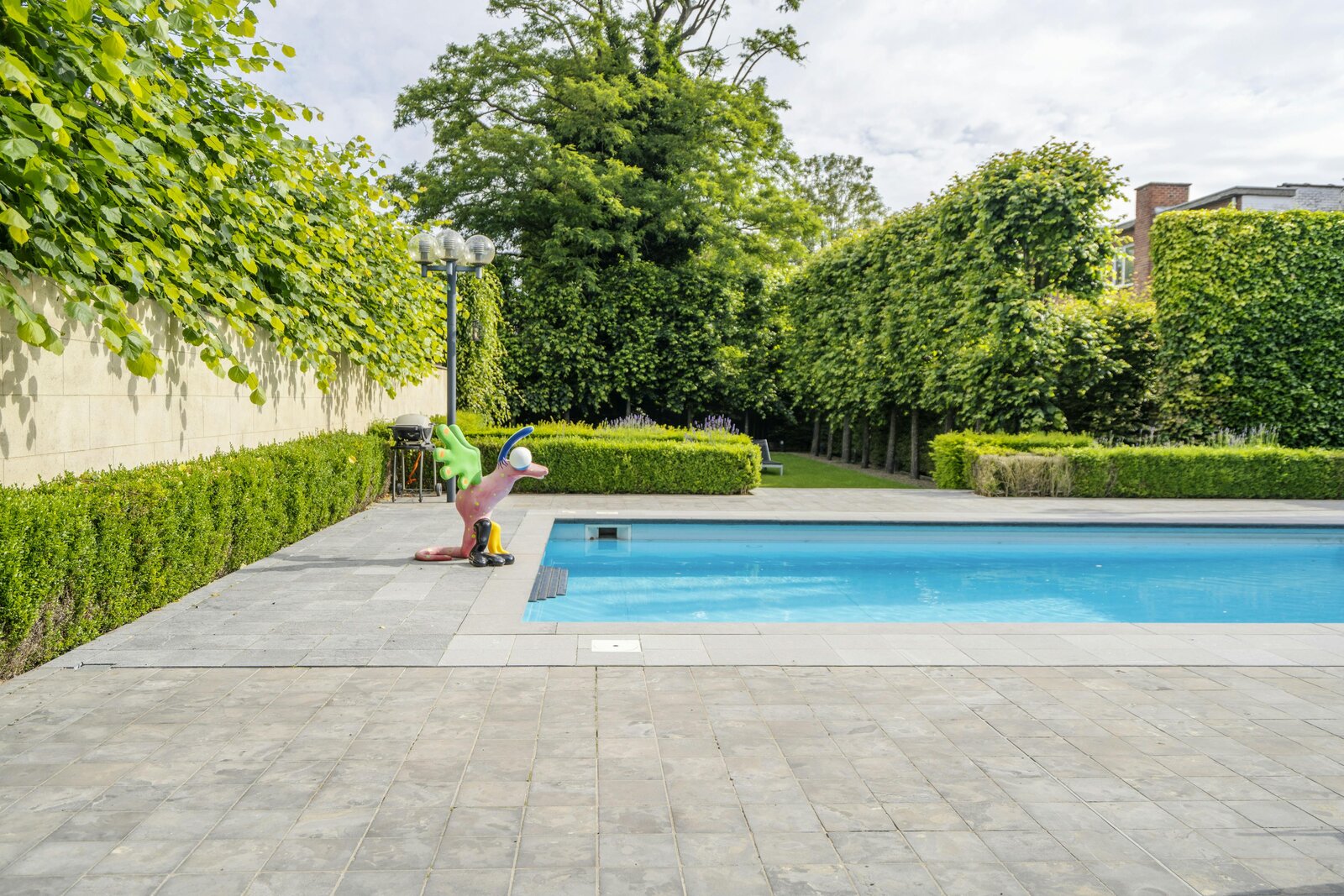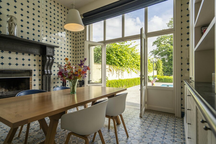 La salle à manger, le salon et la cuisine offrent une vue imprenable sur le magnifique jardin paysager. Le jardin est une oasis de paix avec une terrasse ensoleillée et une piscine propice à la détente.