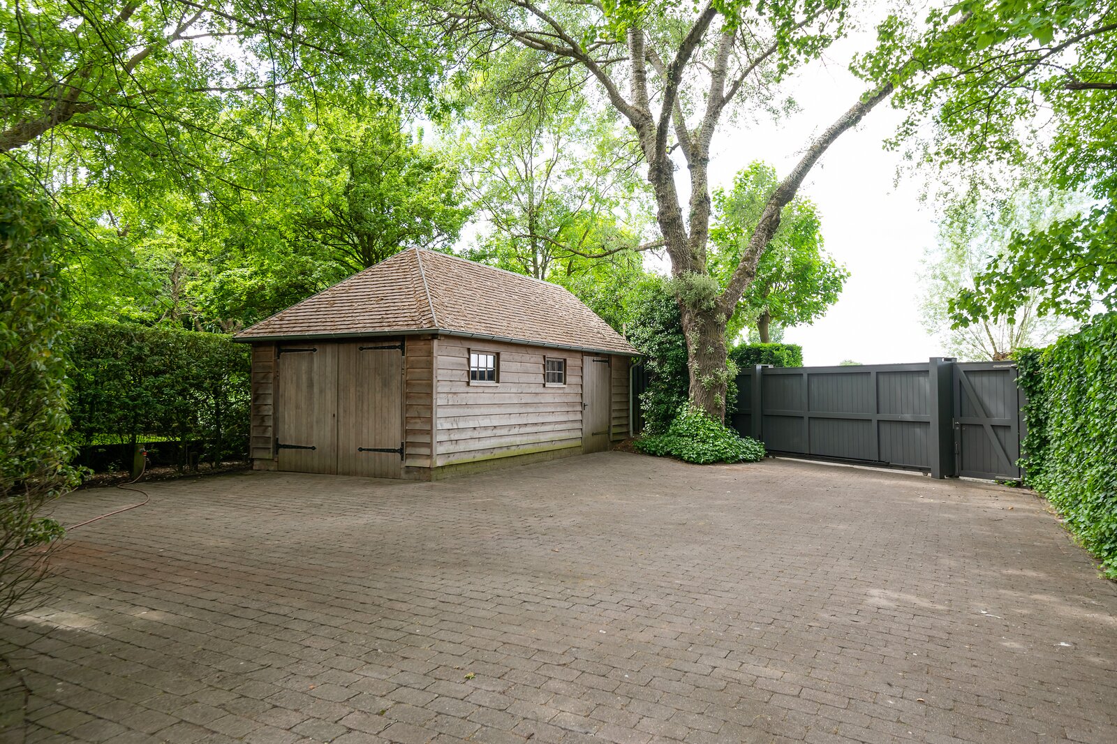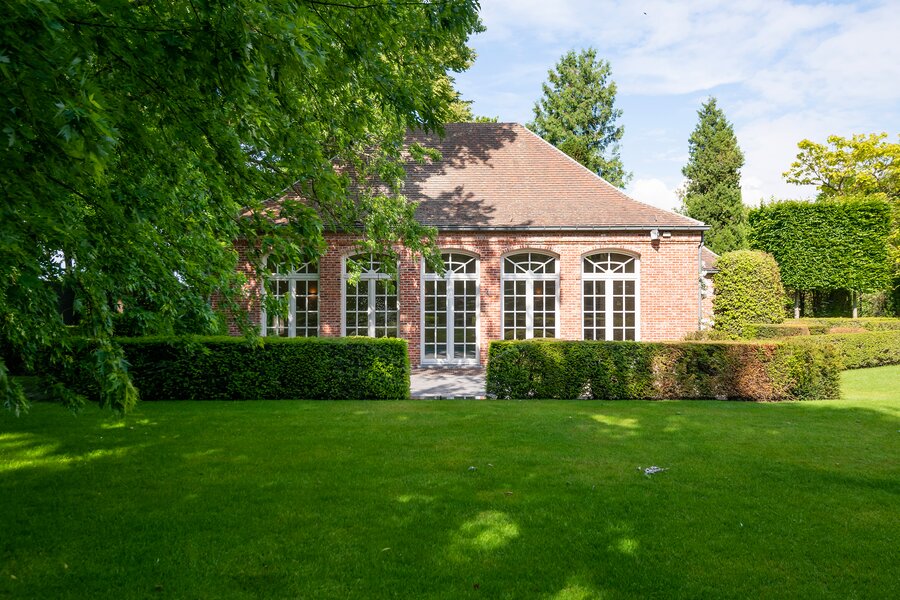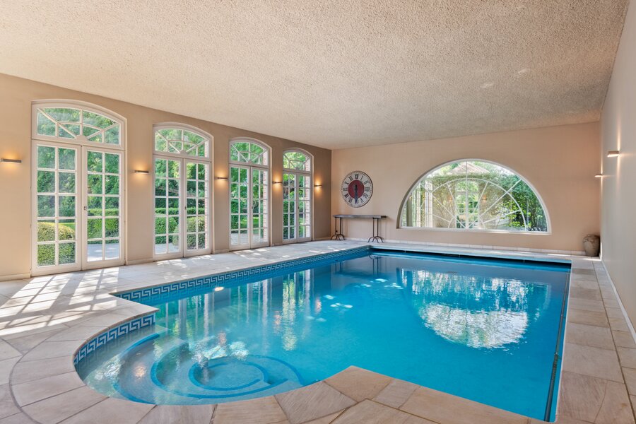 Ook buiten is het genieten. Rechts in de tuin bevindt zich een afzonderlijk bijgebouw met een prachtig binnenzwembad die voorzien is van toilette en douche. Een ideale plek om tot rust te komen of voor de kinderen. Met een totale oppervlakte van ca. 98 m² vormt dit bijgebouw een waardevolle uitbreiding van het woongenot.