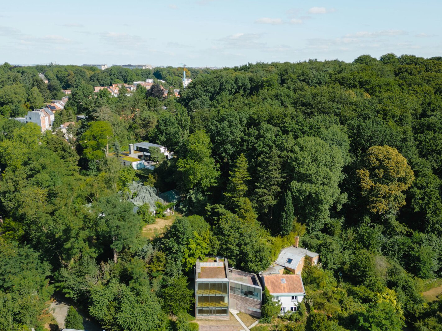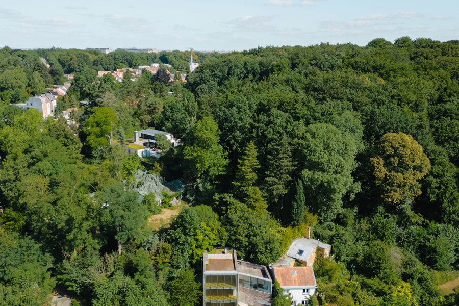 A la frontière d'Uccle et de Linkebeek, dans une rue calme jouxtant le bois de Verrewinkel, magnifique maison contemporaine signée par l'architecte Pierre Hebbelinck développant une superficie de ± 307m² (PEB) et niché sur un terrain de ± 4a26ca.