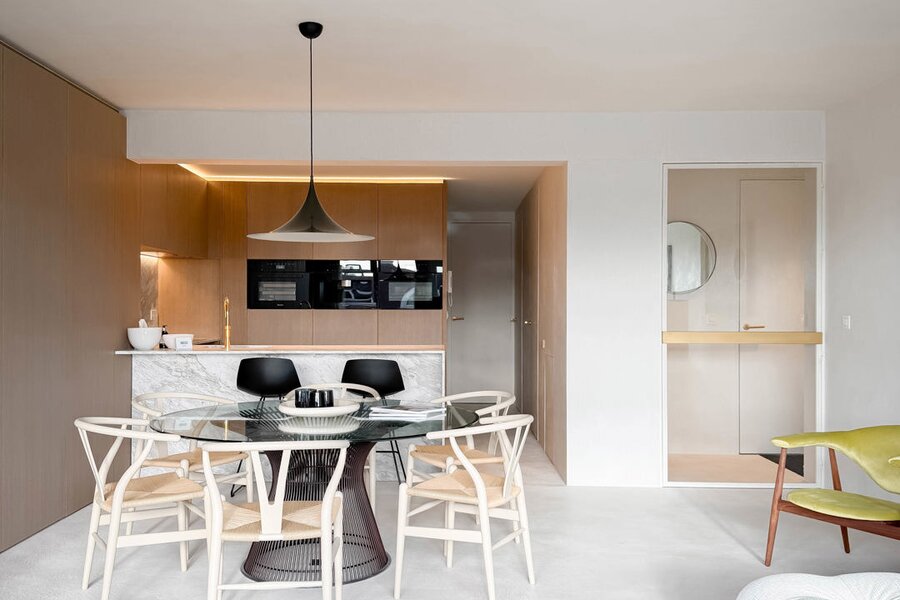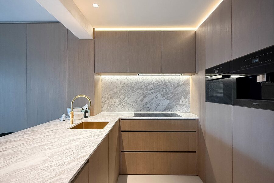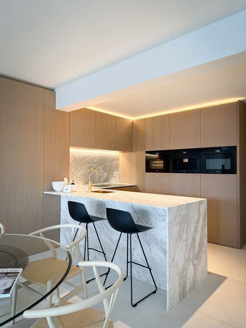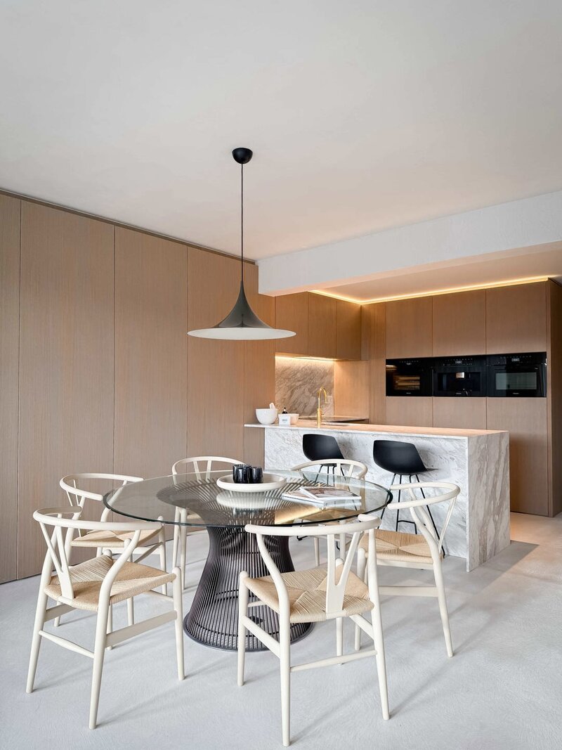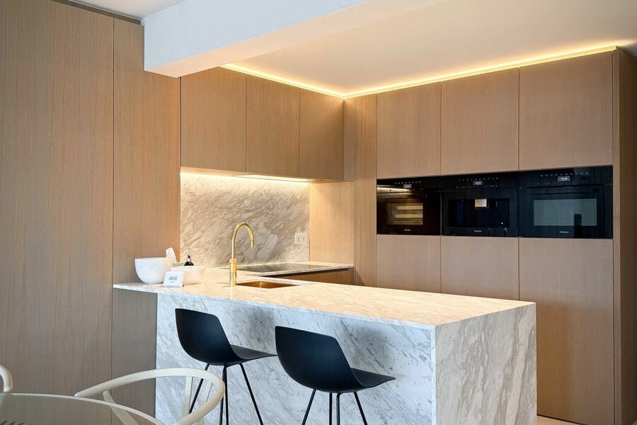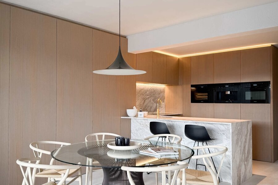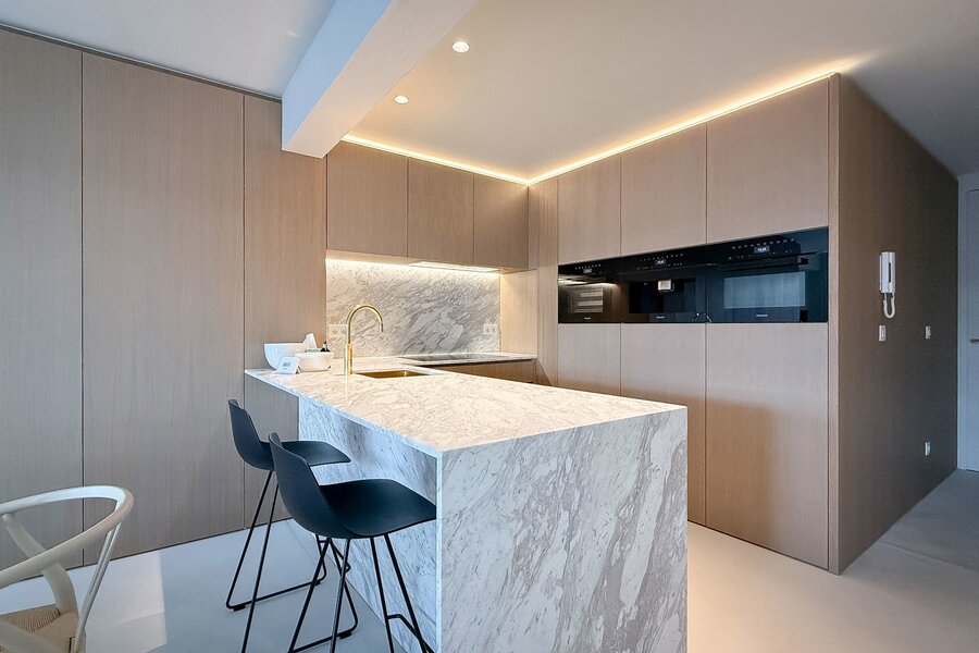 Un hall d’entrée accueillant avec vestiaire et toilettes invités vous mène à une pièce de vie baignée de lumière, grâce à ses hauts plafonds et ses grandes baies vitrées. Celle-ci offre une vue à couper le souffle et donne accès à une terrasse ensoleillée. Le séjour comprend un coin salon confortable et un espace repas raffiné. La cuisine ouverte, adjacente, est entièrement équipée avec des appareils Miele de qualité supérieure et comprend un îlot pratique avec un coin petit-déjeuner.
