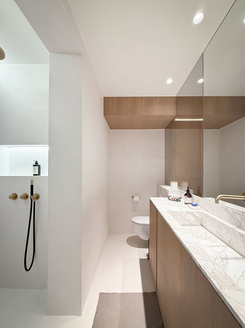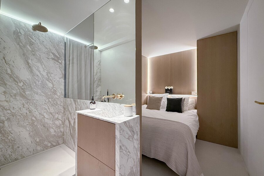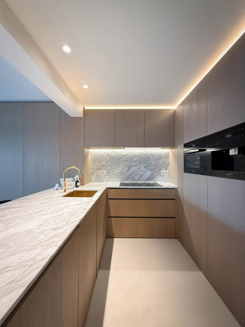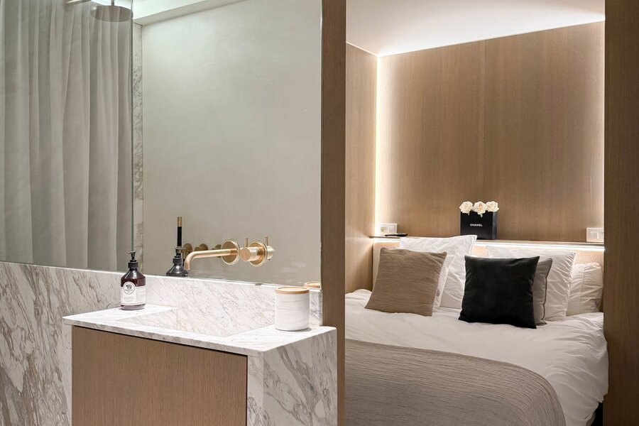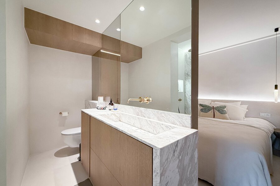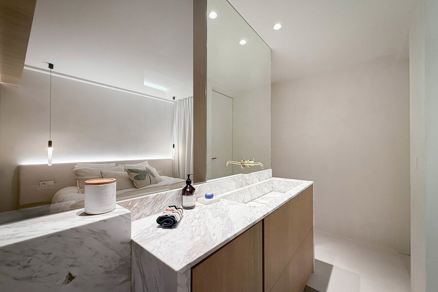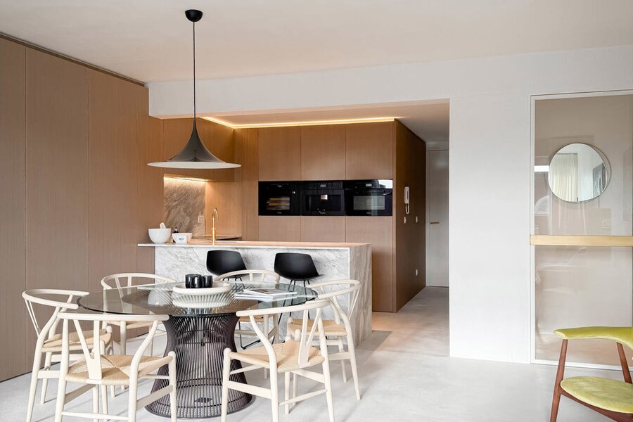 Un hall d’entrée accueillant avec vestiaire et toilettes invités vous mène à une pièce de vie baignée de lumière, grâce à ses hauts plafonds et ses grandes baies vitrées. Celle-ci offre une vue à couper le souffle et donne accès à une terrasse ensoleillée. Le séjour comprend un coin salon confortable et un espace repas raffiné. La cuisine ouverte, adjacente, est entièrement équipée avec des appareils Miele de qualité supérieure et comprend un îlot pratique avec un coin petit-déjeuner.