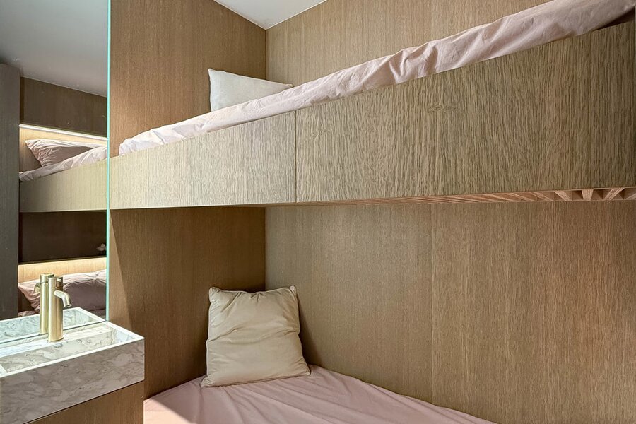 Un débarras séparé avec raccordements pour machine à laver et sèche-linge ajoute au confort. Le couloir de nuit mène à trois chambres élégantes. La chambre principale dispose d'une salle de douche privative avec lavabo, douche et toilettes. Une deuxième salle de bain, équipée d'une douche, lavabo et toilettes séparées. La troisième chambre est astucieusement aménagée avec un lit superposé intégré, parfait pour des enfants ou des invités.