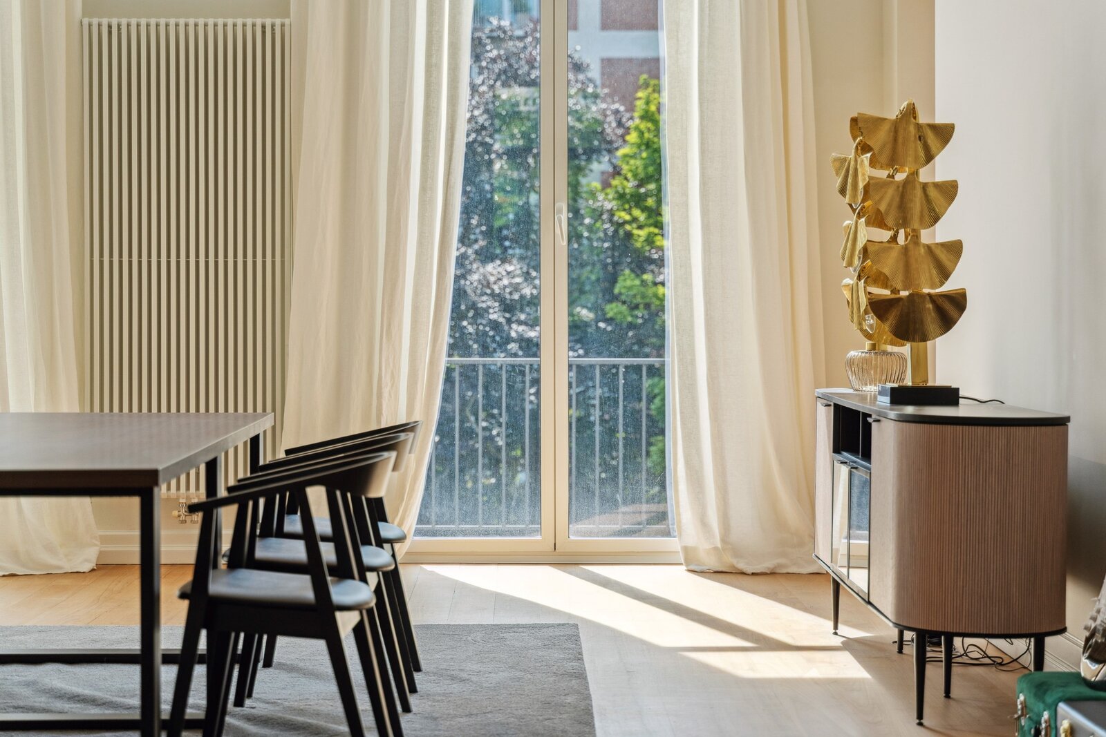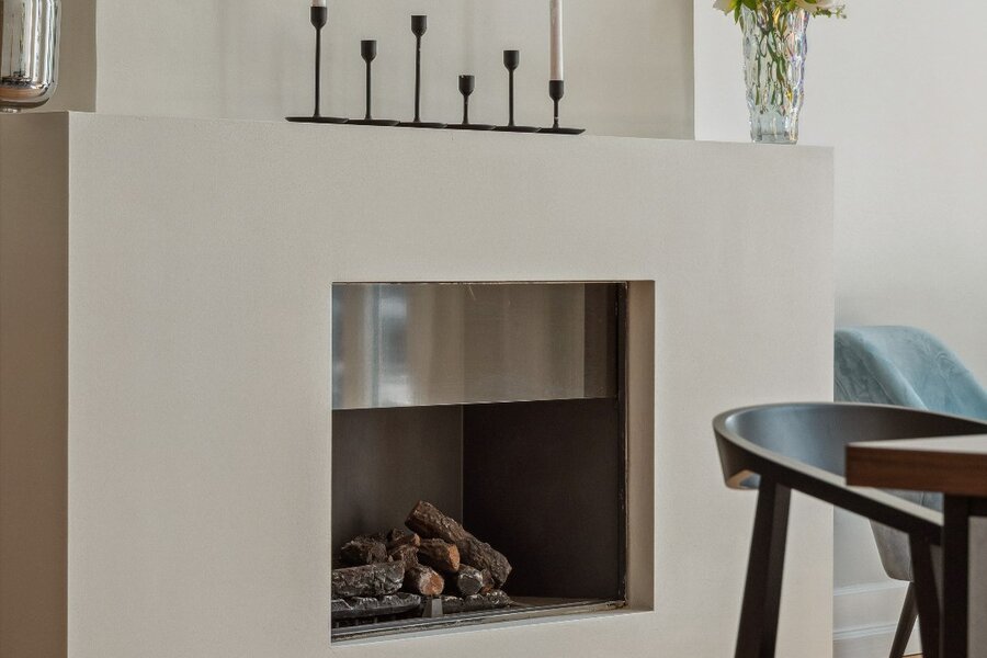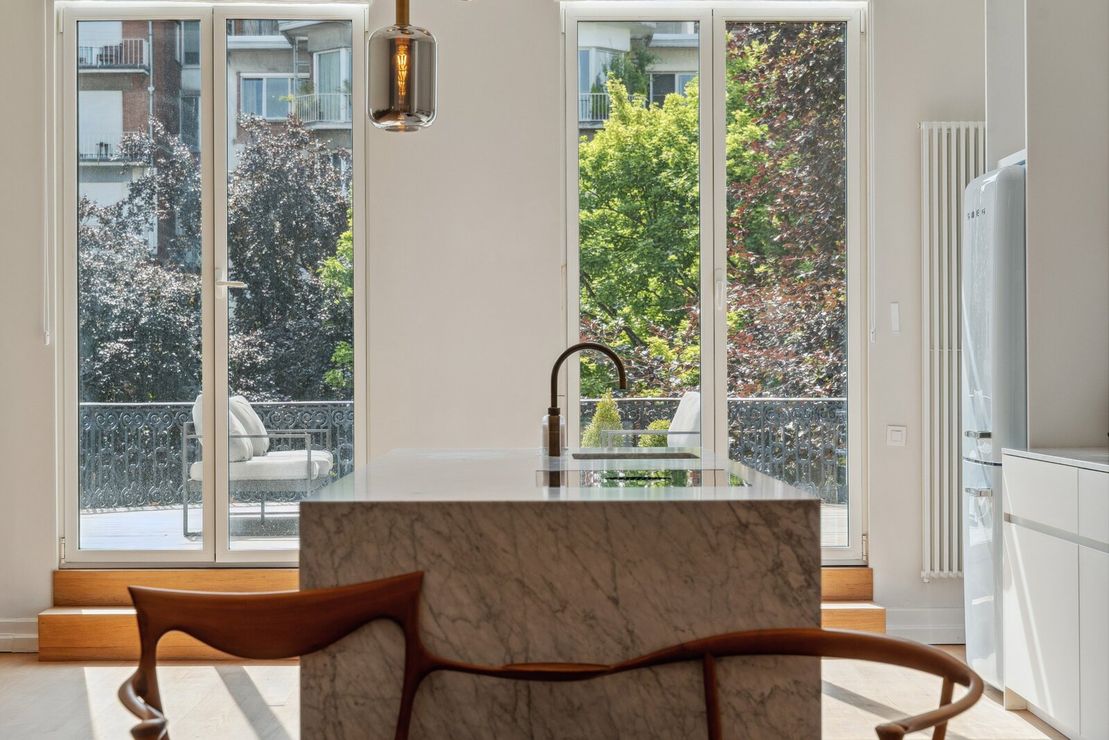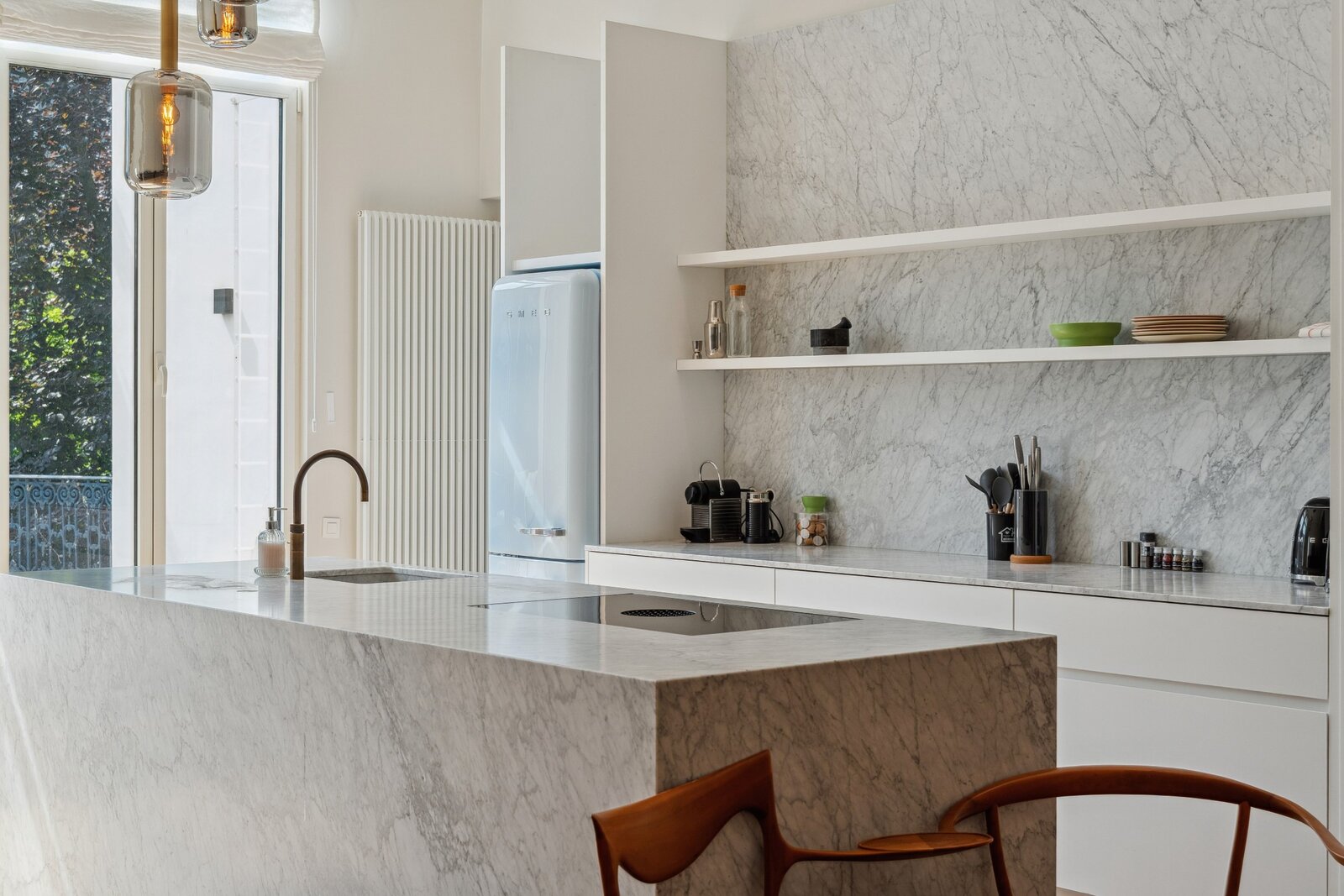 La pièce de vie séduit par ses hauts plafonds et ses grandes fenêtres qui baignent l’appartement de lumière naturelle et renforcent la sensation d’espace. Une cheminée chaleureuse constitue le point central du salon. La cuisine ouverte est un véritable atout, dotée d’un îlot central, d’équipements encastrés haut de gamme et de finitions raffinées, telles qu’un plan de travail en marbre. À côté se trouve une buanderie pratique avec raccordements pour machine à laver et sèche-linge.
