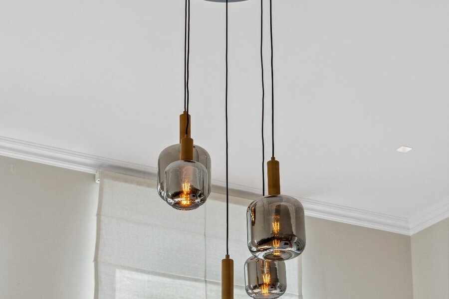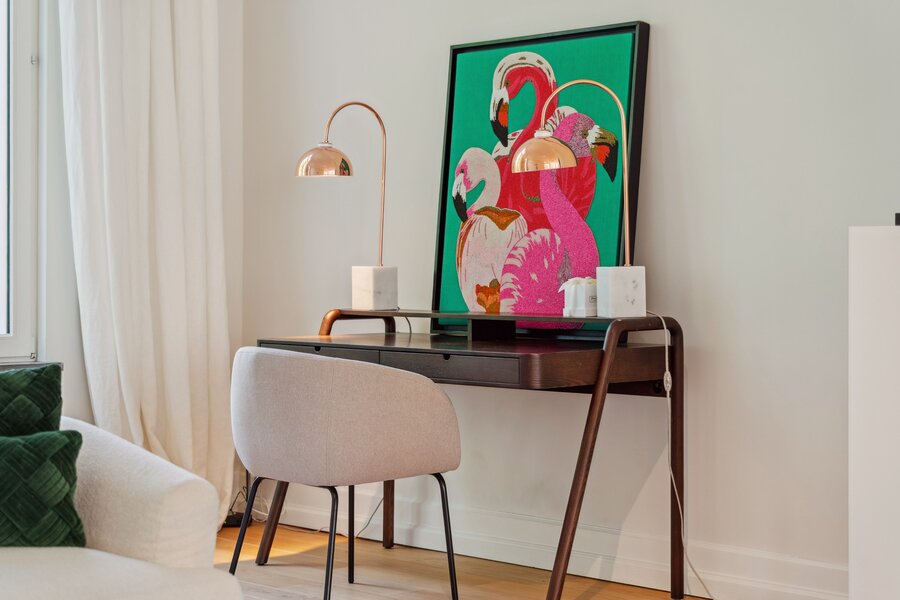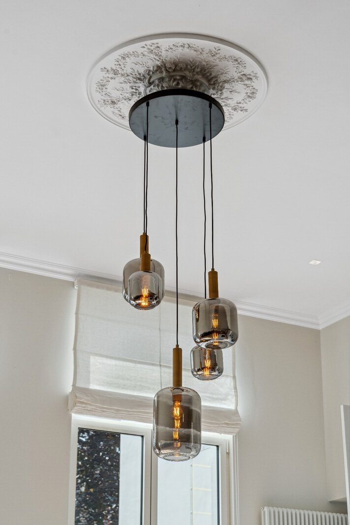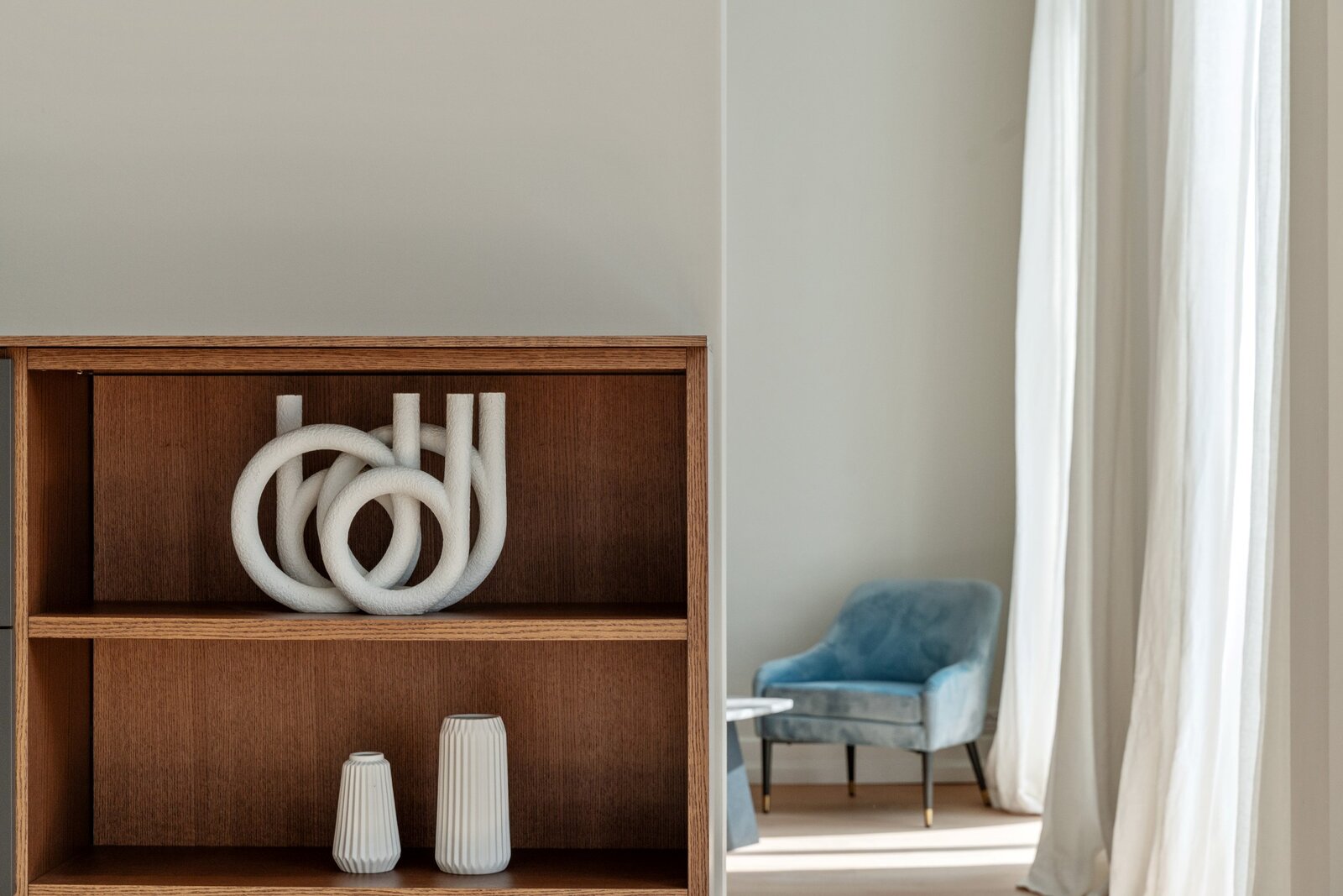 La pièce de vie séduit par ses hauts plafonds et ses grandes fenêtres qui baignent l’appartement de lumière naturelle et renforcent la sensation d’espace. Une cheminée chaleureuse constitue le point central du salon. La cuisine ouverte est un véritable atout, dotée d’un îlot central, d’équipements encastrés haut de gamme et de finitions raffinées, telles qu’un plan de travail en marbre. À côté se trouve une buanderie pratique avec raccordements pour machine à laver et sèche-linge.