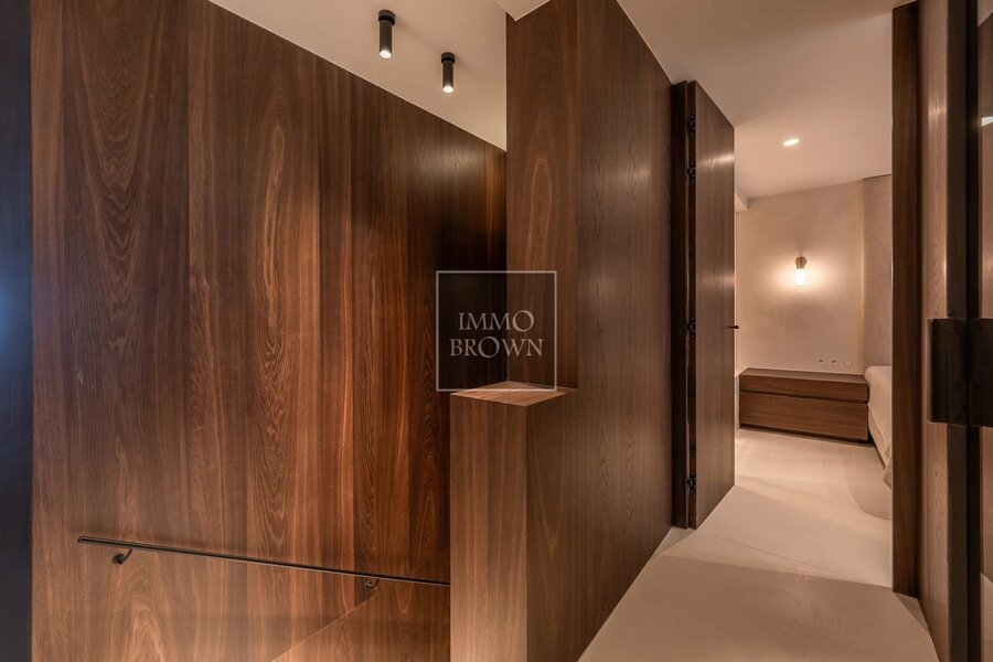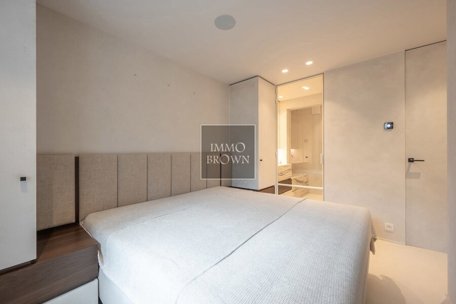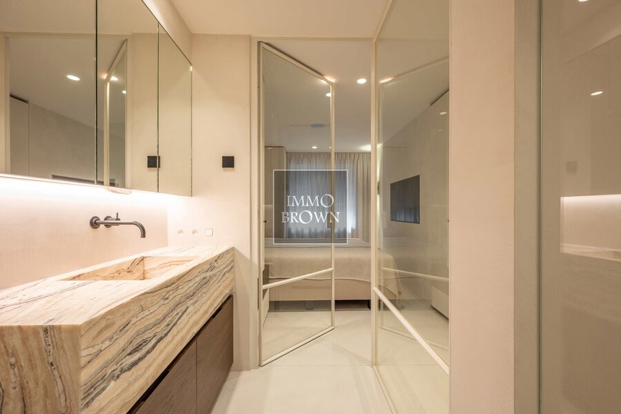 Sur ce même niveau se trouve la suite parentale, alliant confort et élégance. La salle de bains attenante est équipée d’une baignoire et d’une douche à l’italienne, toutes deux habillées de pierre naturelle raffinée. Un dressing spacieux, aménagé avec soin, prolonge la chambre et s’intègre parfaitement dans le style luxueux de l’appartement.