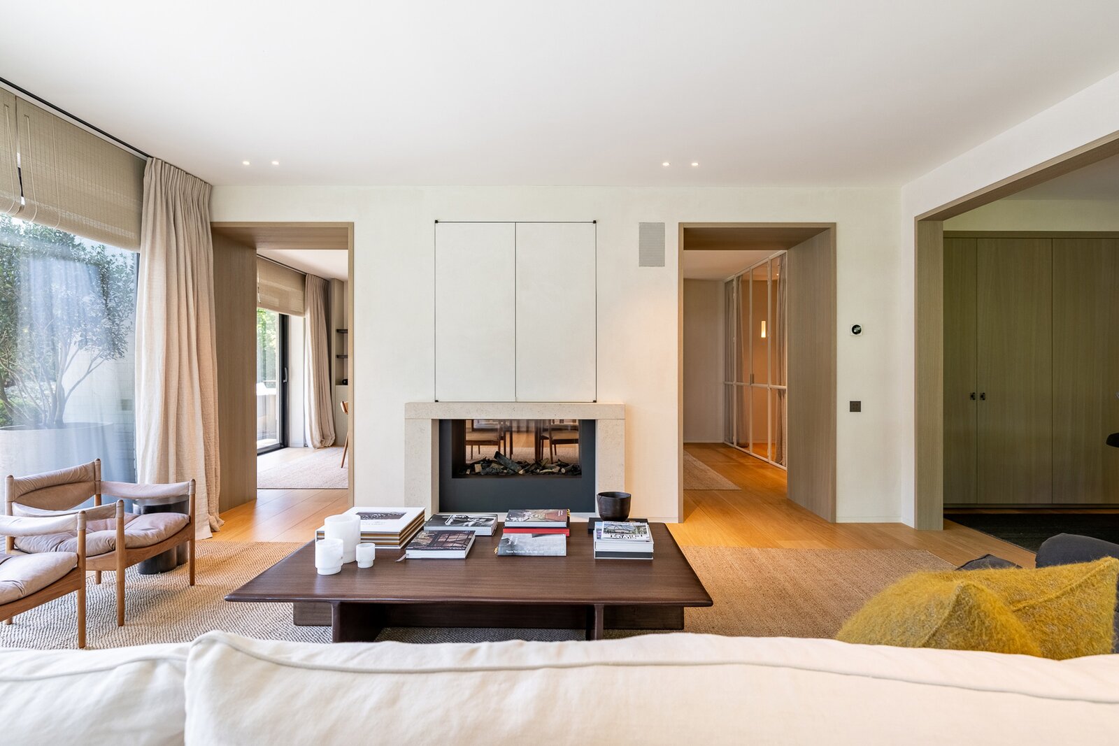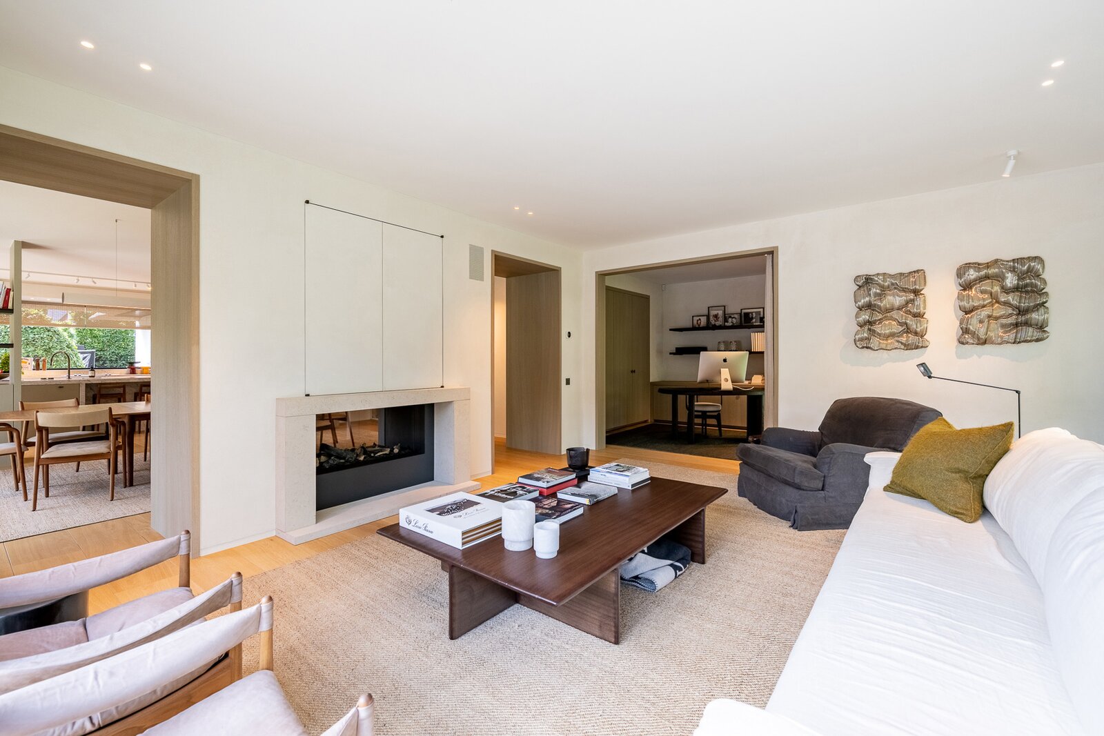 Hall d'entrée avec vestiaire et toilettes, spacieuse cuisine, salle à manger et salon ouvrant sur les terrasses. De grandes fenêtres maximisent la lumière naturelle, un feu ouvert au gaz et un bureau.