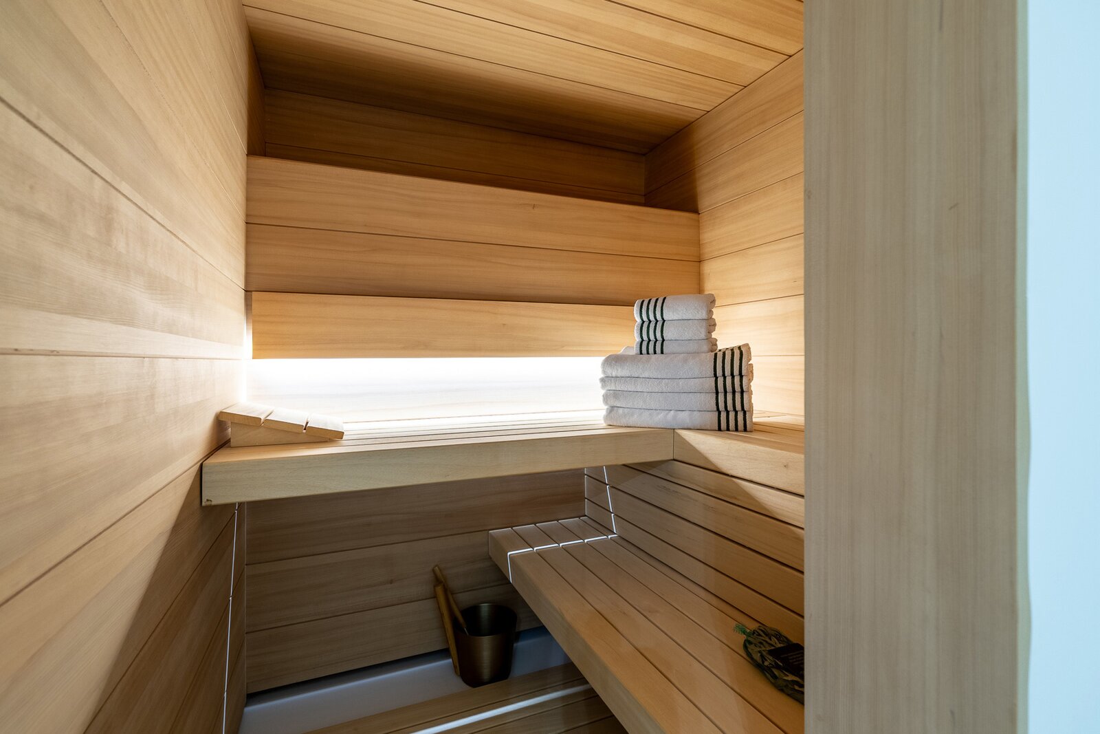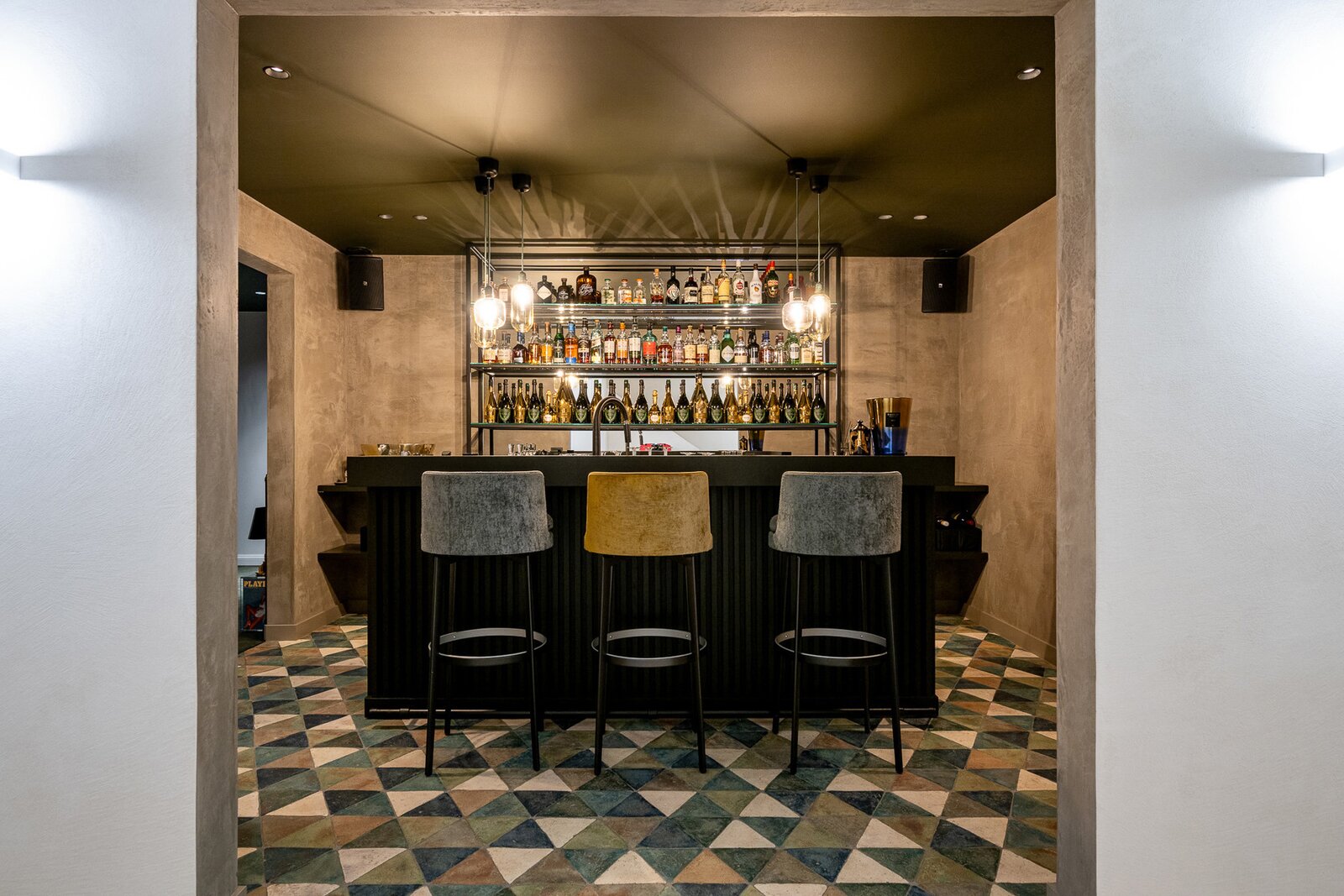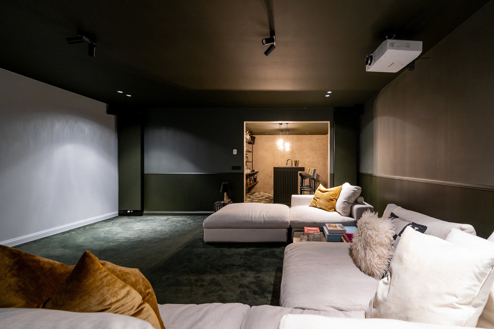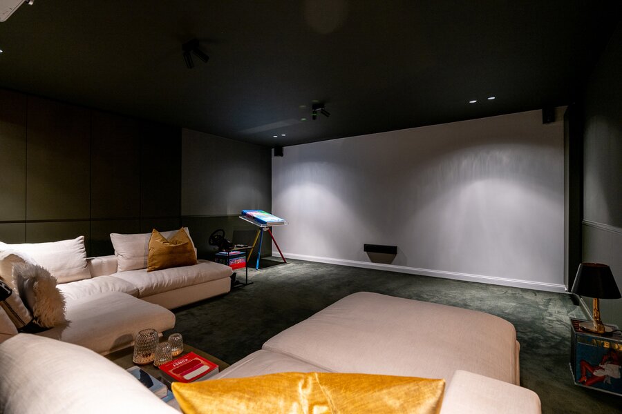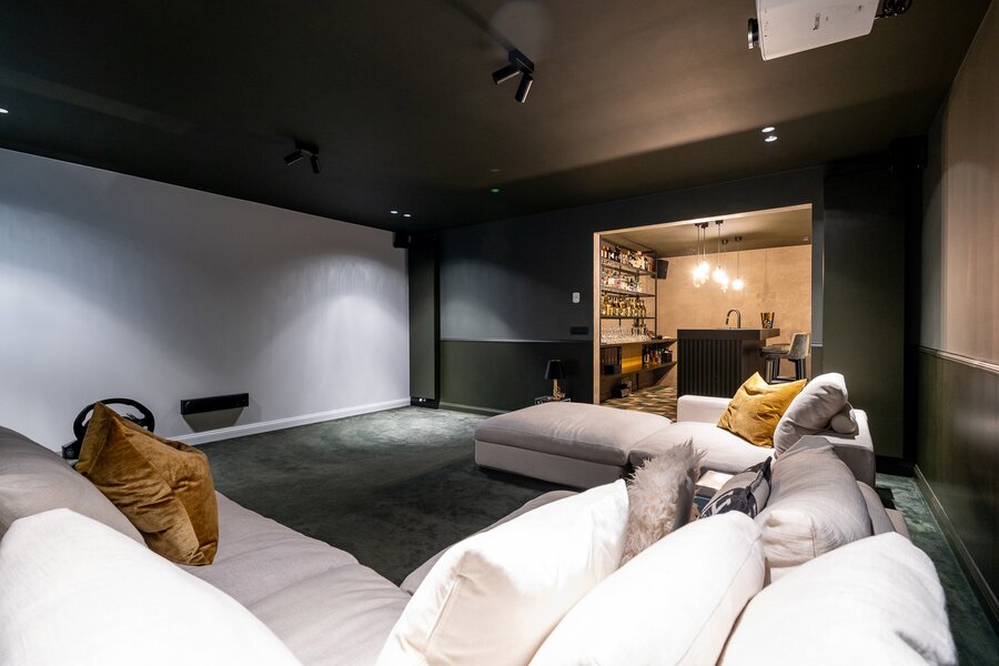 Sous-sol complet avec bar, salle de cinéma, salle de fitness et sauna, buanderie, débarras et pièces de service.