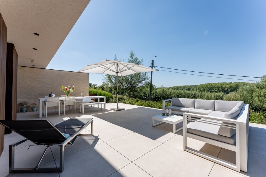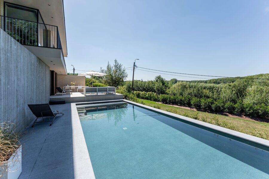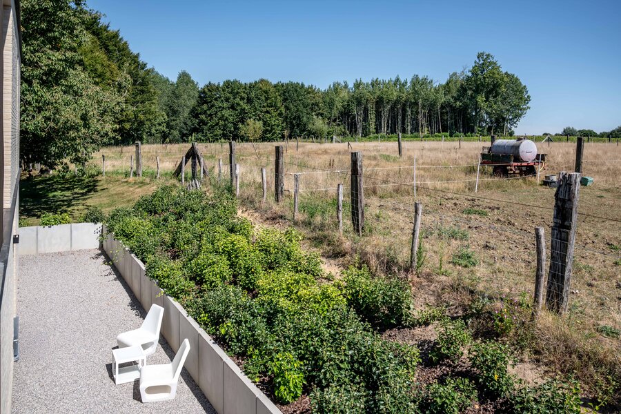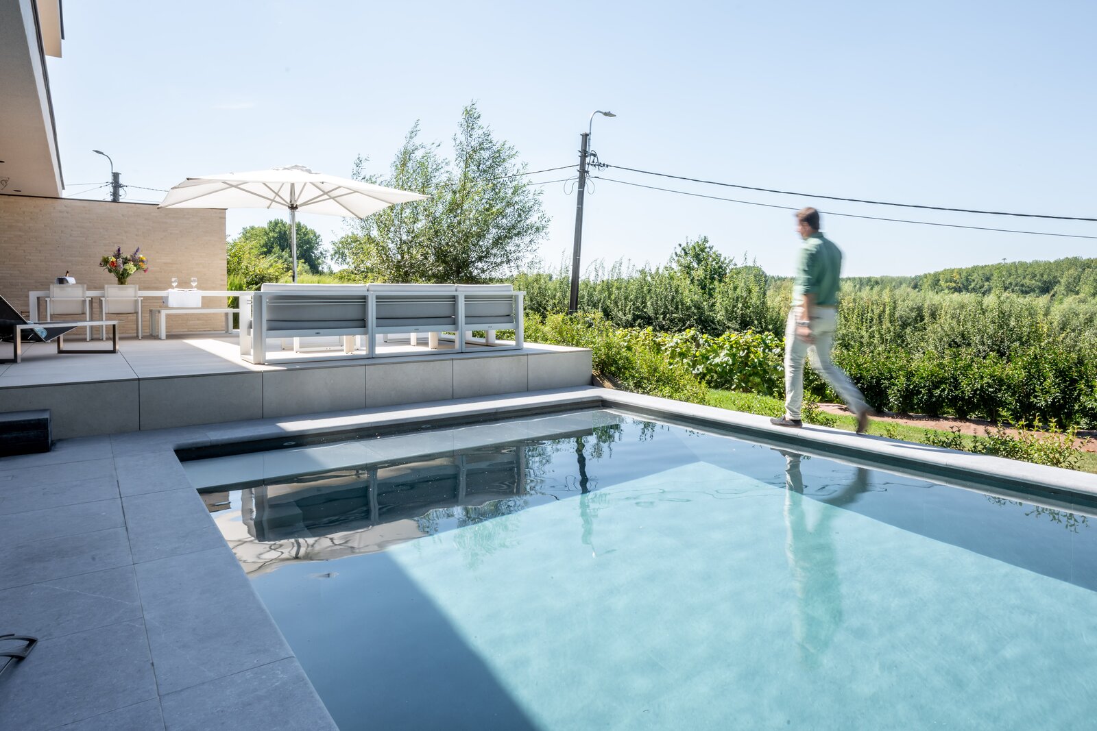 De leefruimtes kijken uit op de aangelegde tuin, waar buitenleven centraal staat. Het ruime terras en het zwembad van 10 x 4 meter, afgewerkt in natuursteen (Belgische blauwsteen), maken van deze plek een oase van rust en ontspanning. Het panoramische uitzicht over het groene landschap van Sint-Lievens-Houtem versterkt het unieke karakter van de woning.