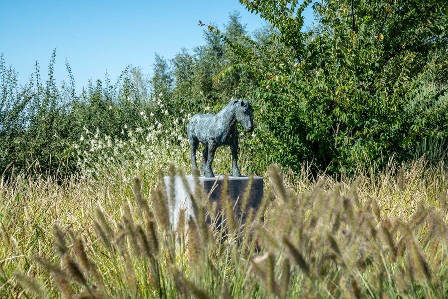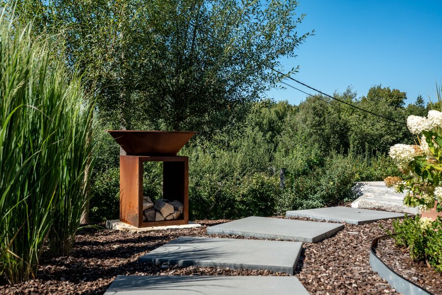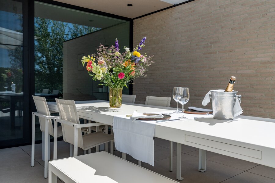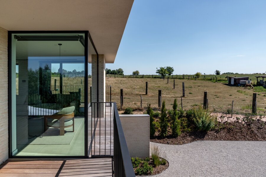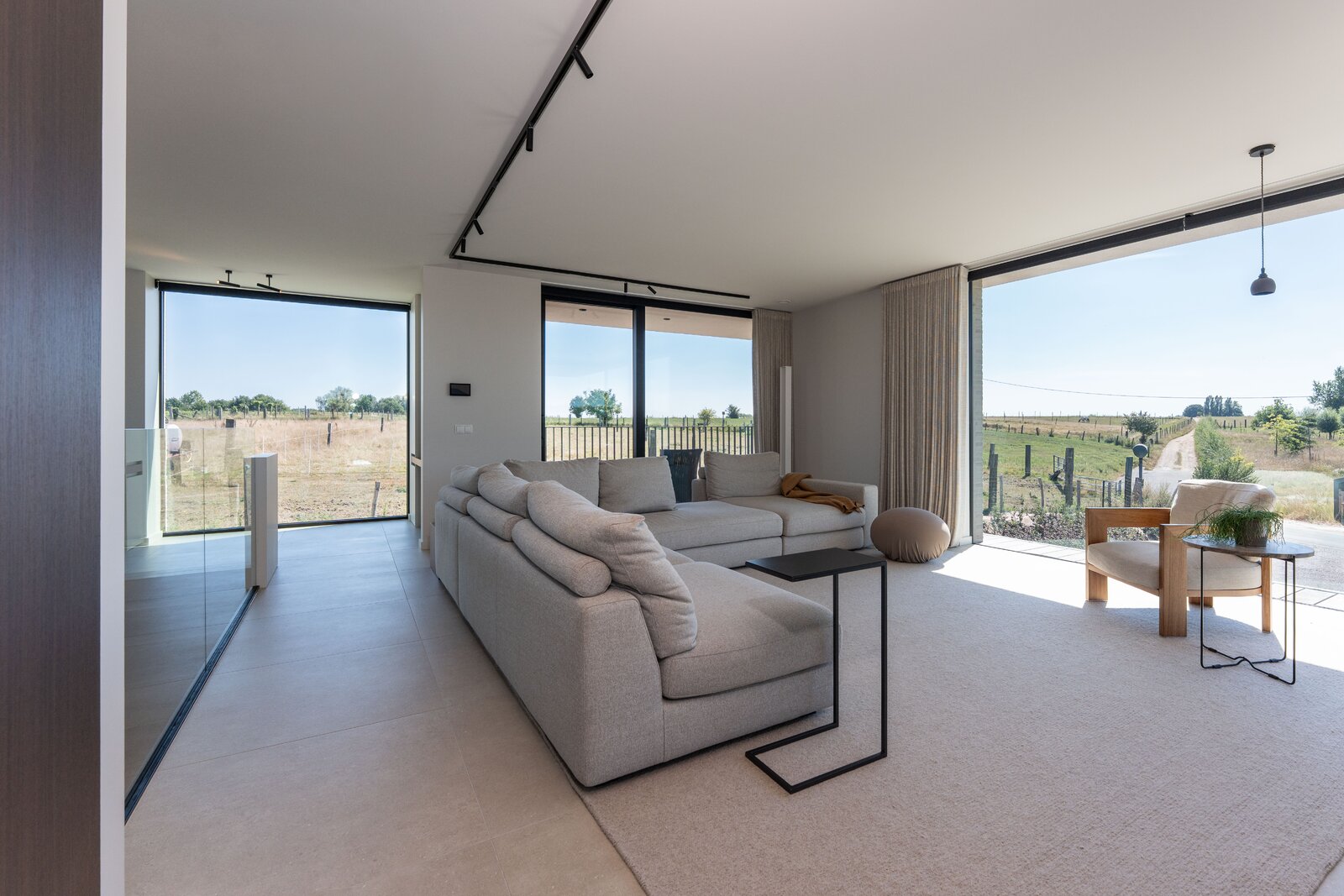 De leefruimtes kijken uit op de aangelegde tuin, waar buitenleven centraal staat. Het ruime terras en het zwembad van 10 x 4 meter, afgewerkt in natuursteen (Belgische blauwsteen), maken van deze plek een oase van rust en ontspanning. Het panoramische uitzicht over het groene landschap van Sint-Lievens-Houtem versterkt het unieke karakter van de woning.