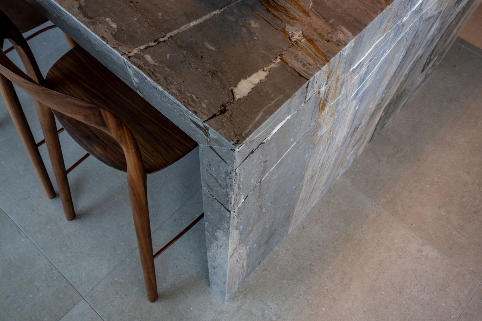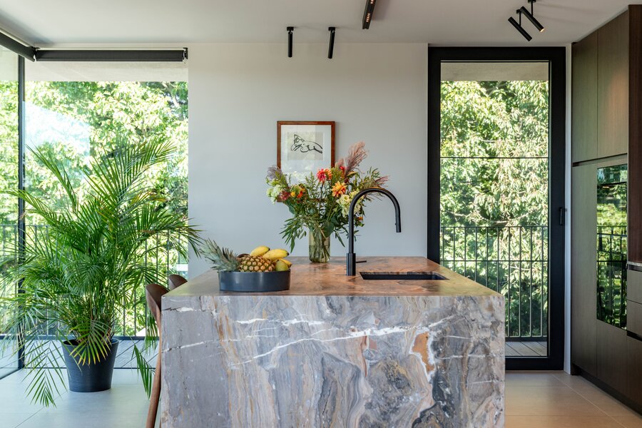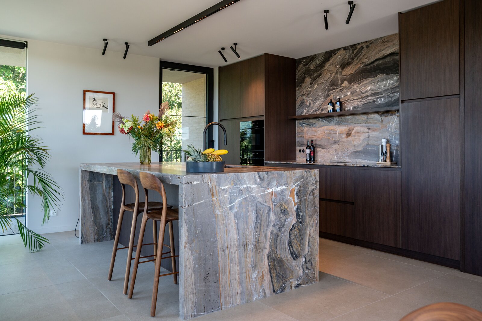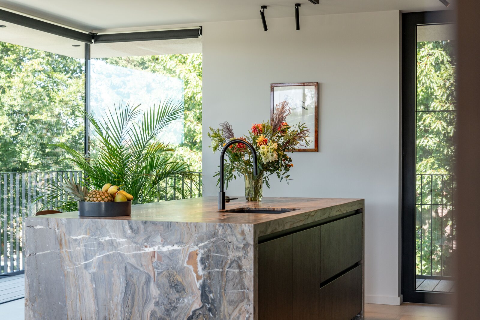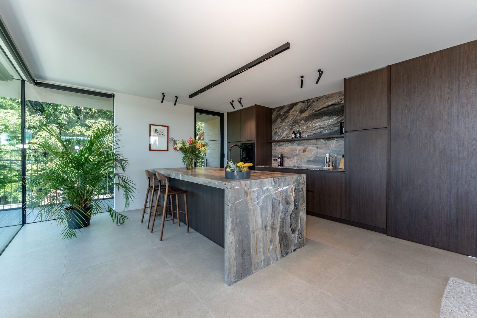 De eerste verdieping is volledig ontworpen om optimaal te genieten van licht en uitzicht. Grote raampartijen brengen het omliggende groen naar binnen en versterken het gevoel van openheid. Hier bevinden zich de lichtrijke zithoek en eethoek, die naadloos aansluiten op de keuken. Deze is uitgerust met een imposant eiland in marmer en alle moderne toestellen, terwijl een bijkeuken/berging voor extra opbergruimte zorgt. Rondom de leefruimtes zijn meerdere terrassen voorzien, en vanuit de volledige leefruimte kijkt u uit over het schilderachtige Cotthembos. Vanuit de hal bereikt u de master suite met dressing en een tweede badkamer, eveneens afgewerkt in mortex en voorzien van een douche.