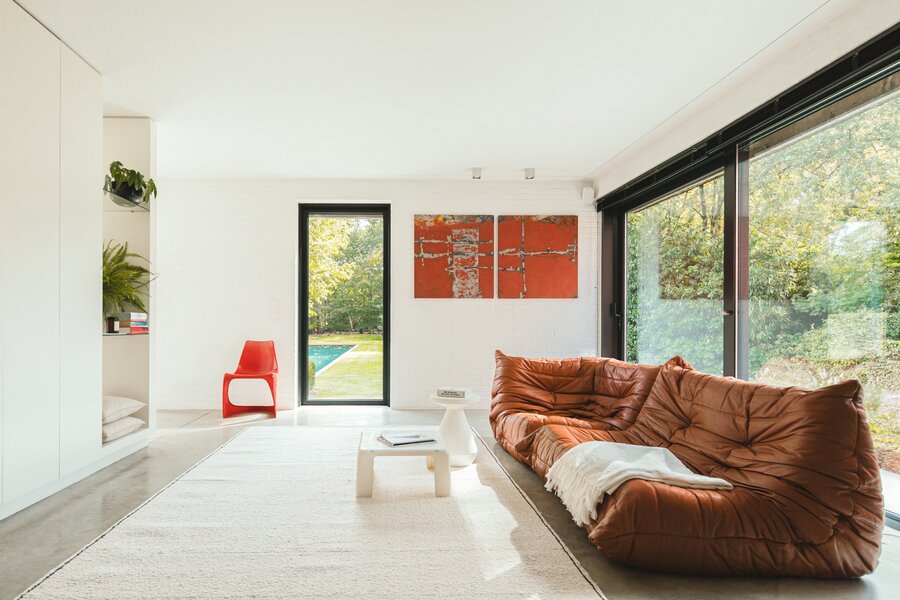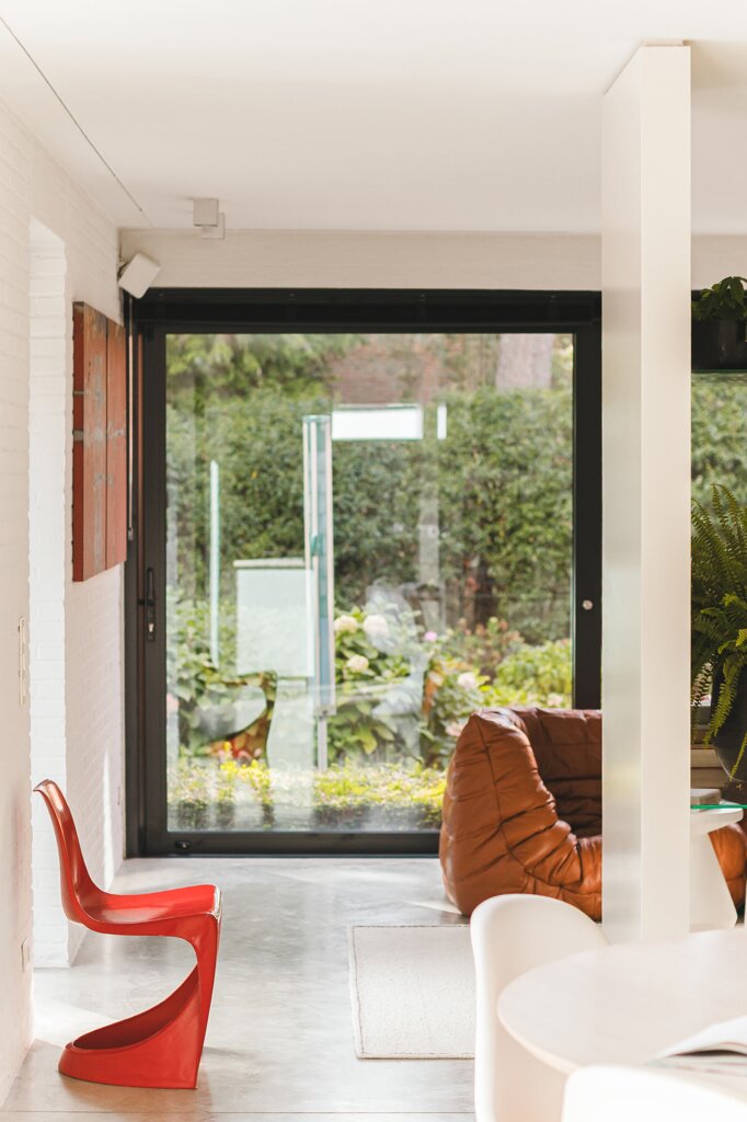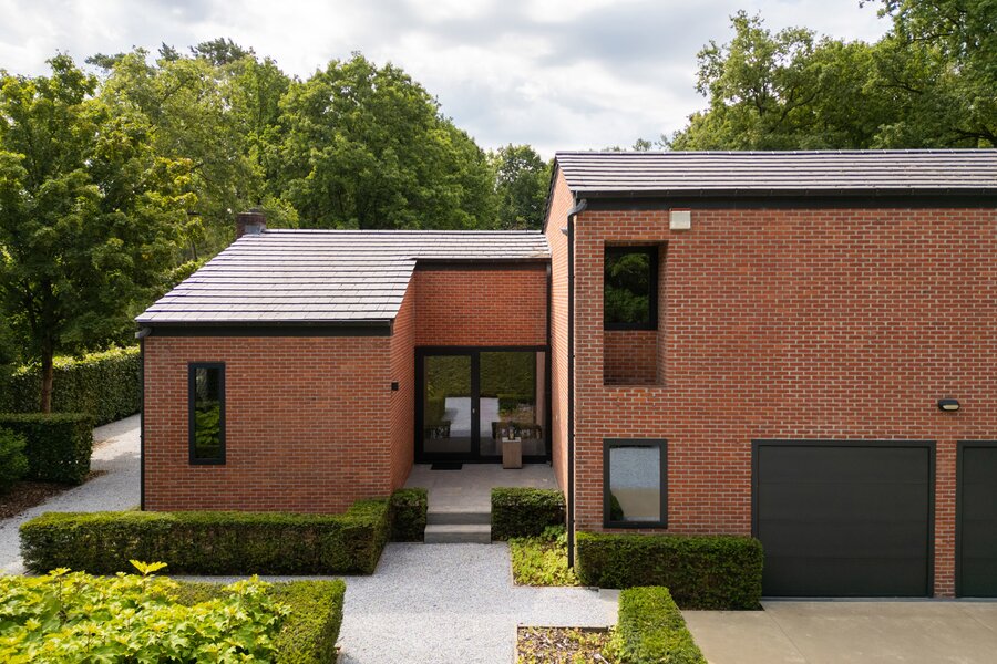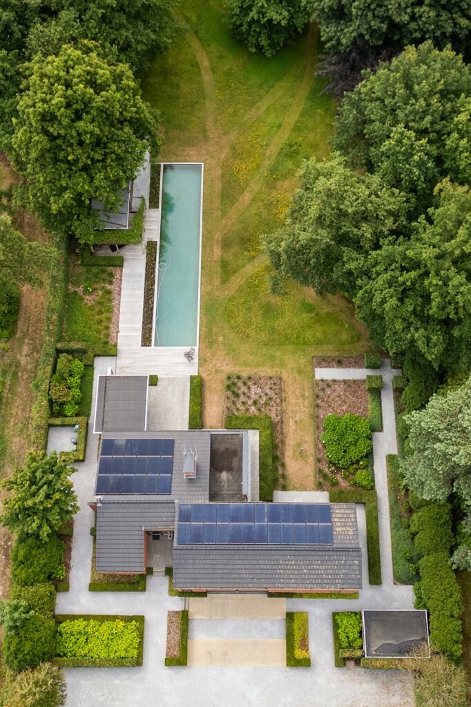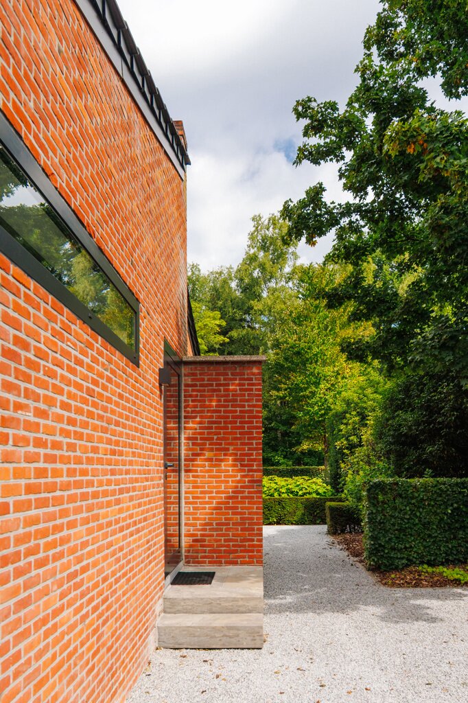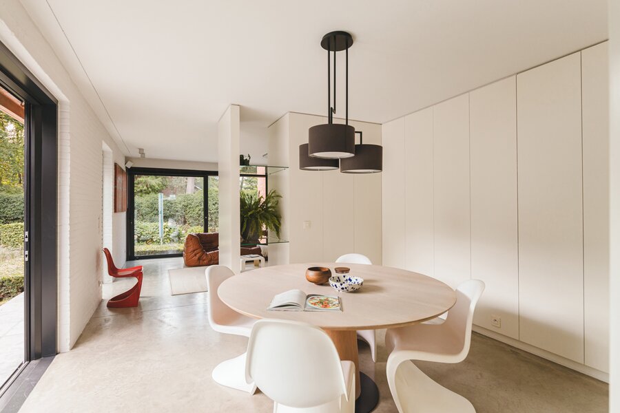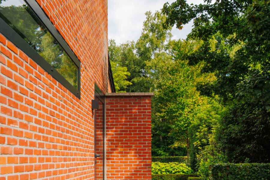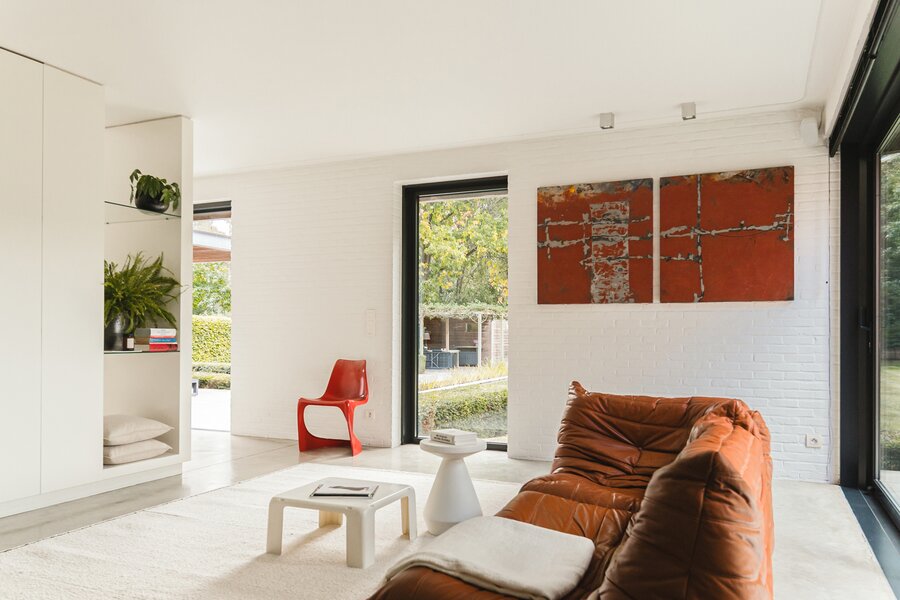 Le design épuré d'Albert Vanbelle, est renforcé par la façade en pierre rouge taillée à la machine. Les propriétaires ont acheté cette villa sur un terrain de 4042 m2 en 2003 au constructeur d'origine. Les murs intérieurs en pierre de taille blanche donnent un aspect brutal. Après la rénovation, les installations techniques ont été renouvelées et l'enveloppe du bâtiment a été isolée au maximum, tandis que le caractère architectural a été préservé de manière optimale. Nouveautés : sol en béton coulé avec chauffage par le sol au rez-de-chaussée.
