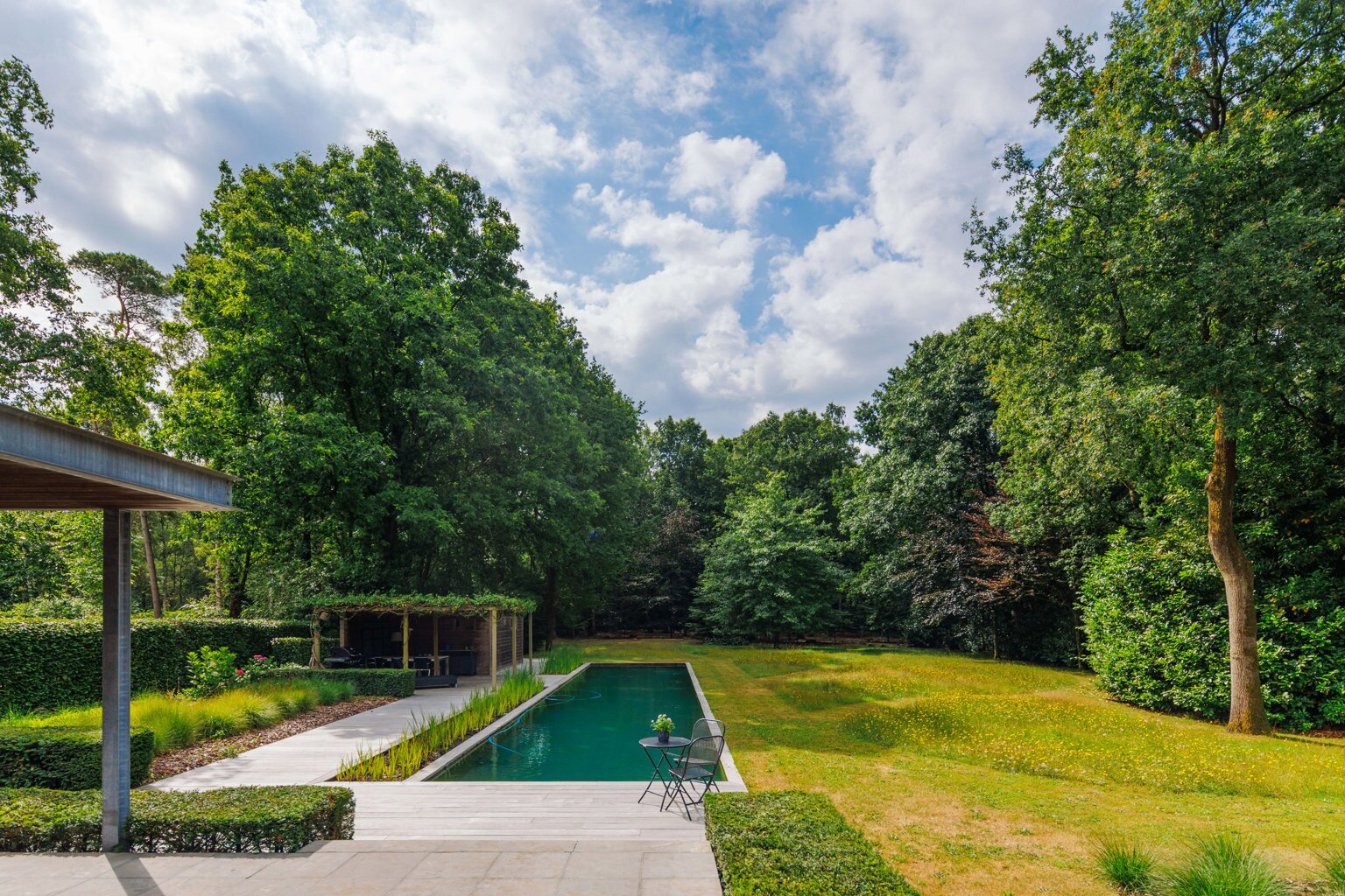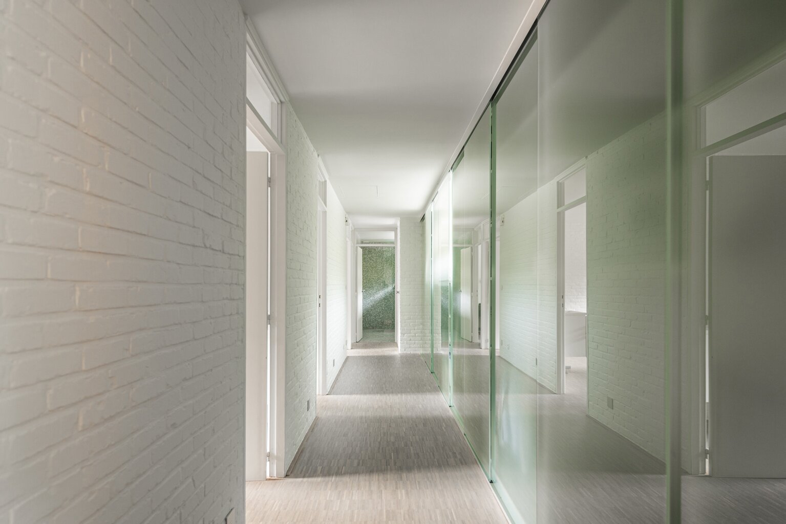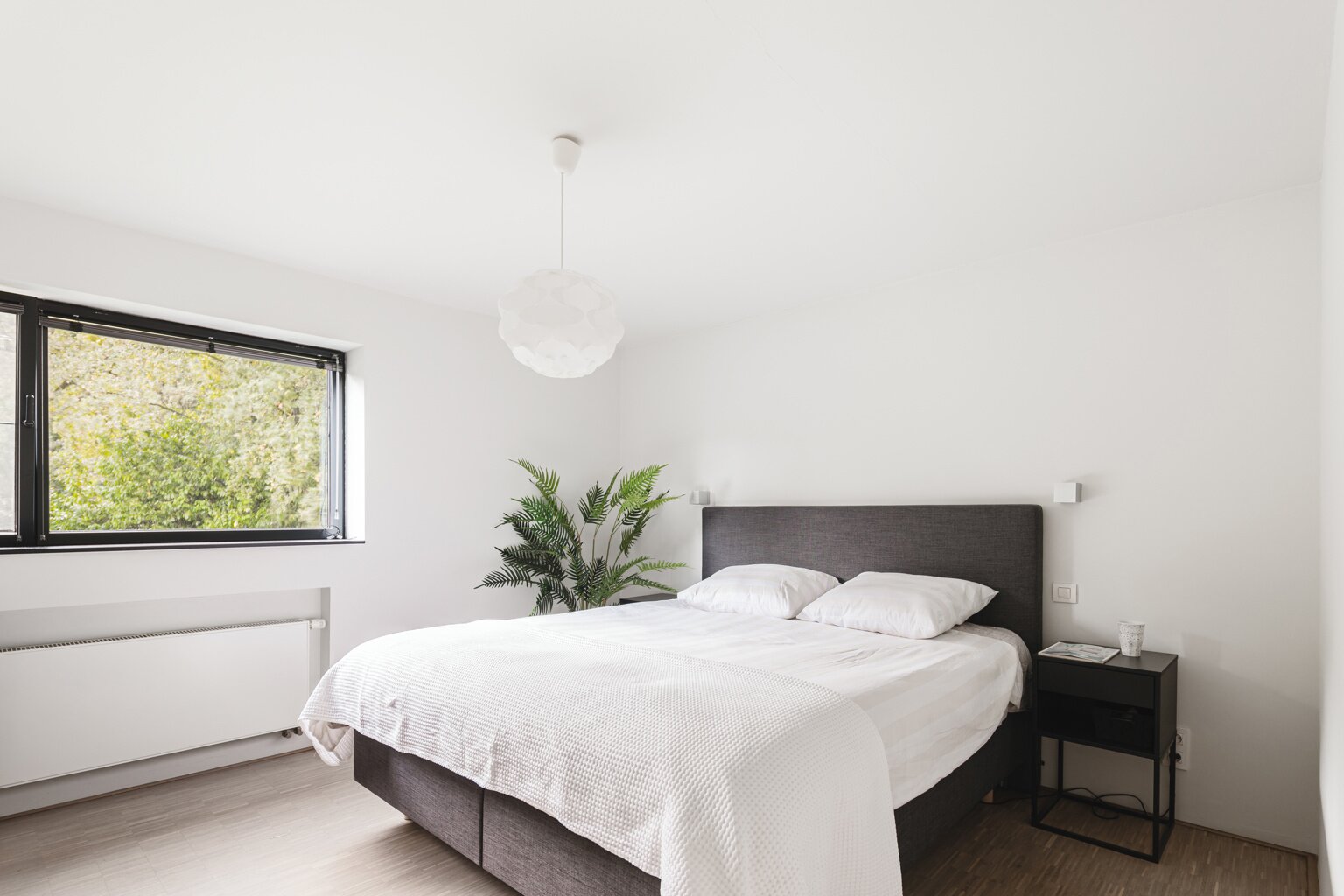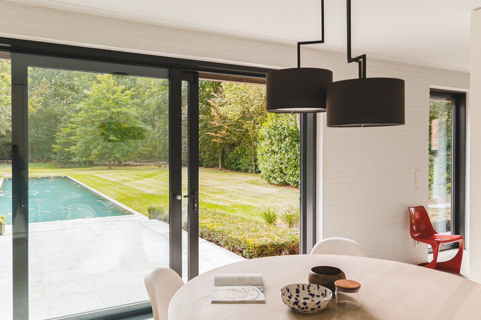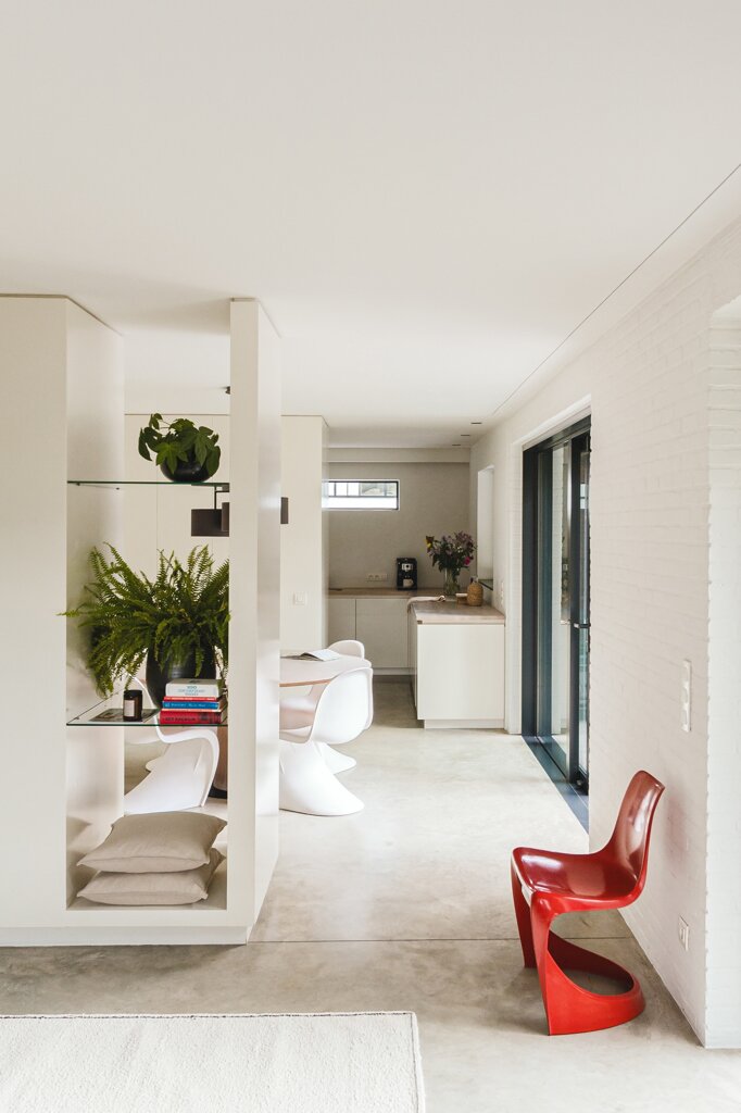 Le design épuré d'Albert Vanbelle, est renforcé par la façade en pierre rouge taillée à la machine. Les propriétaires ont acheté cette villa sur un terrain de 4042 m2 en 2003 au constructeur d'origine. Les murs intérieurs en pierre de taille blanche donnent un aspect brutal. Après la rénovation, les installations techniques ont été renouvelées et l'enveloppe du bâtiment a été isolée au maximum, tandis que le caractère architectural a été préservé de manière optimale. Nouveautés : sol en béton coulé avec chauffage par le sol au rez-de-chaussée.